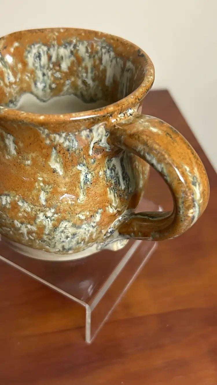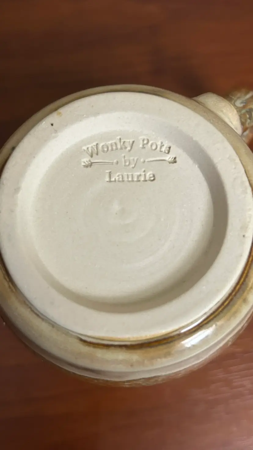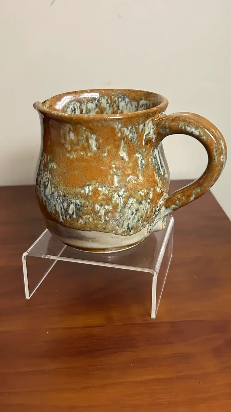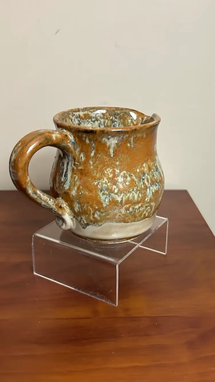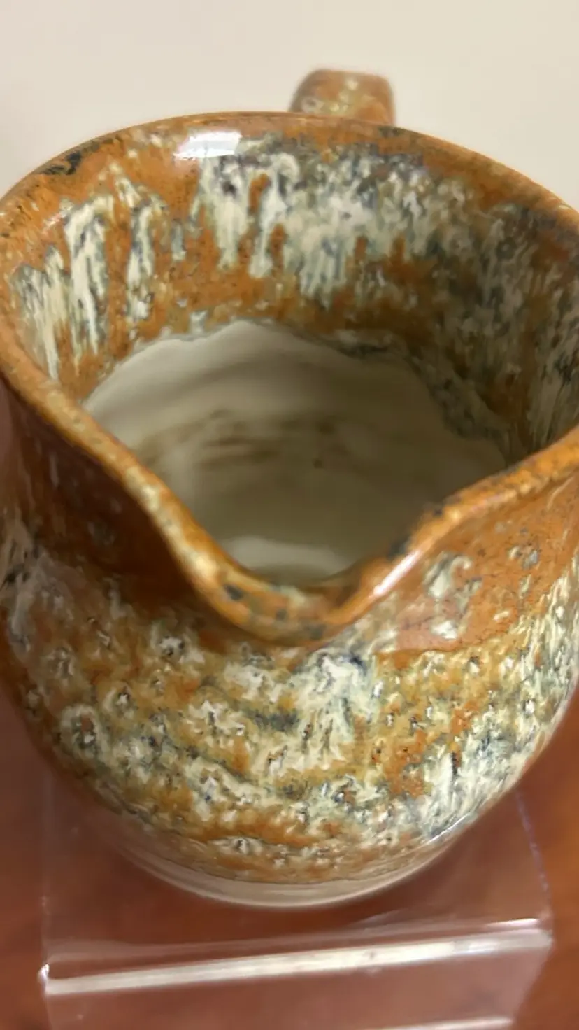 This is a small studio pottery creamer or pitcher featuring a distinctive orange rust blue/white drip glaze. The piece is hand-thrown with a rounded body, a pronounced spout, and a sturdy handle. It was made by Wonky Potts by Laurie.