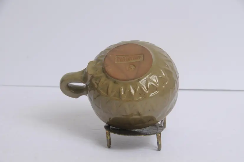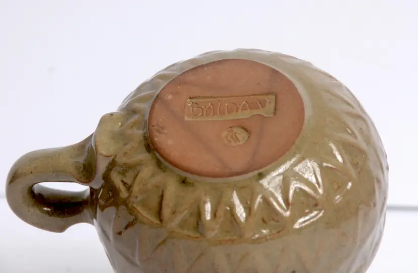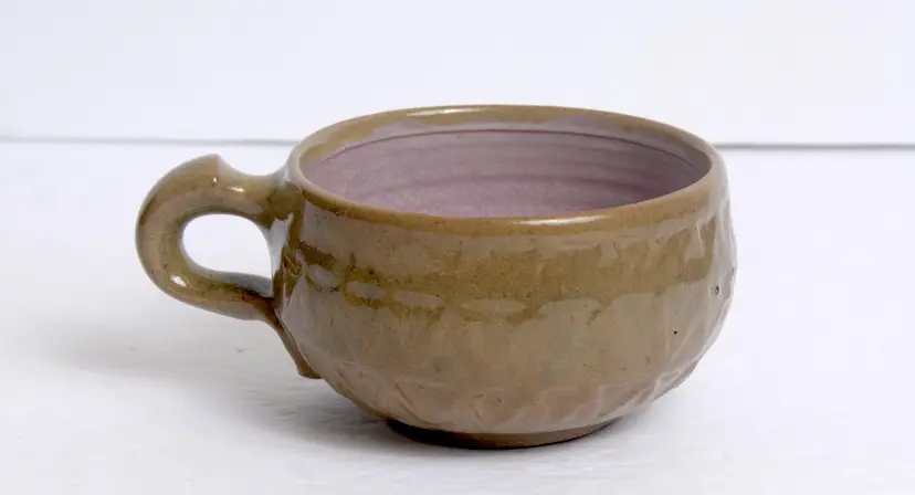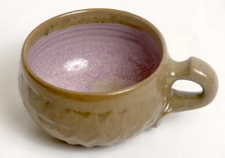This unique art pottery embossed clay mug is stamped Balda V on the bottom. The interior is glazed in an iridescent purple/pink color. The potter's initials are stamped on the bottom.