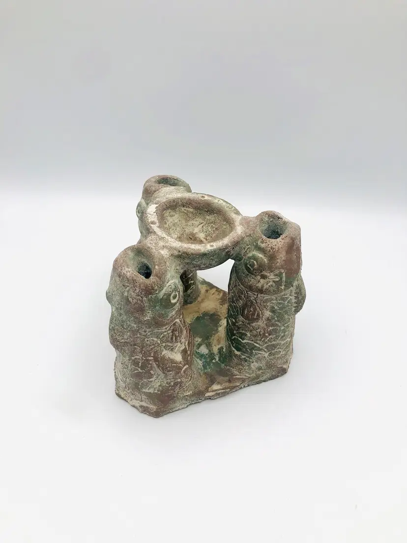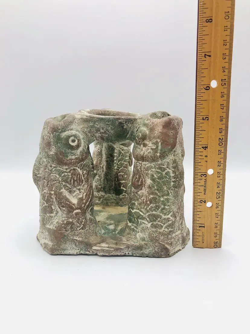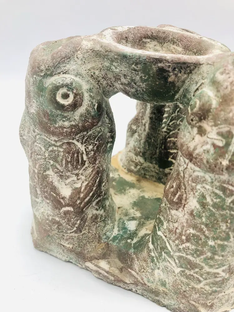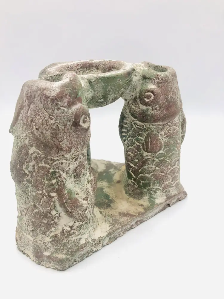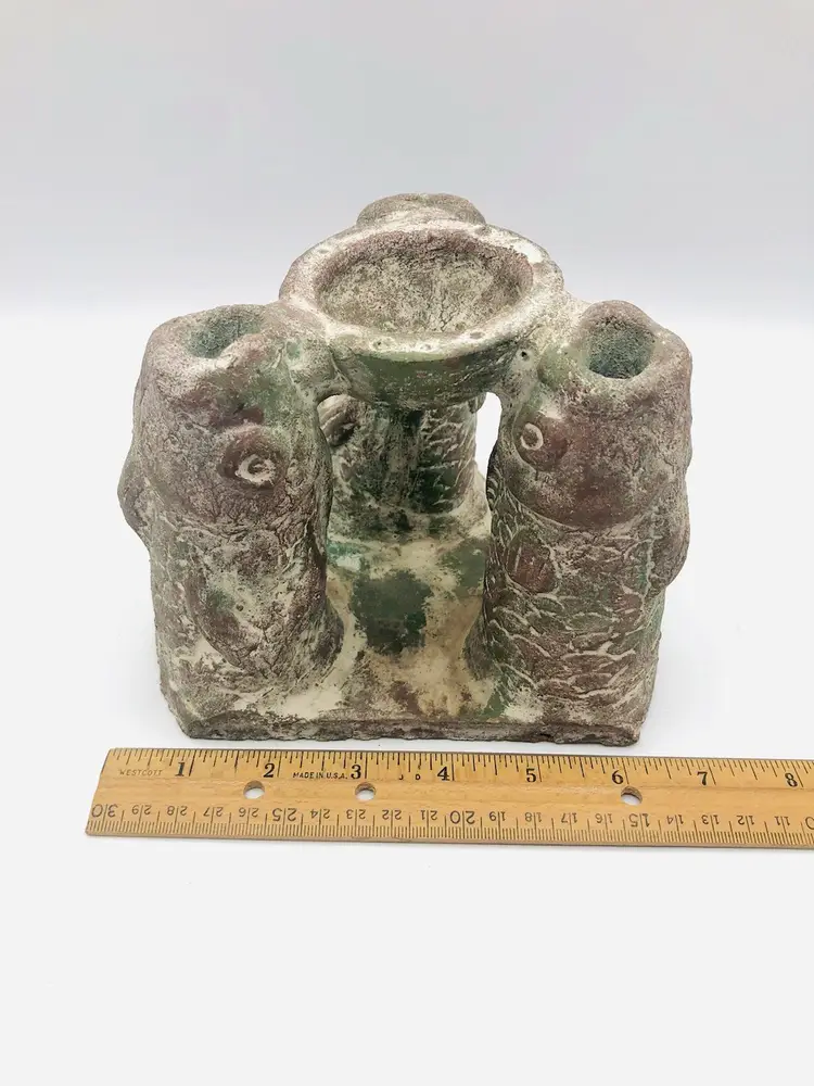 Here we have an art pottery figurine vase of three koi fish standing open mouthed supporting a 2.75” bowl for wax melts. This is a handmade weirdo piece made of brown clay that has a tint of white-green patina. No markings or signatures that I can find.