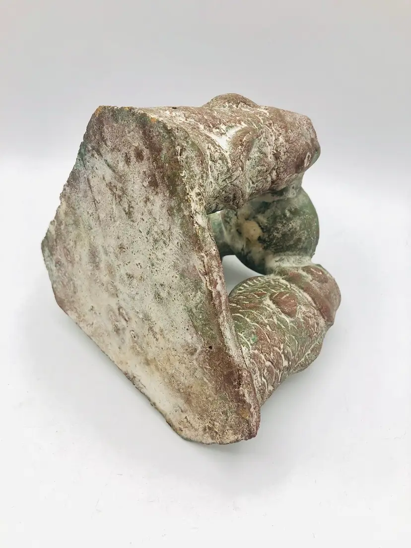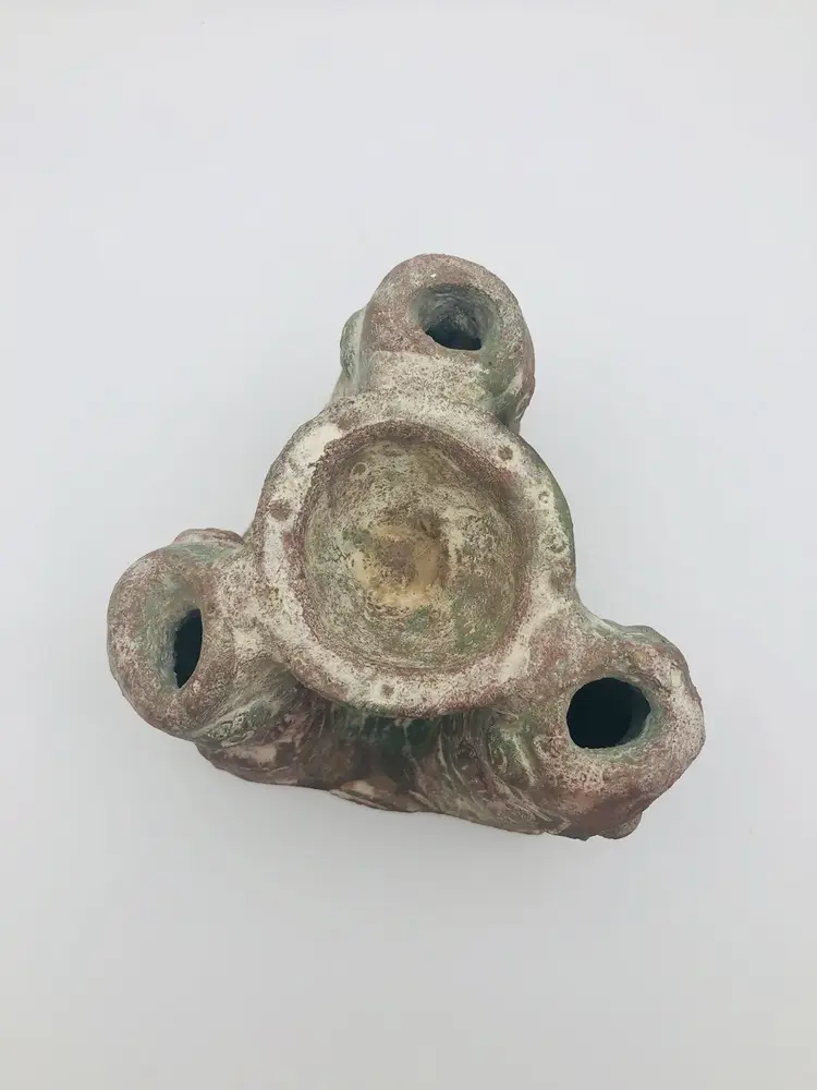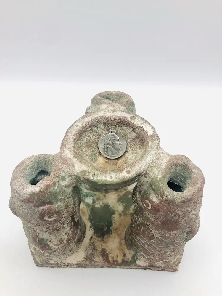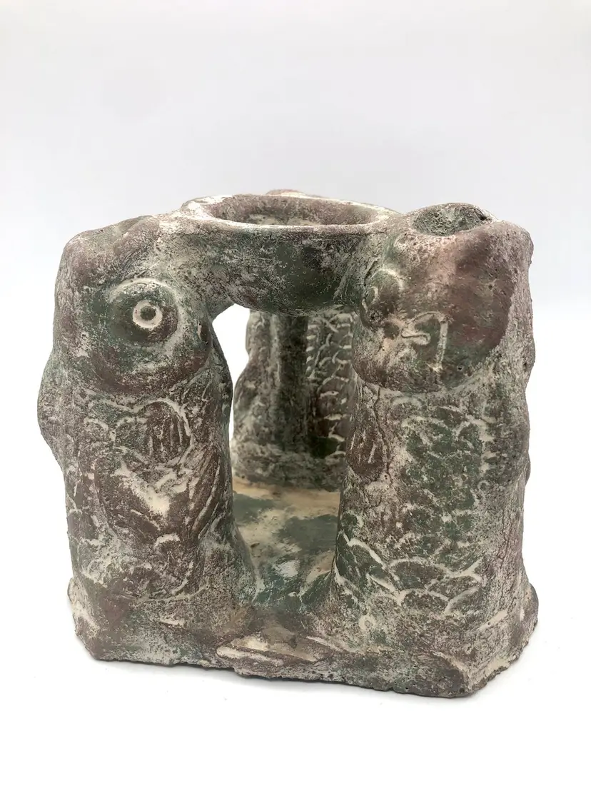Here we have an art pottery figurine vase of three koi fish standing open mouthed supporting a 2.75” bowl for wax melts. This is a handmade weirdo piece made of brown clay that has a tint of white-green patina. No markings or signatures that I can find.