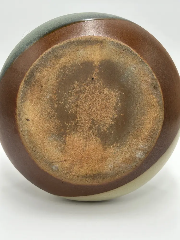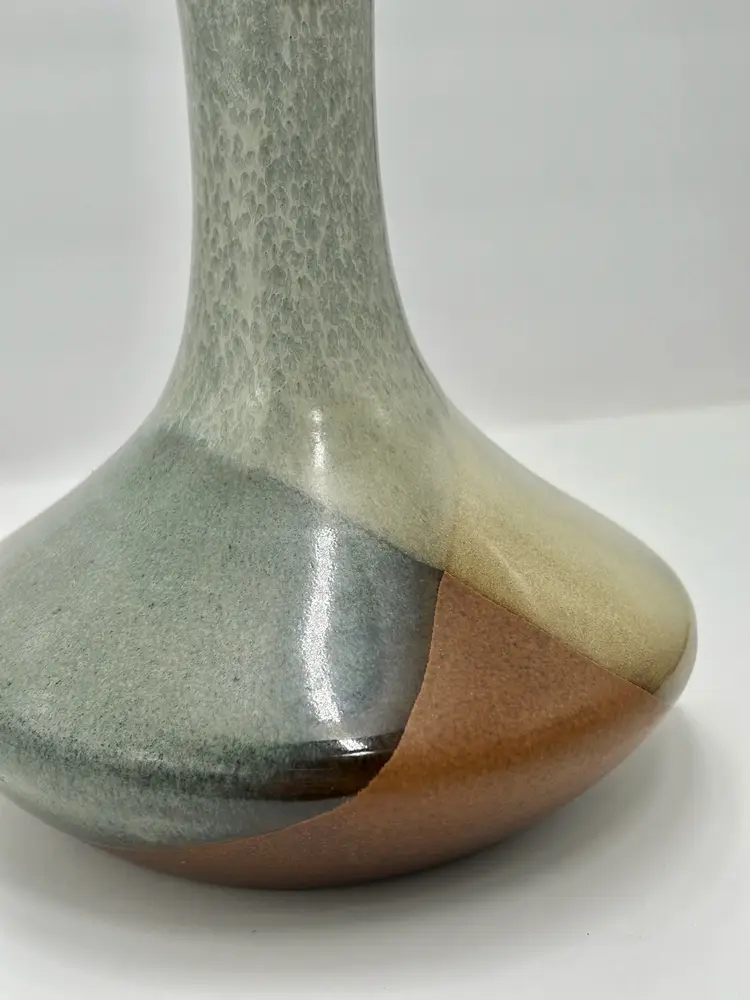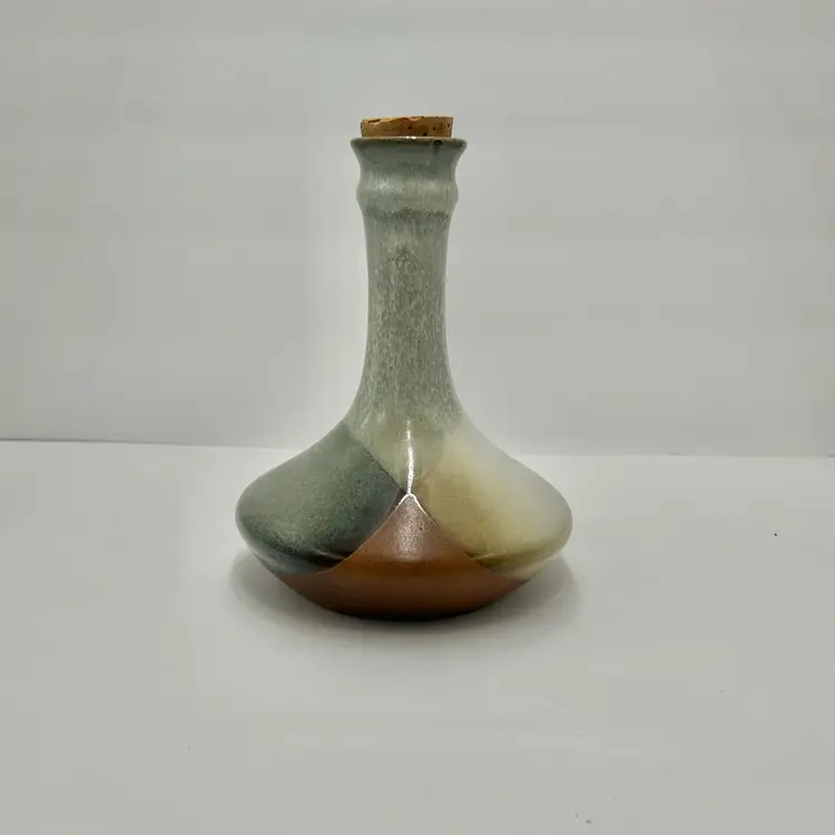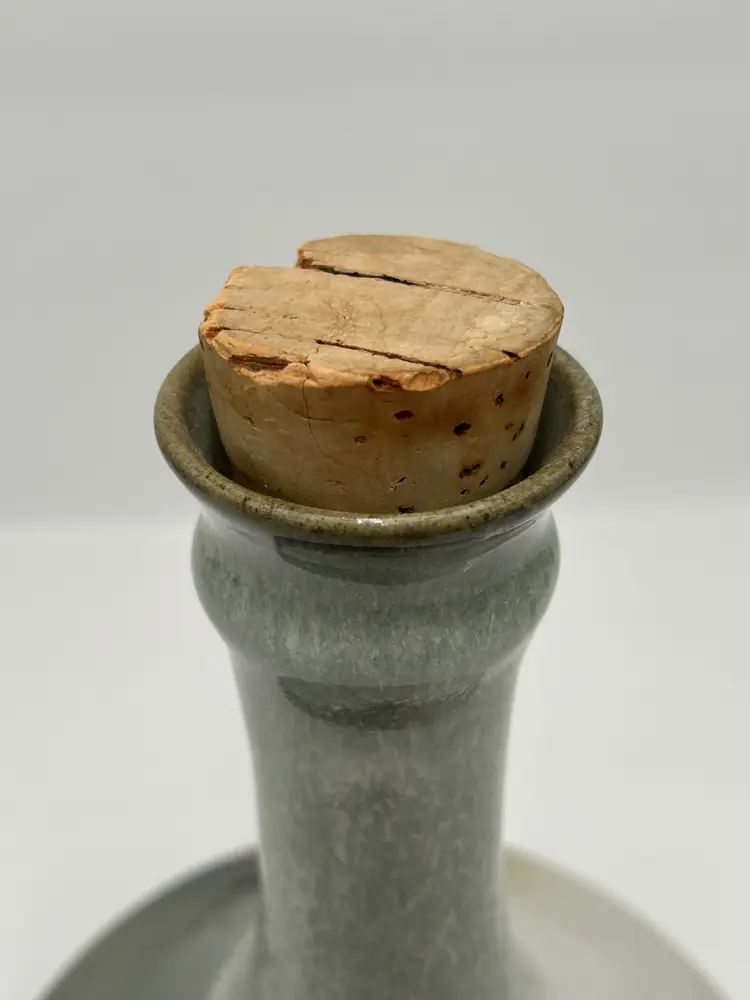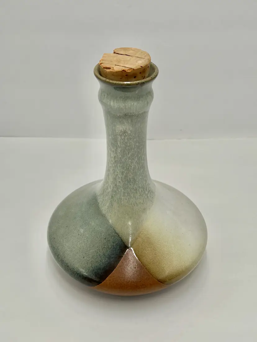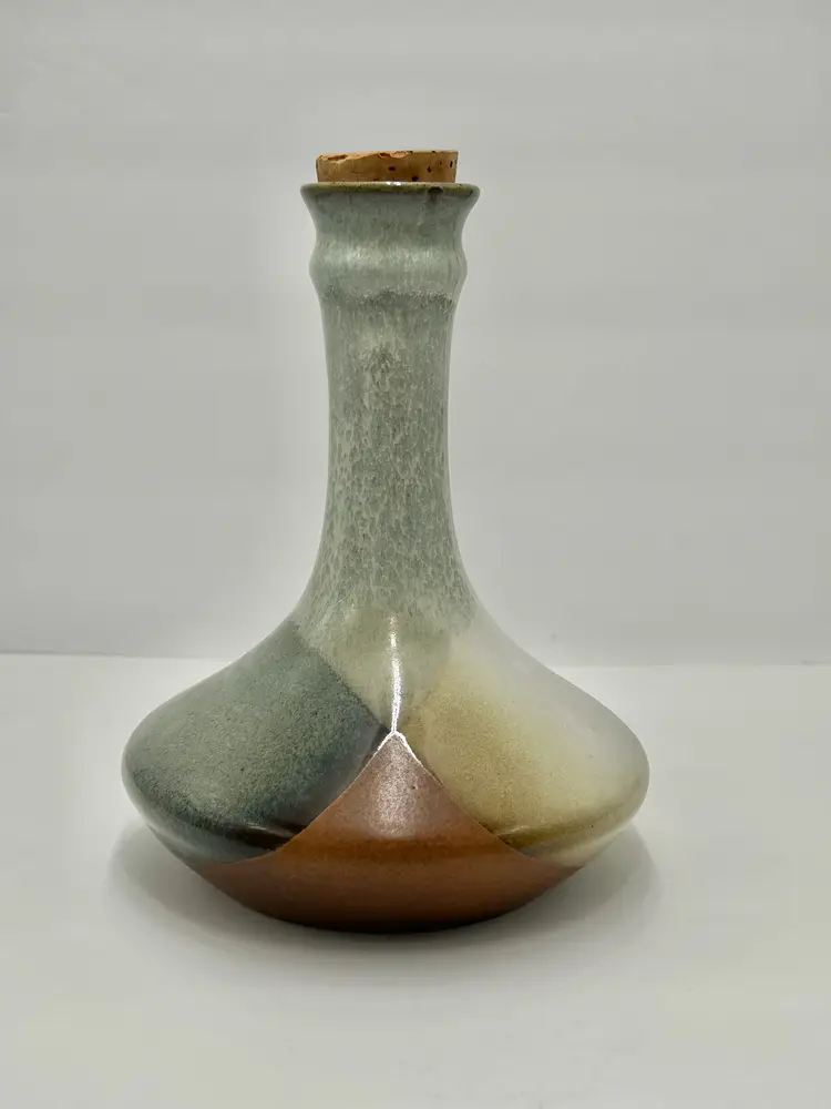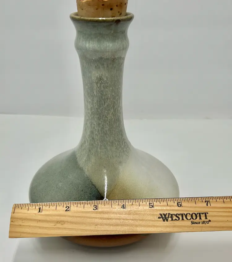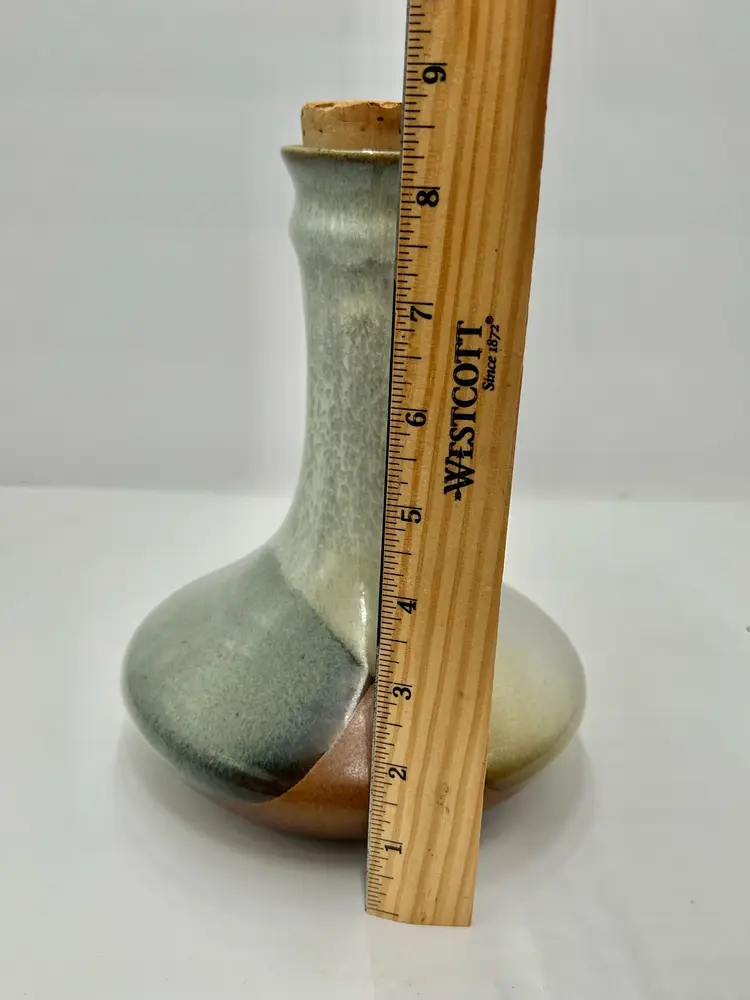 This is a very cool mid century art pottery decanter that from all indications may be another Robert Maxwell Pottery Craft piece. The decanter is shades of gray, brown, and black with a light speckle glaze. The cork appears to be the original, but please know that it is older and a bit dried out. The decanter itself is about 8 1/4 inches tall without the cork and about 6 inches wide at the bottom. There are no chips or cracks.