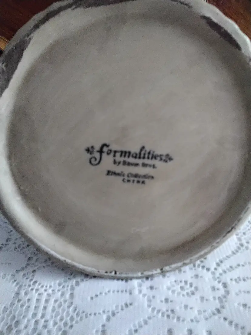 Baun Bros. Formalities Art Pottery Vase Native American Indian Tee Pee Style Vase. Made in China. Has a ribbed bottom with dancing horses and people on the vase. Colors are white, beige and brown. Vase is 6.5 inches wide at bottom and 8.3 inches tall. It is in good condition with no chips or cracks. Photos are part of the description. Has writing on bottom.