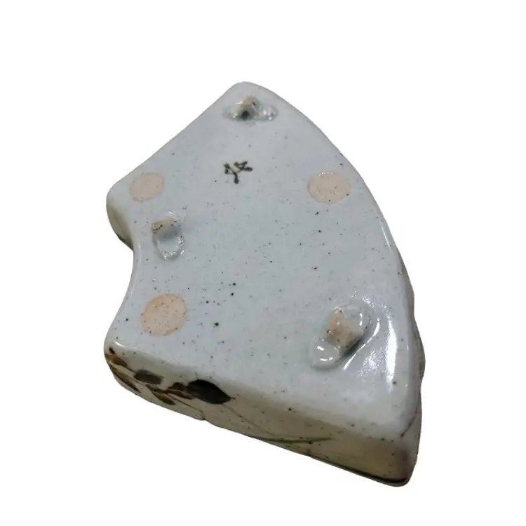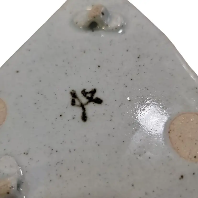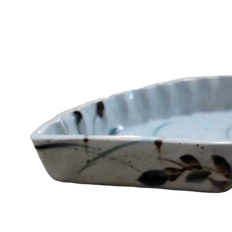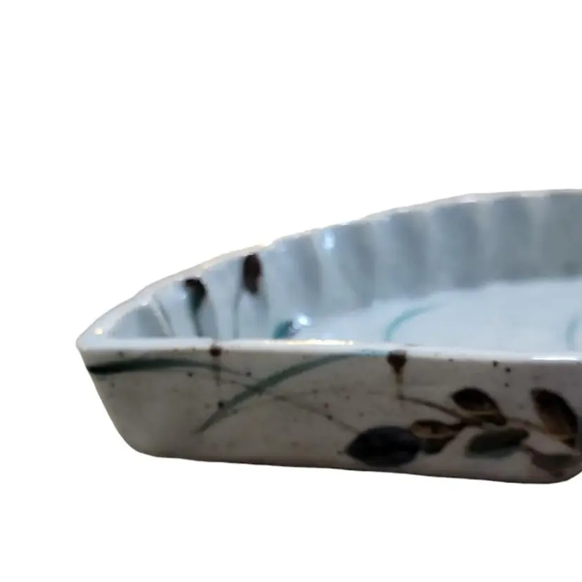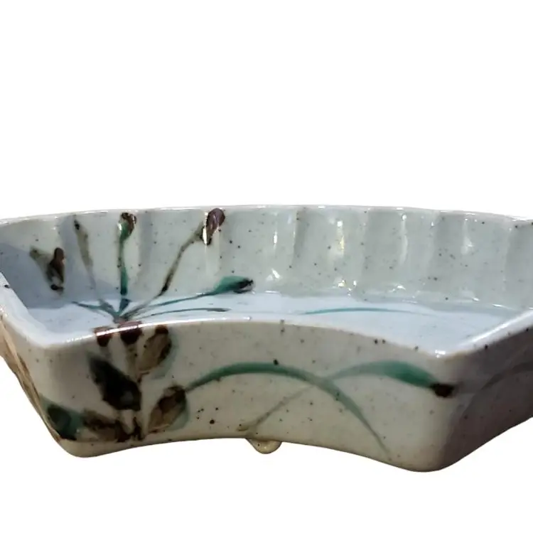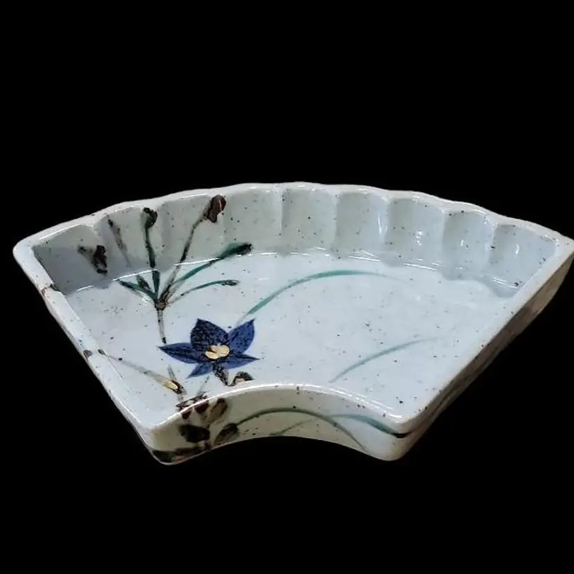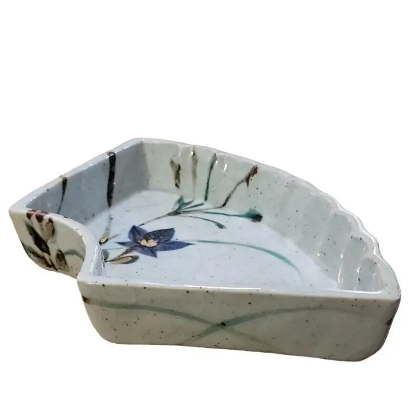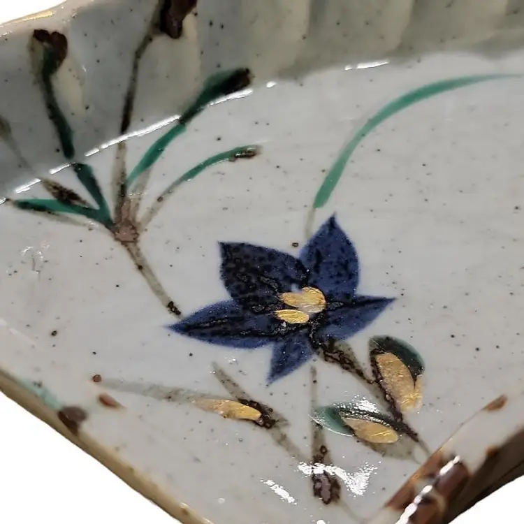This is a lovely serving dish or trinket tray hand painted in a Japanese style and signed. It is about 6 1/2" long and 5" wide with a height of 1 1/2", including the 1/4" height added by the three footed stand at the bottom. The blue flower with gilt or gold paint accents makes the piece! It weighs 14.7 ounces before protective packaging.