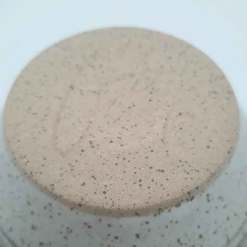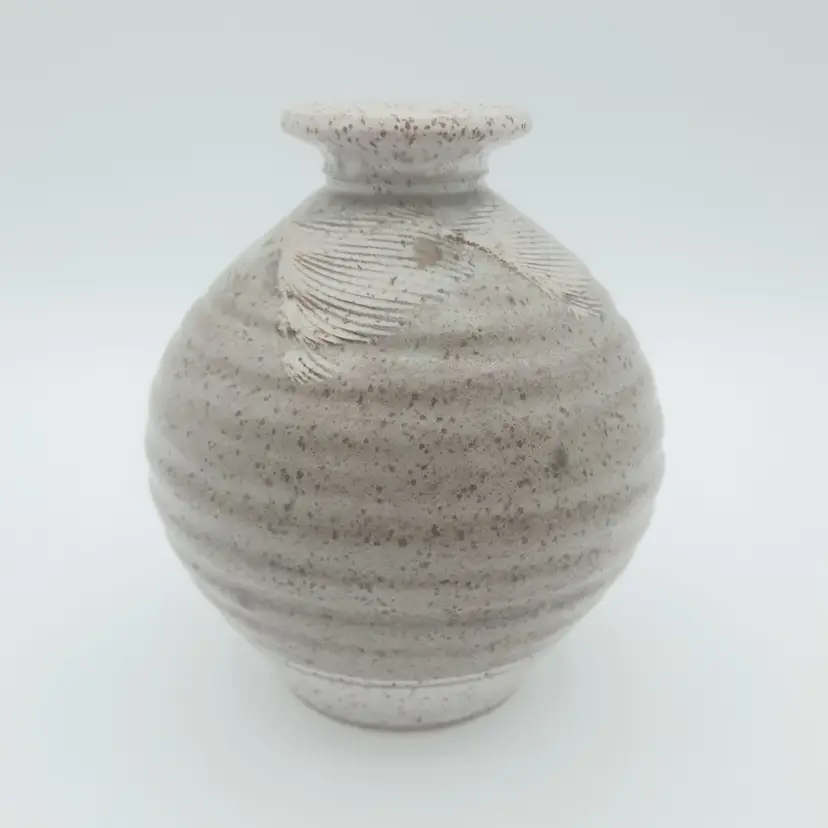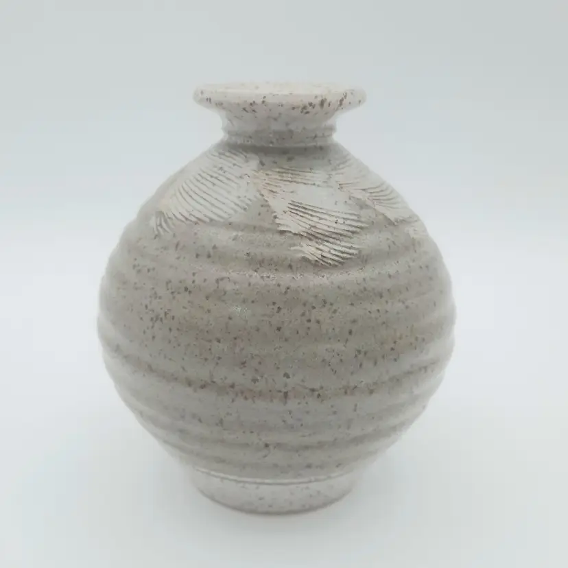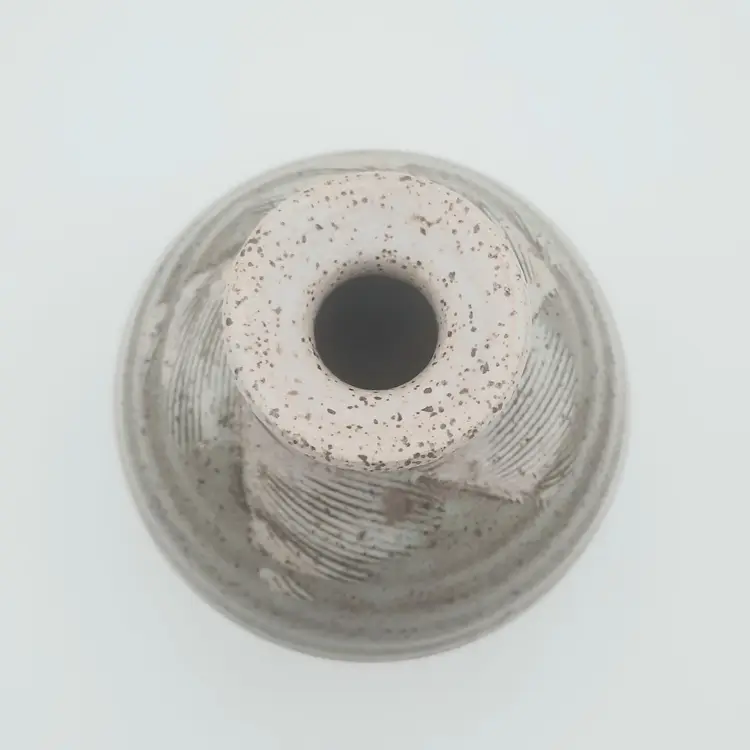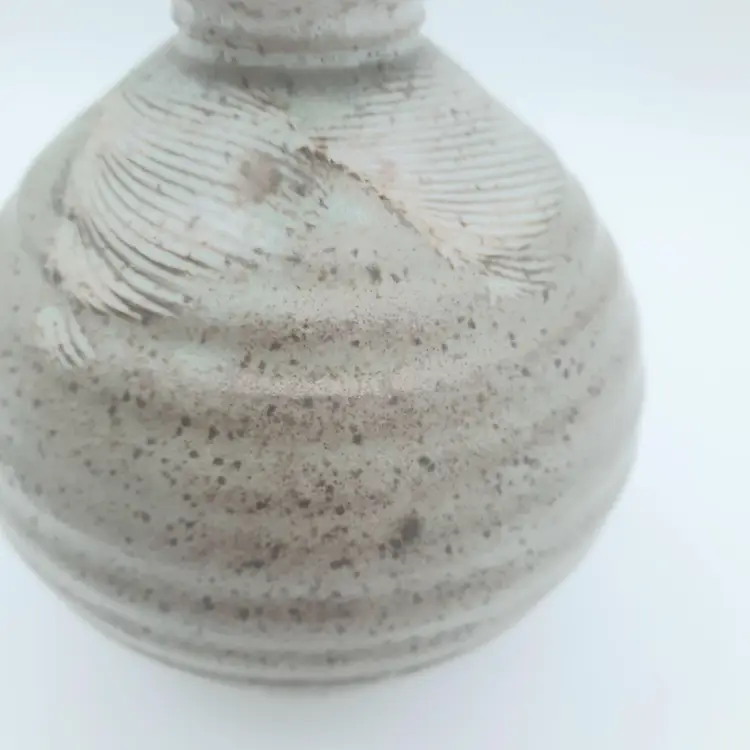 Unique vase is a greenish gray around middle with light gray around base and mouth, textured line design around neck, 5"H x 4"W, can't make out signature looks like '90 is the date, great condition with a few design imperfections.