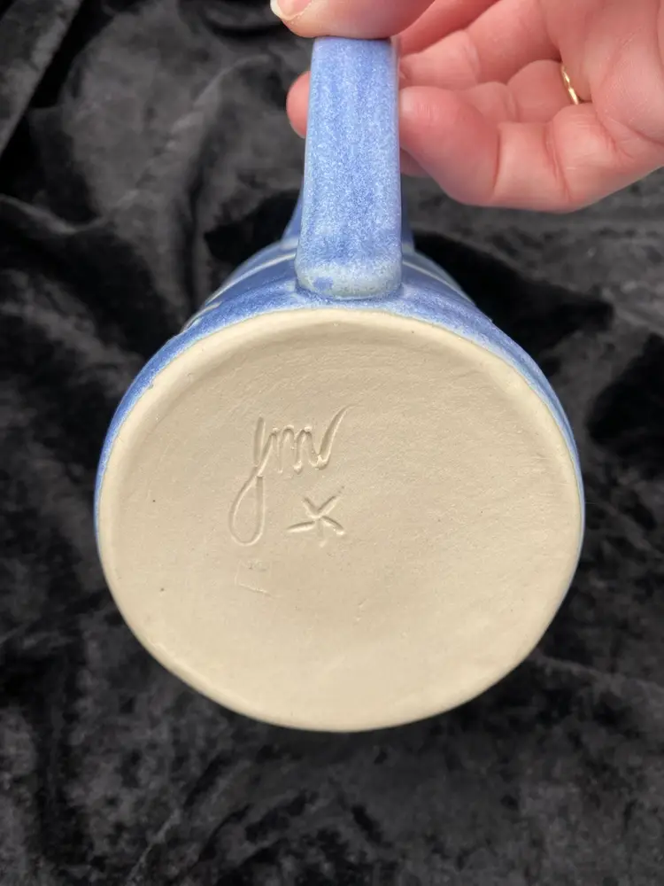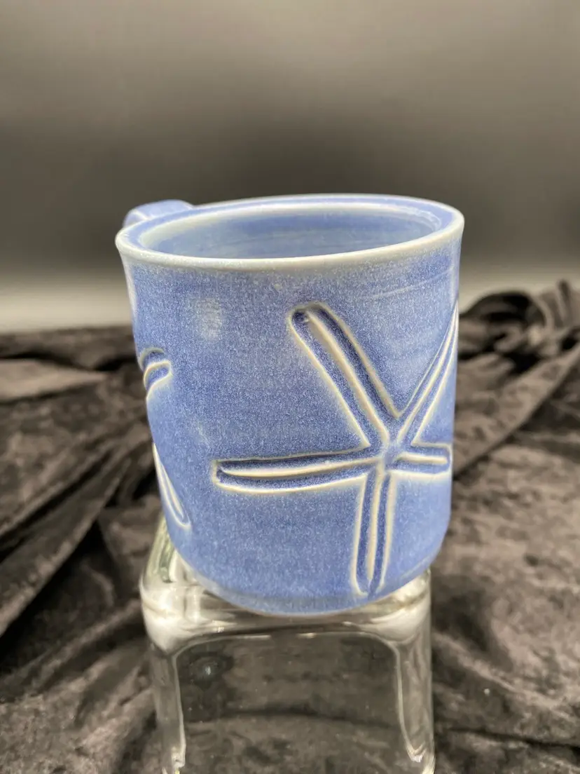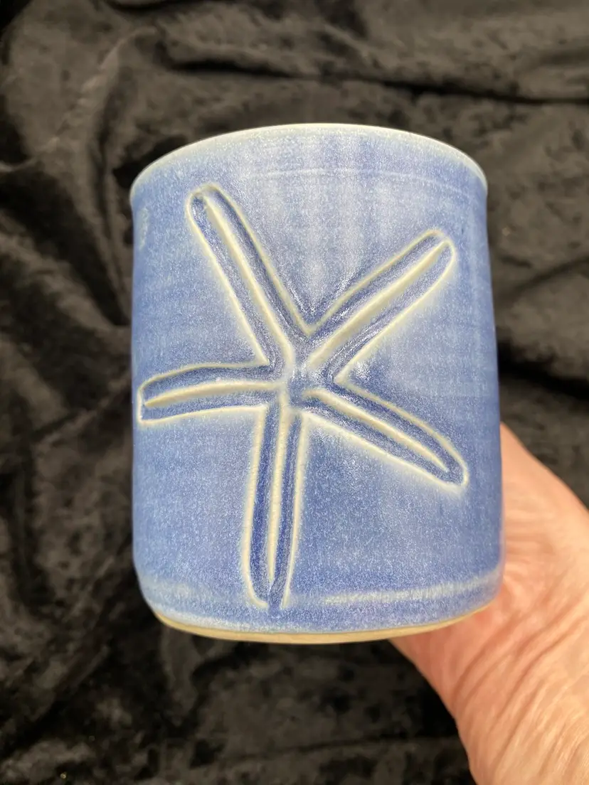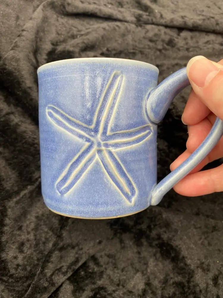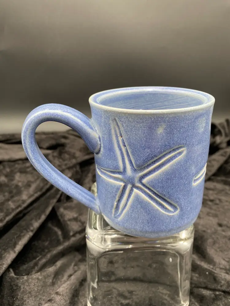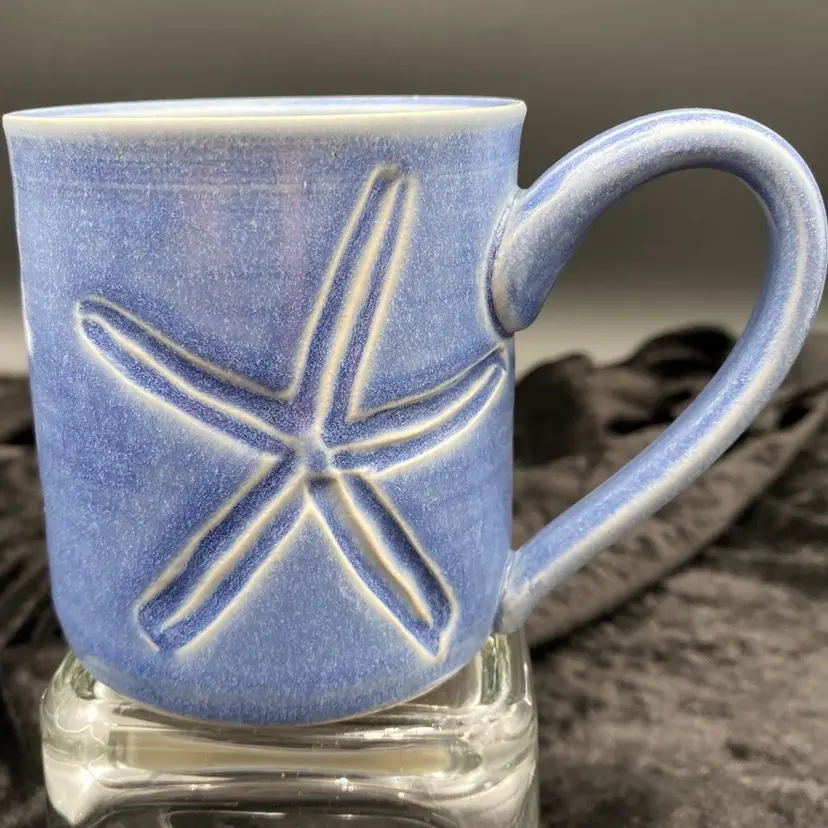 This unique mug features a beautiful starfish design, handcrafted by a talented artist. The round shape and matte finish make it a perfect addition to any decorative collection. With a capacity of 6 ounces and a height of 3.5 inches, it's perfect for enjoying your favorite beverage. The mug is made of high-quality stoneware, and the incised design adds a touch of elegance. It's an original piece, with an impressed signature and starfish backstamp. The mug weighs 13.5 ounces and has a diameter of 3.2 inches. Whether you're looking for a unique gift or simply adding to your collection, this art pottery mug is a lovely option!