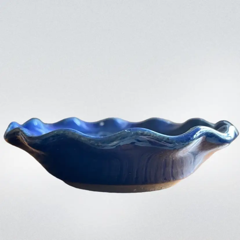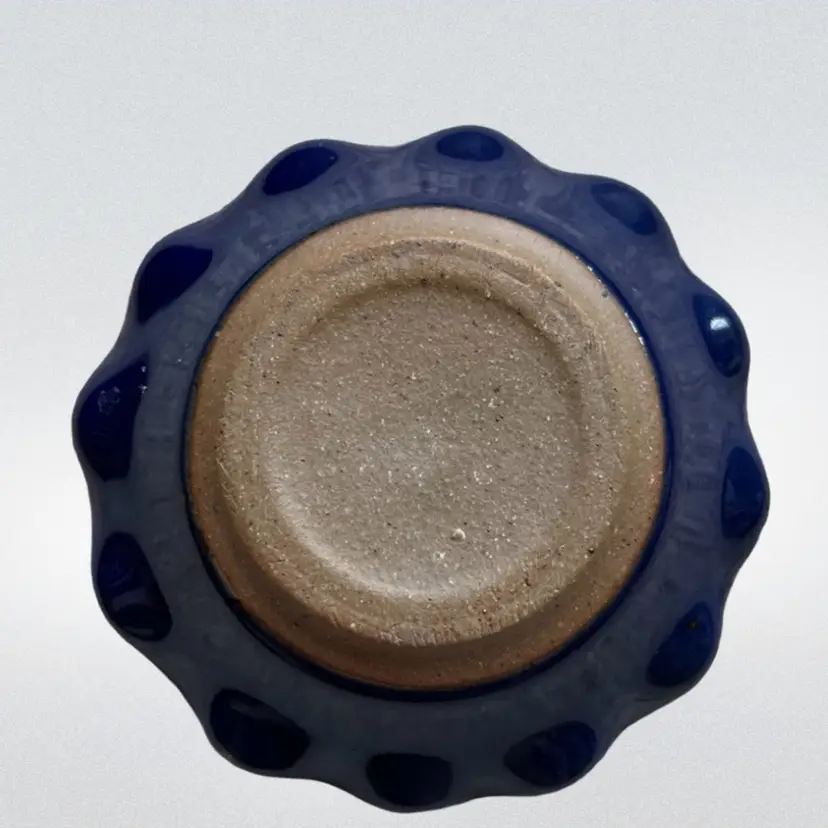 Beautiful blue art pottery with crushed glass bottom. Good condition with no chips or cracks. Unmarked. 3 1/2” diameter