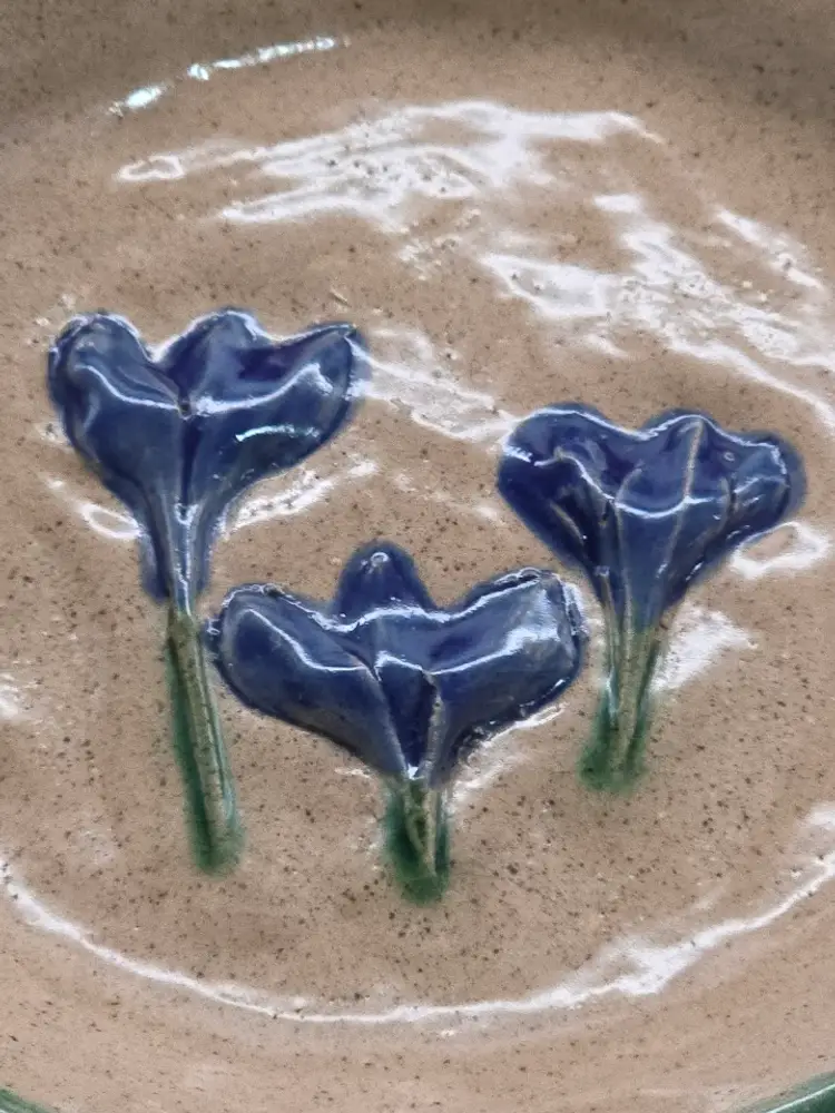 Lovely little art pottery trinket dish with raised relief crocus blossoms on the front and a pressed lace pattern on the back.