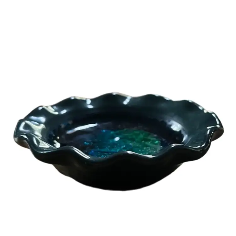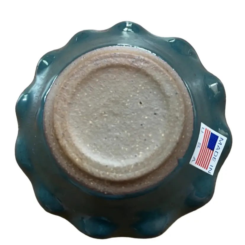 Beautiful teal glaze art pottery trinket jewelry ring dish with crushed glass bottom, 3 1/2” unmarked, has made in USA sticker. Good condition, no chips or cracks.