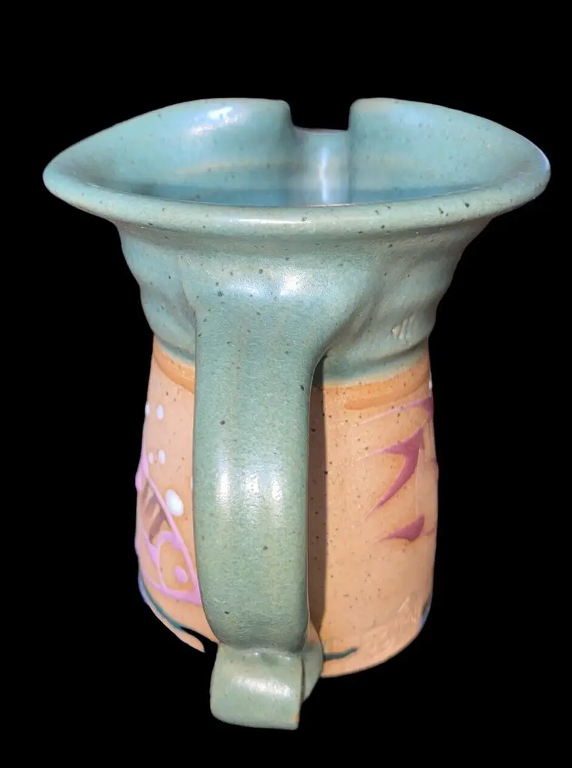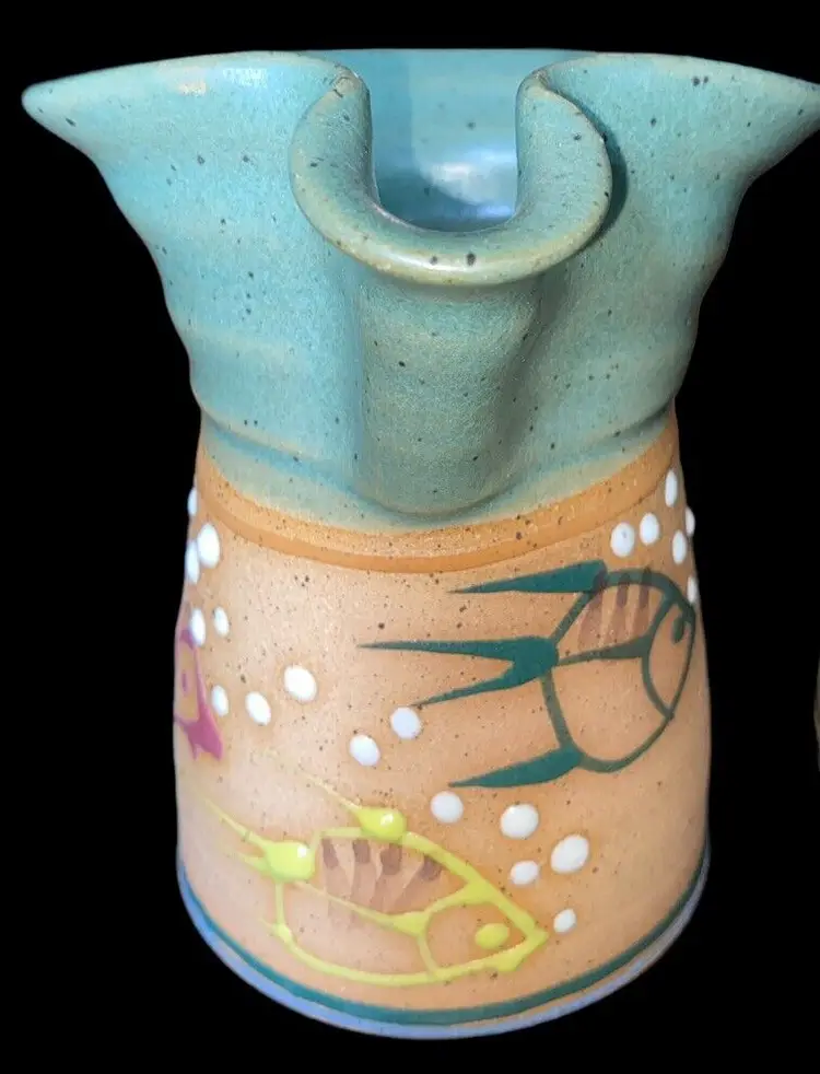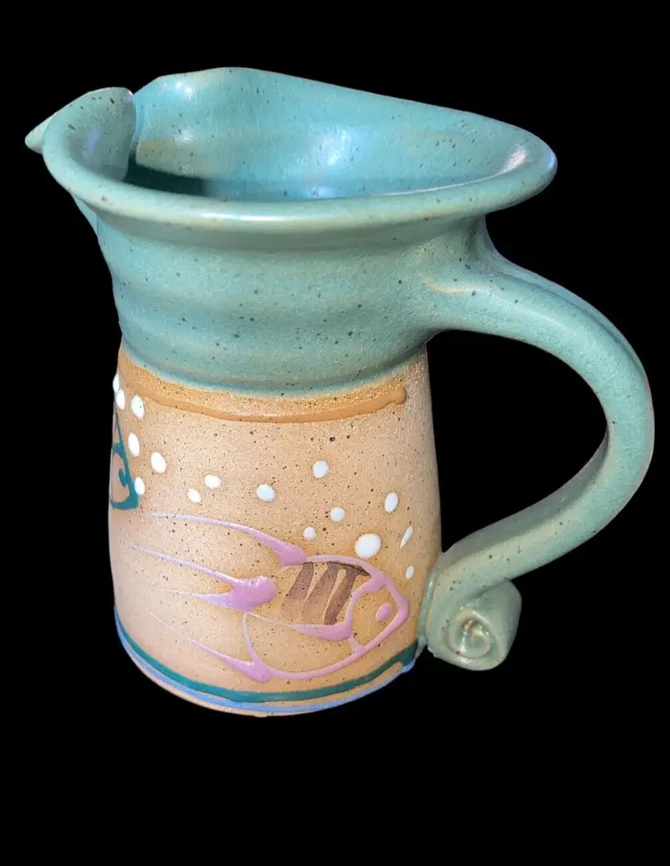 Brand: JB Pattern: Fish Type: Pitcher Original/Licensed Reproduction: Original Color: Multicolor Indoor/Outdoor: Indoor Item Height: 5” Production Style: Art Pottery Backstamp: Impressed Finish: Matte Subject: Tropical Fish Item Width: 5”