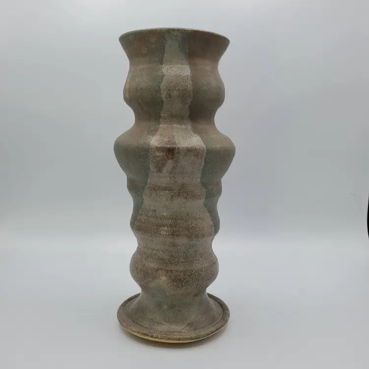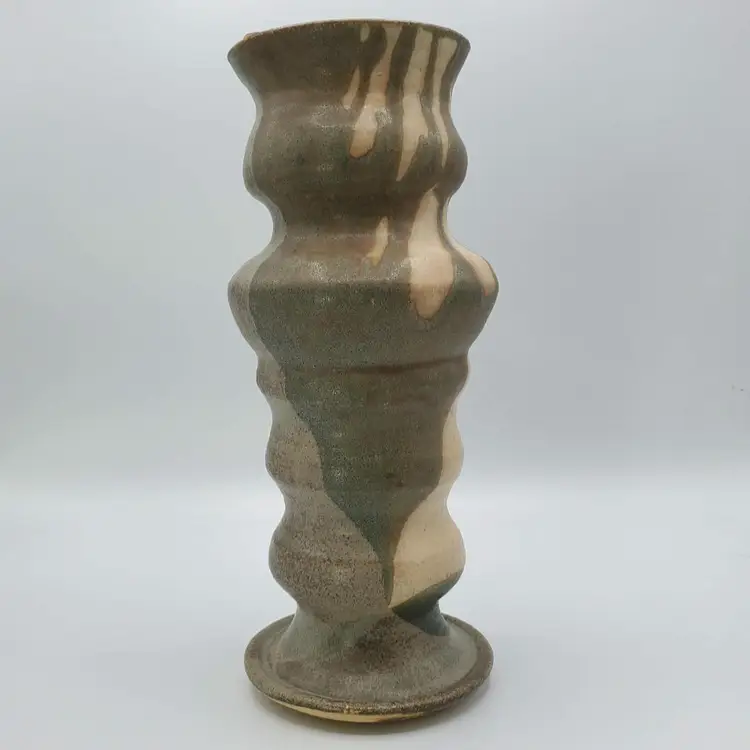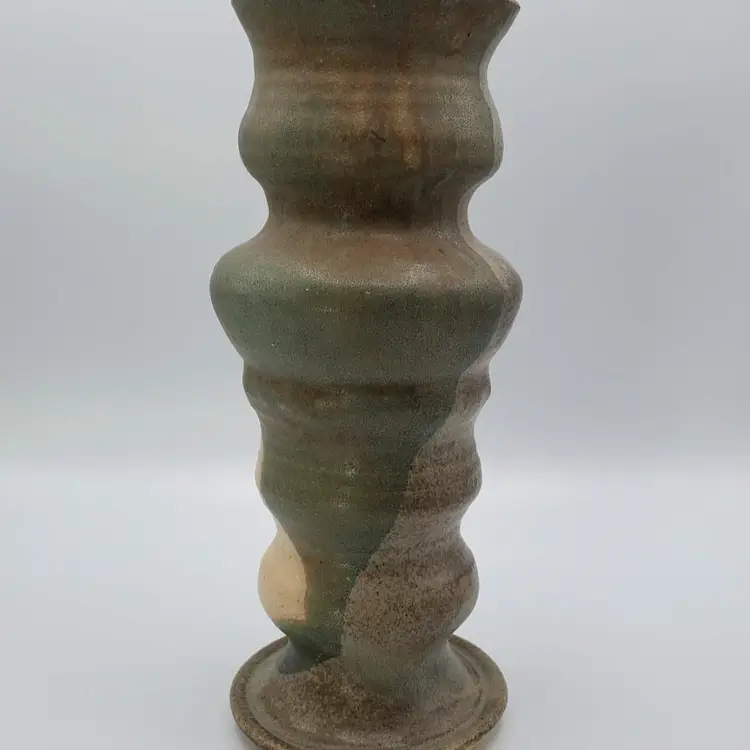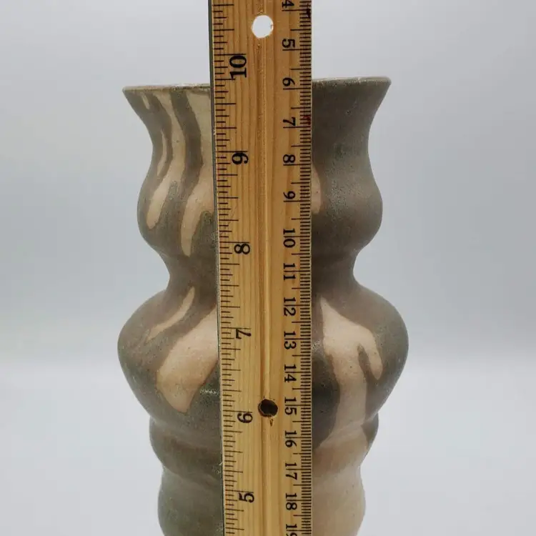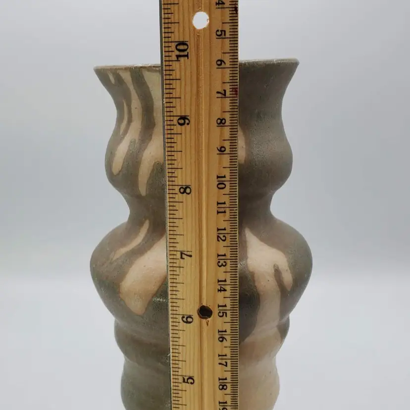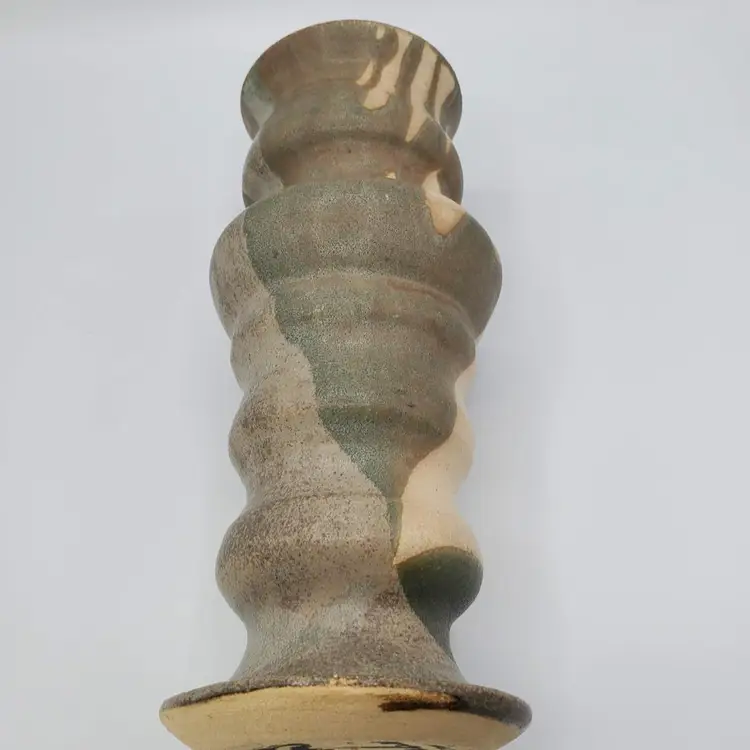 Uniquely gorgeous earth tone handmade studio art pottery vase stands approx 9 3/4" tall. Its colors are sage green, beige, gray and brown. Each side is different so you have a different look depending how its turned. It is signed by the artist. The vase weighs approx. 1 lb 15.4oz.