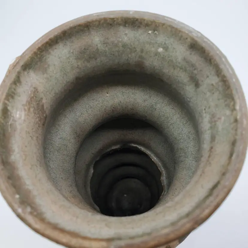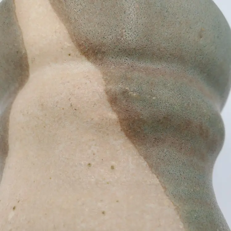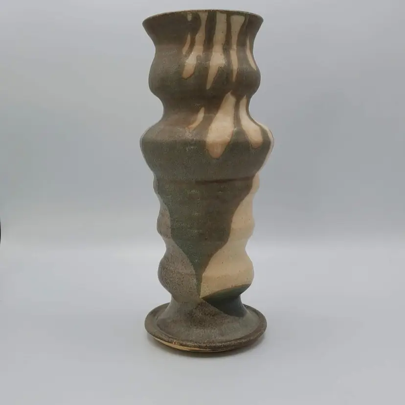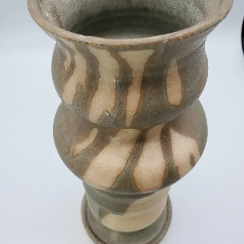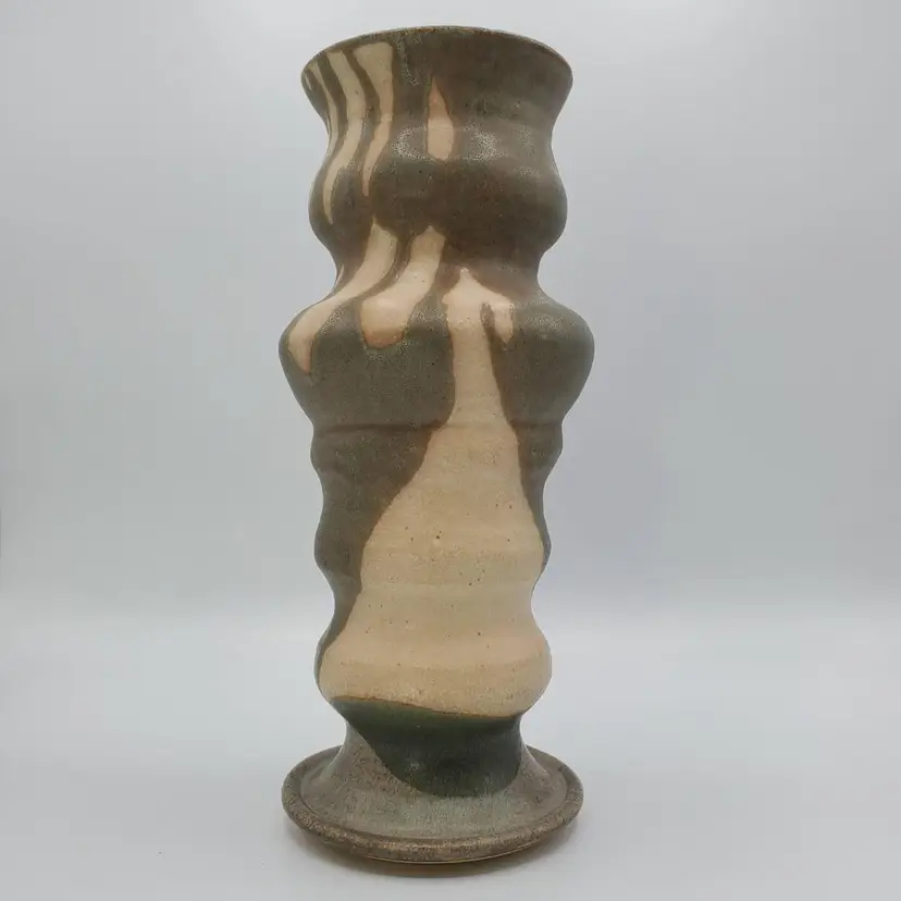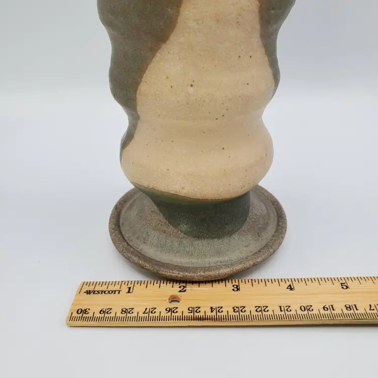 Uniquely gorgeous earth tone handmade studio art pottery vase stands approx 9 3/4" tall. Its colors are sage green, beige, gray and brown. Each side is different so you have a different look depending how its turned. It is signed by the artist. The vase weighs approx. 1 lb 15.4oz.