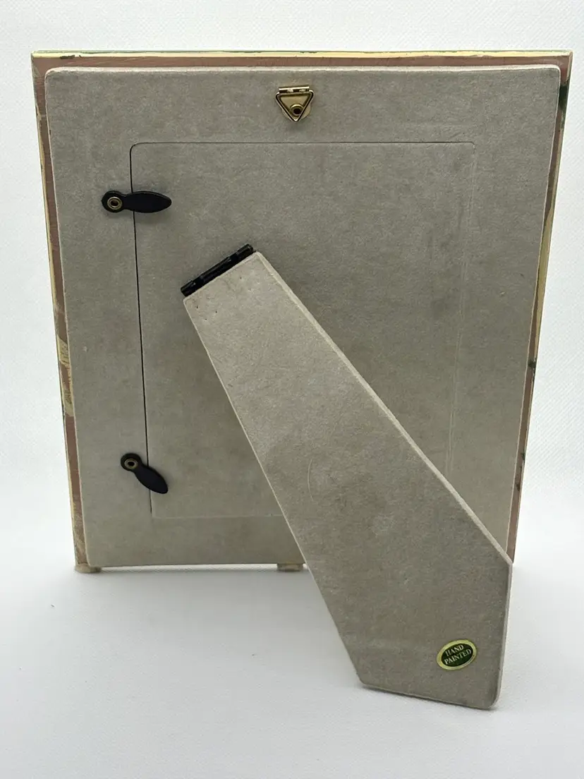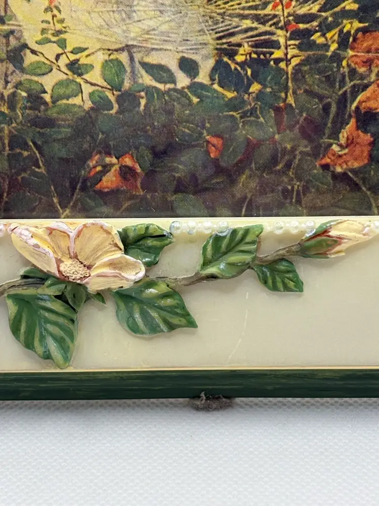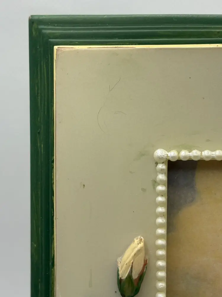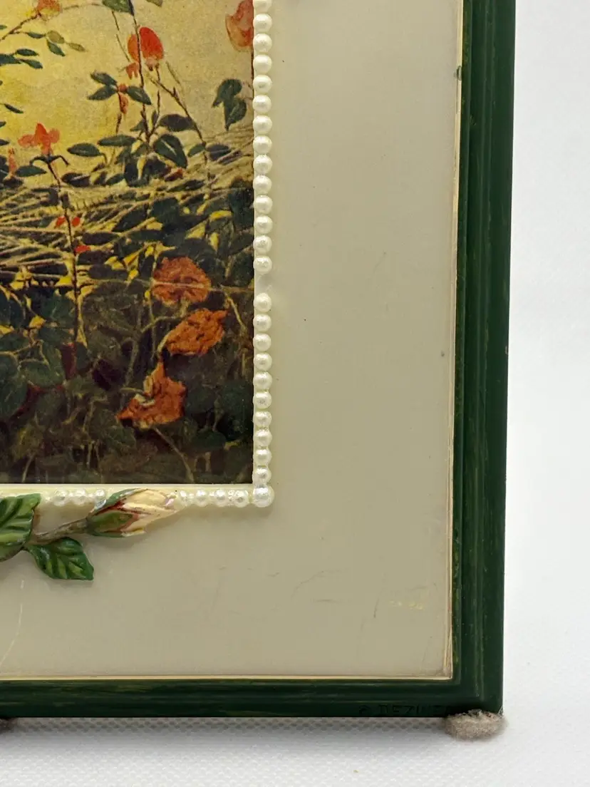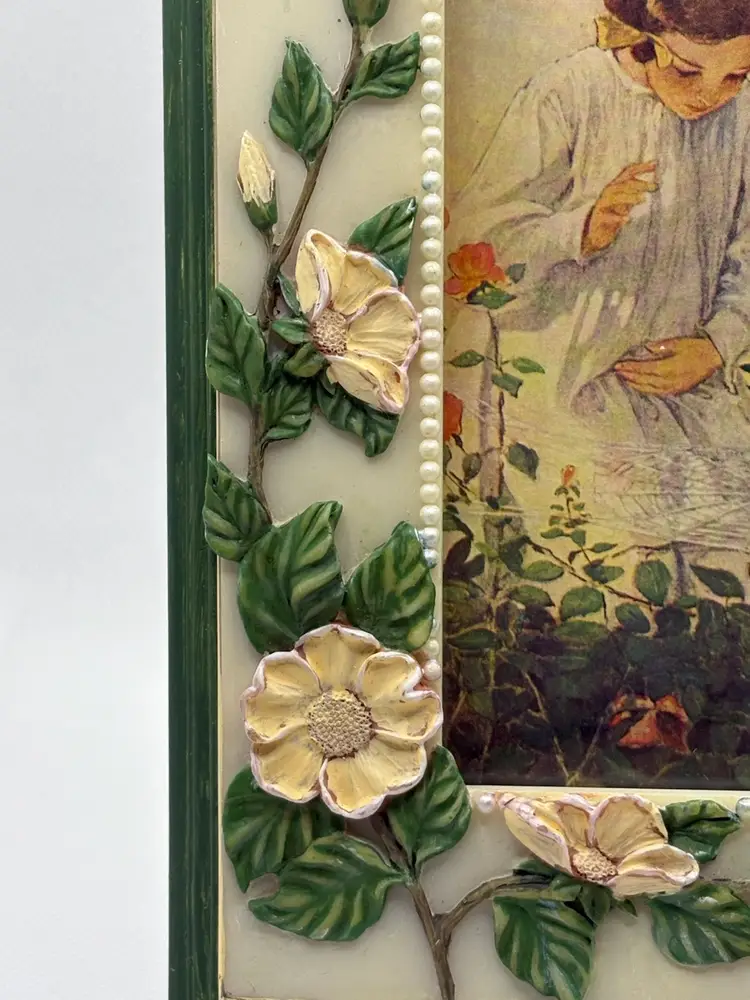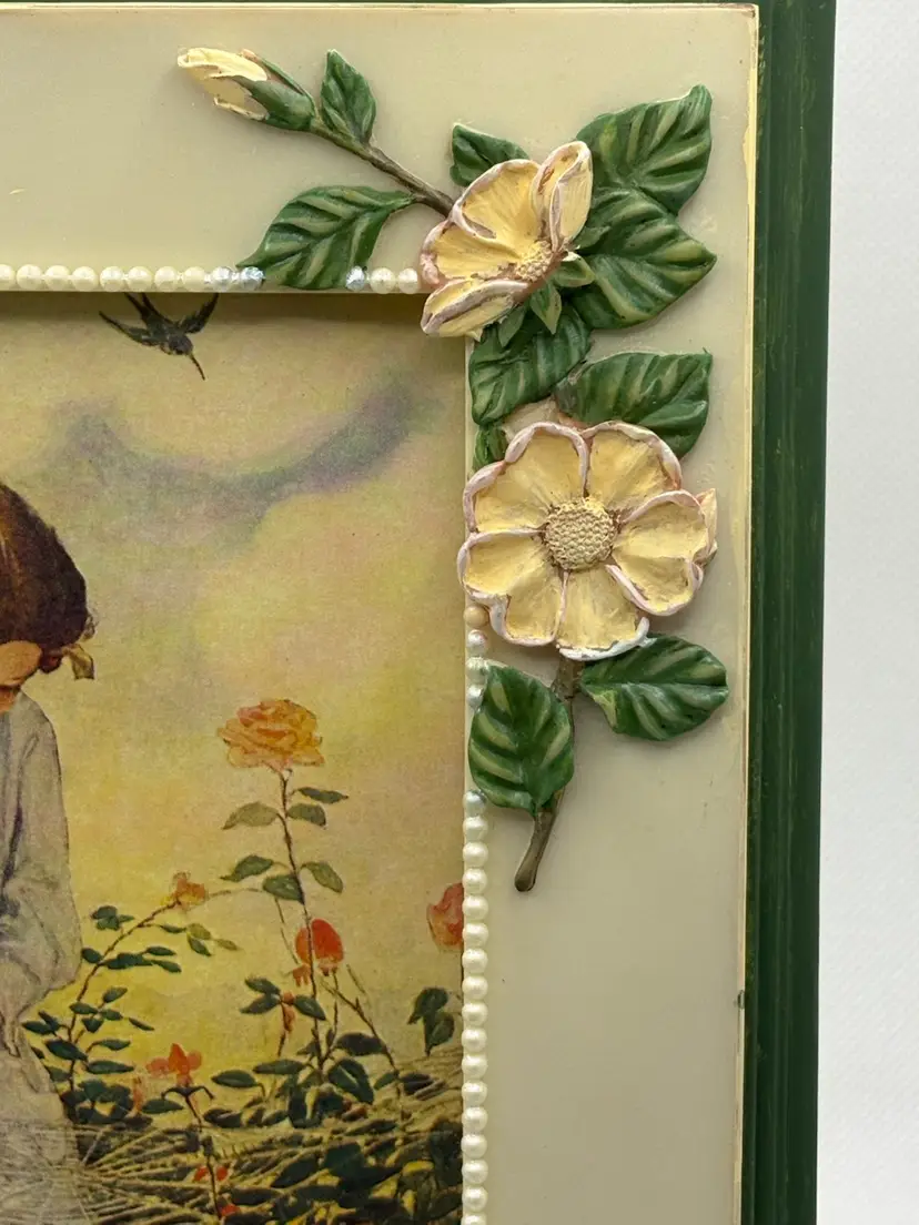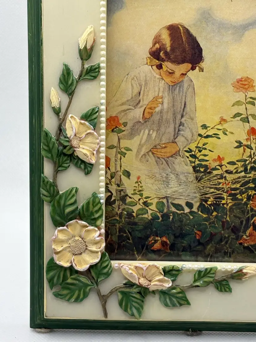 For sale is a custom framed art print of a little girl playing among the flowers. The frame is resin that has been hand painted with textured flowers. No breaks on the flowers and minimal signs of age from normal use. This is a cute little piece and would look great on your vanity!!!!