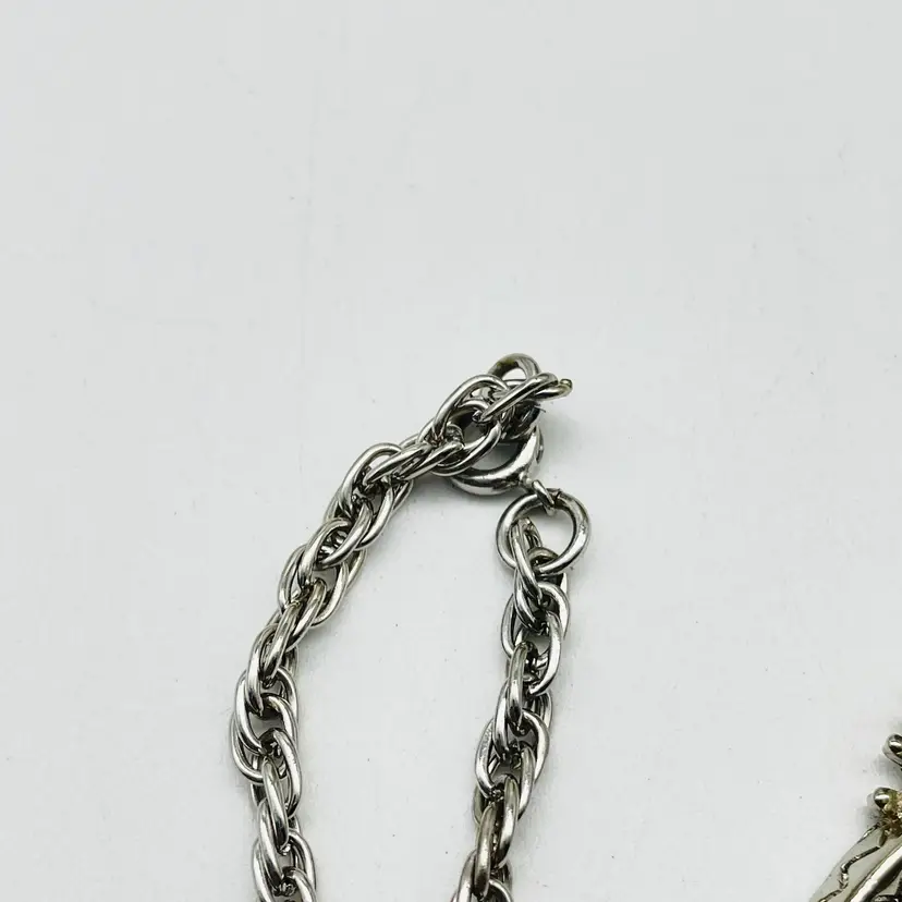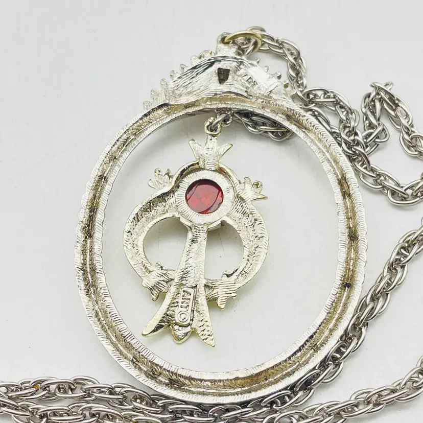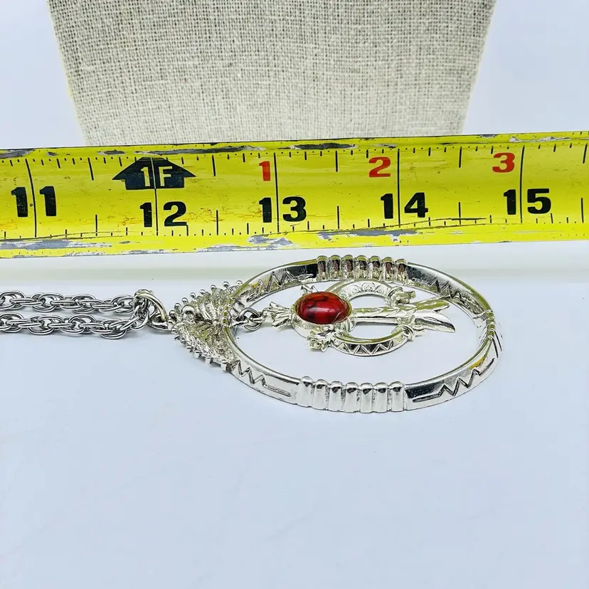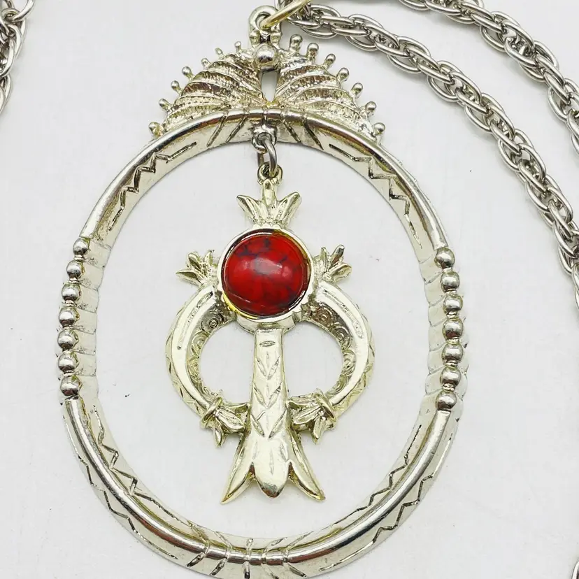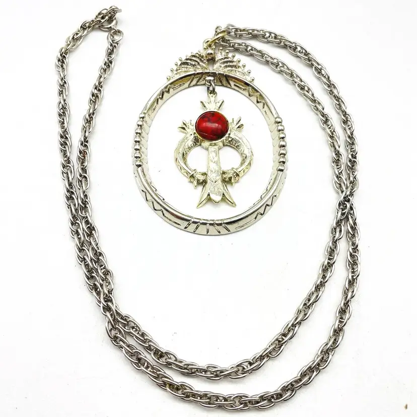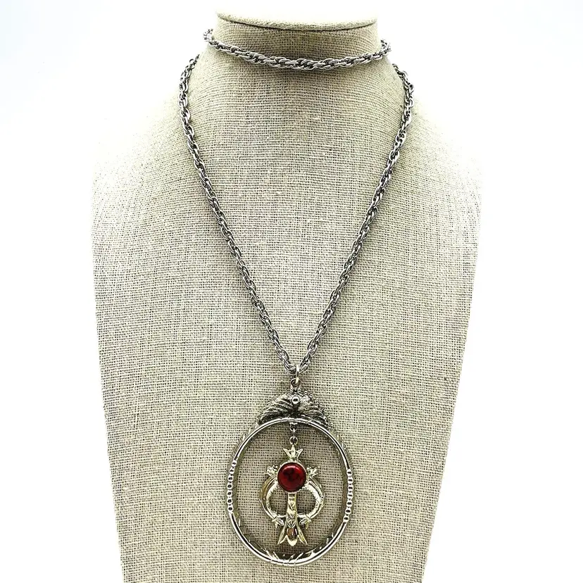 Striking signed ART necklace featuring a silver tone rope chain with a large openwork pendant accented by a bold red cabochon. A collectible vintage statement piece with intricate detail and timeless retro style. Features Signed ART necklace Silver tone rope chain design Large openwork pendant with red cabochon center Vintage statement jewelry style Approx. total length: 30"