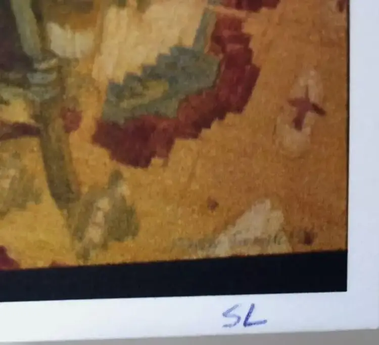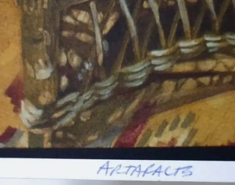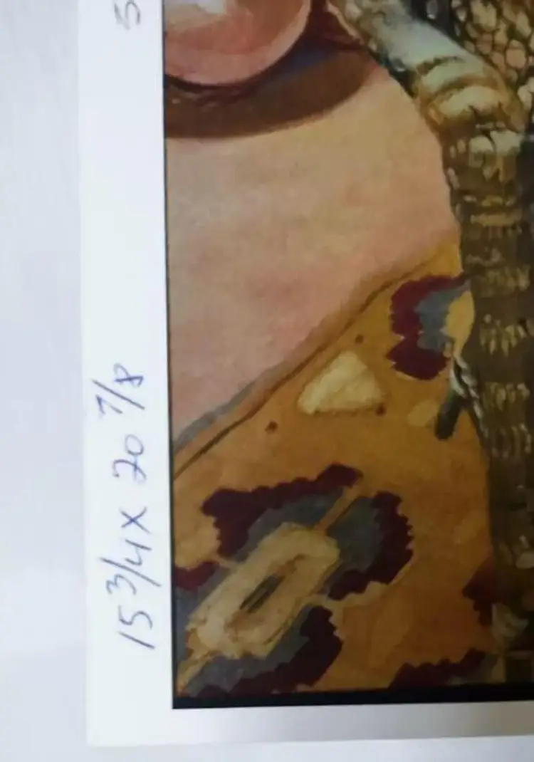 This beautiful watercolor print by Molly Davis Gough is a stunning addition to any collection. This reproduction showcases a still life scene with a Native American decor theme. The print is made from card stock and is a licensed reprint, it may be an artist proof as it has many of the artist's notations in the margins including the desired final size (15 3/4 x 20 7/8). The actual image measures 6 7/8 inches in length and 9 3/8 inches in height while the card stock itself measures 7 5/8 inches by 9 7/8 inches. It is unframed and sold as a single piece, and a faint signature is visible in the lower right corner of the image. The print is perfect for art enthusiasts who appreciate the beauty of still life paintings. Add this exquisite piece to your collection today!