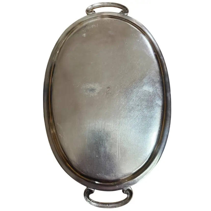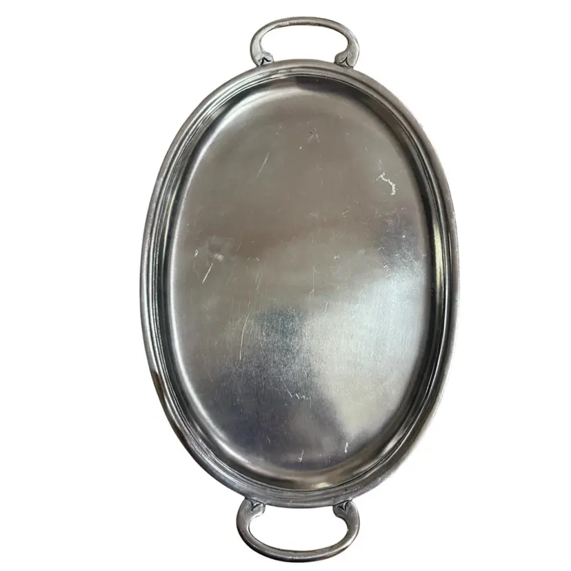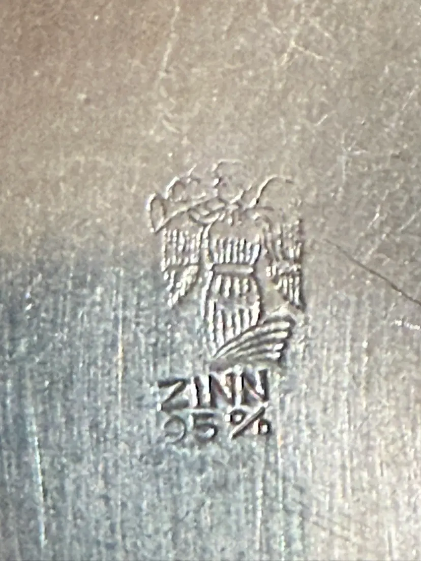 serving tray made of pewter (zinn) or a similar metal, such as stainless steel or silverplate. The term "zinn" is German for pewter, and many products made from this material are marked with "Rein Zinn" or "95% Zinn" indicating a high-grade pewter composition.