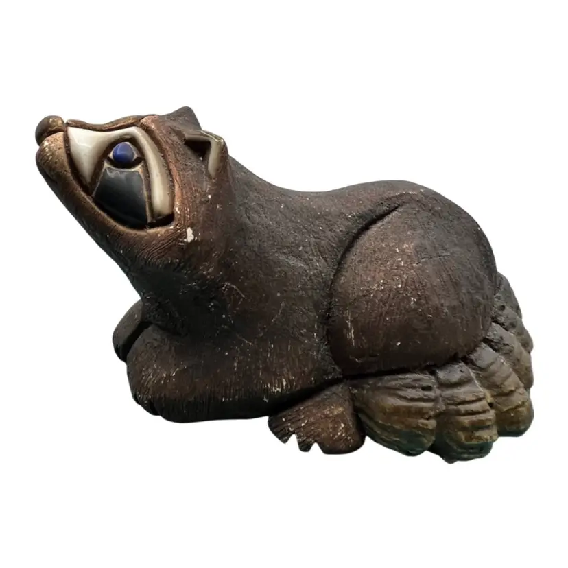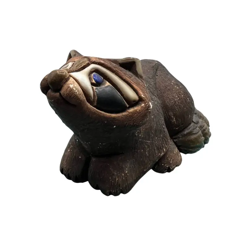 Artesania Rinconada Hand Painted Raccoon he is a rare one. Has beautiful blue eyes and he does have alittle wear on his paint but no chips or breaks which you see with a lot of these figures. Made in Uruguay