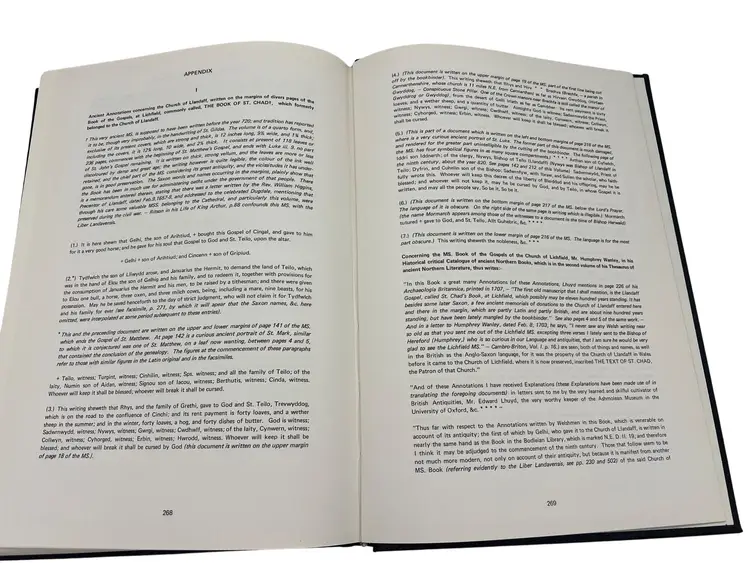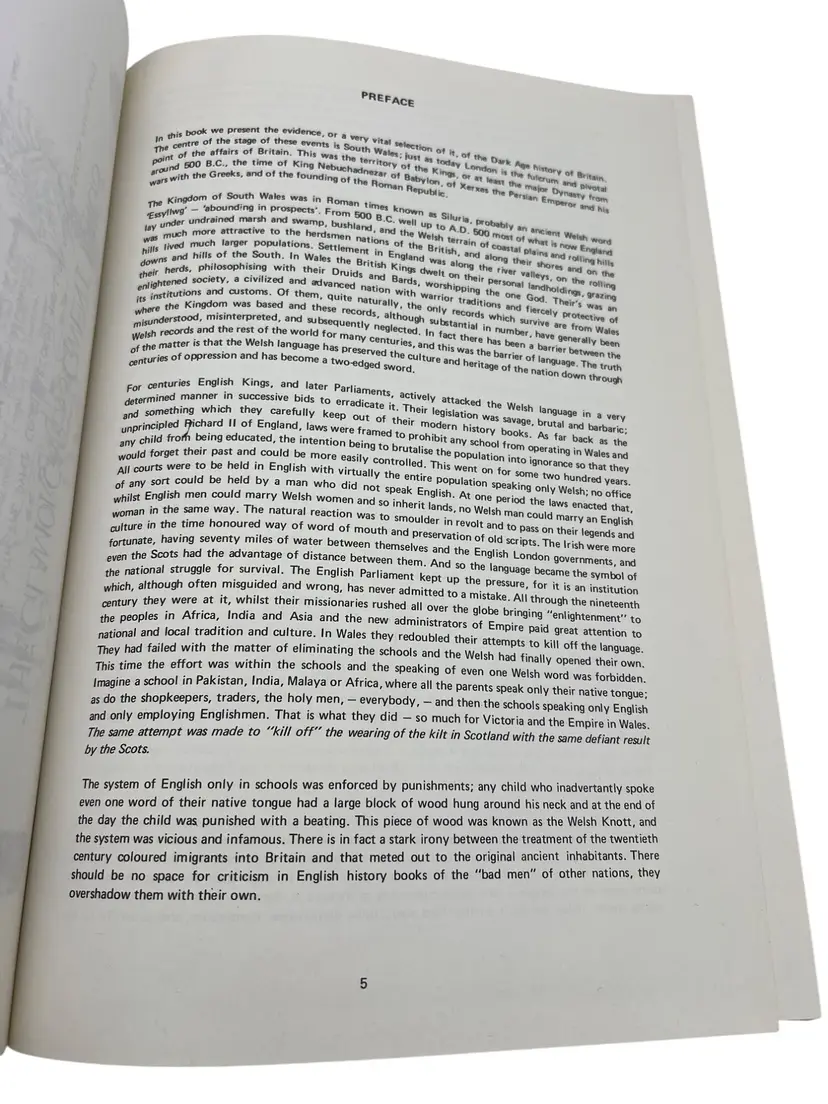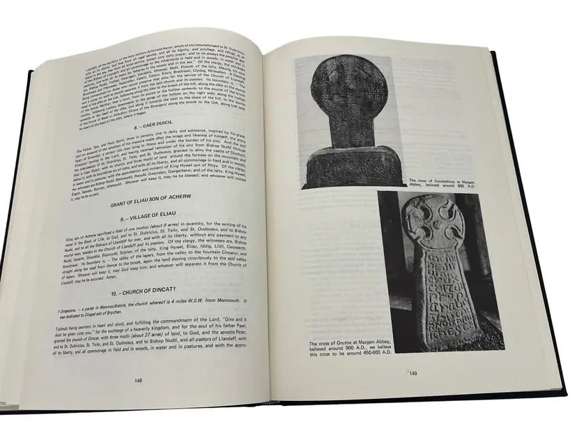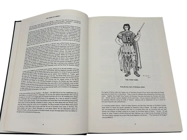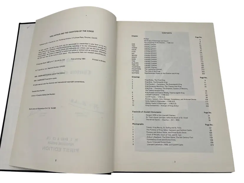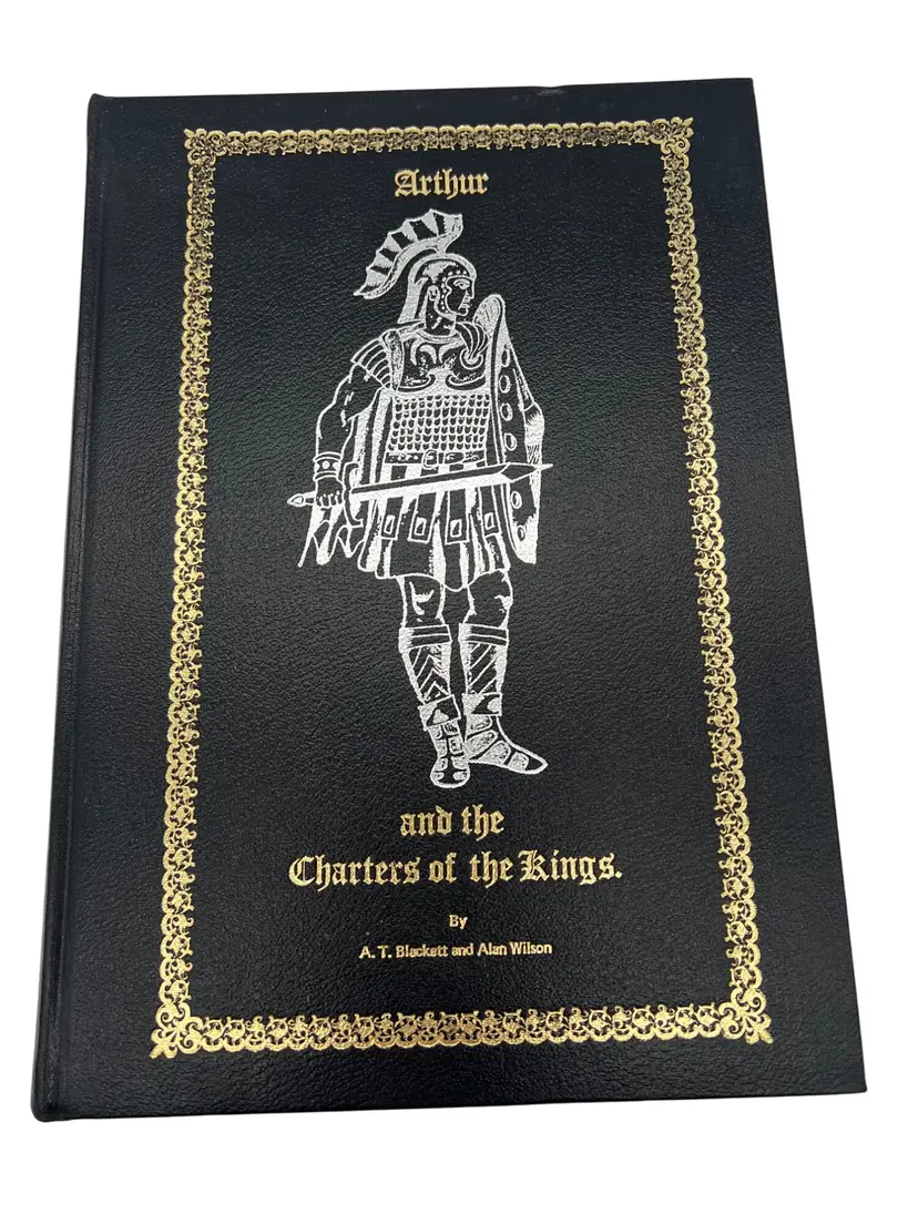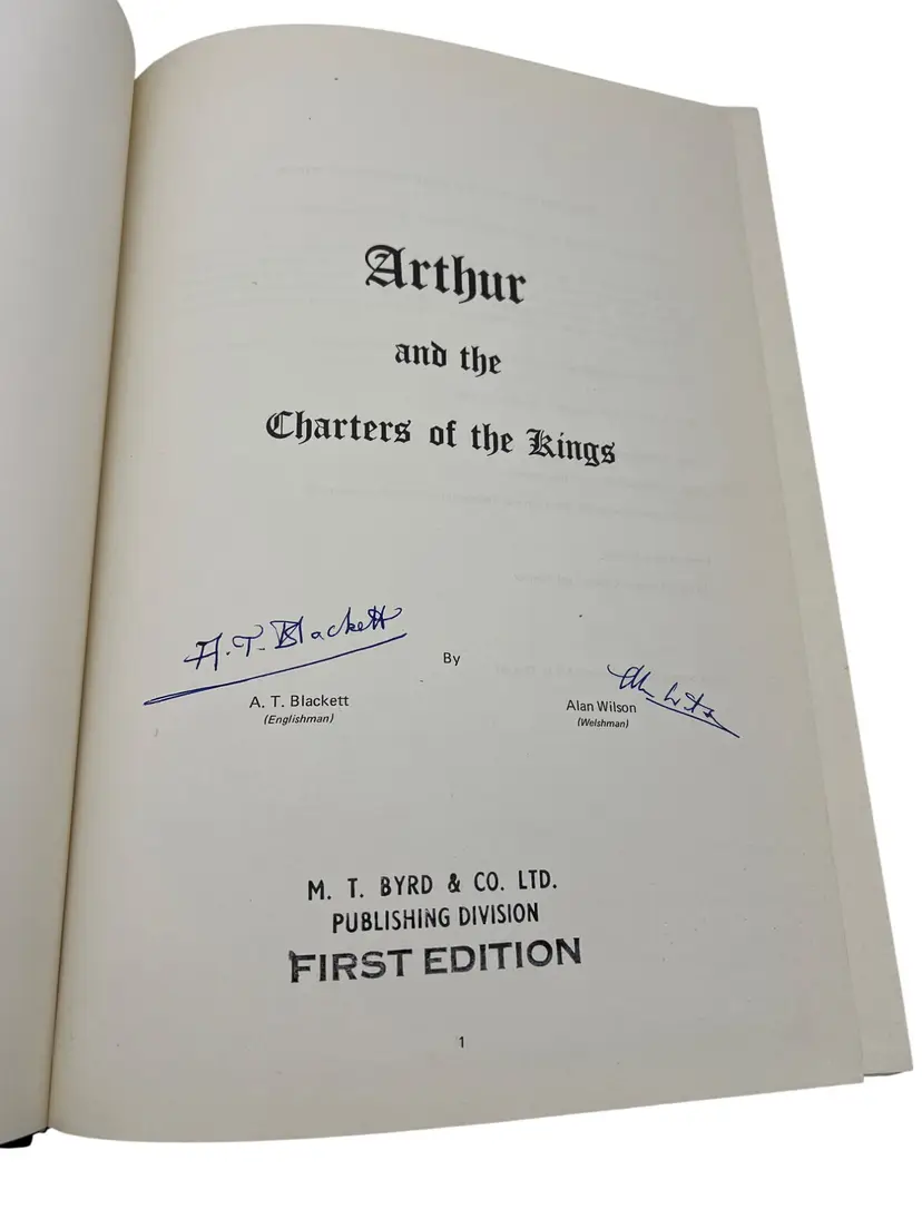 First edition (1981) hardcover Arthur & the Charters of the Kings by A.T. Blackett & Alan Wilson, published by M.T. Byrd & Co., Ltd., Cardiff. Large format (approx 12″ x 8.5″) with 280 numbered pages. This copy is signed by both authors on the title page. The work investigates the history of the kings of south Wales (450 BC–1091 AD), the legend of King Arthur, and the charters of Llandaff among other Welsh historical documents. A highly collectible item for Arthurian legend and Welsh history enthusiasts.