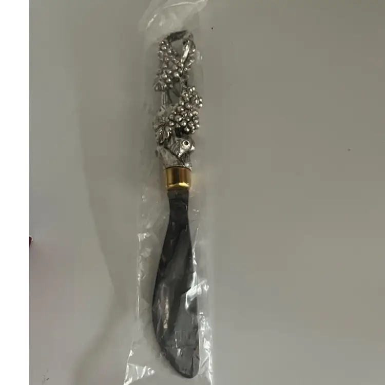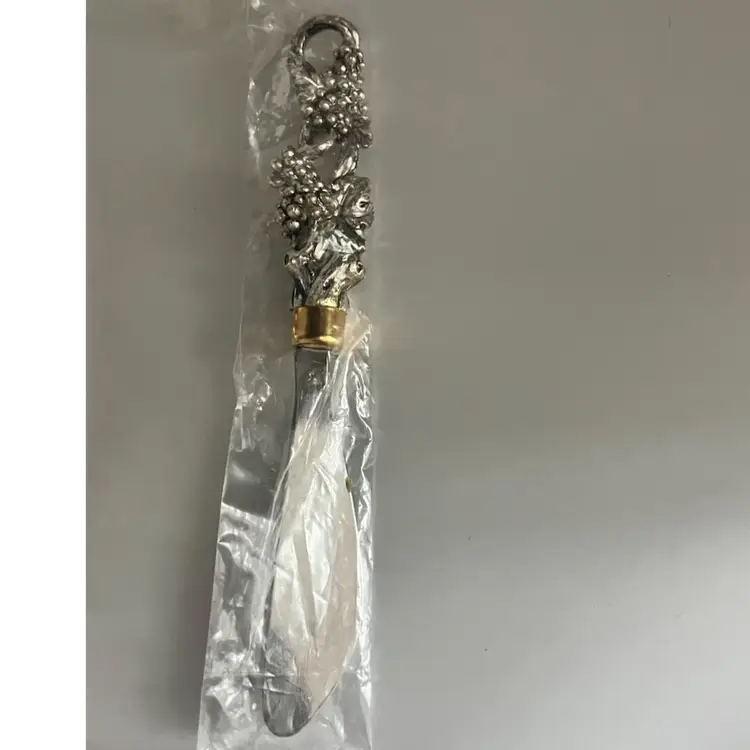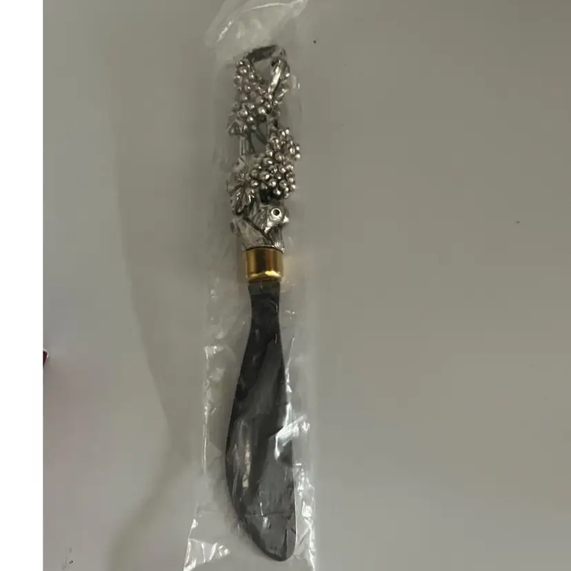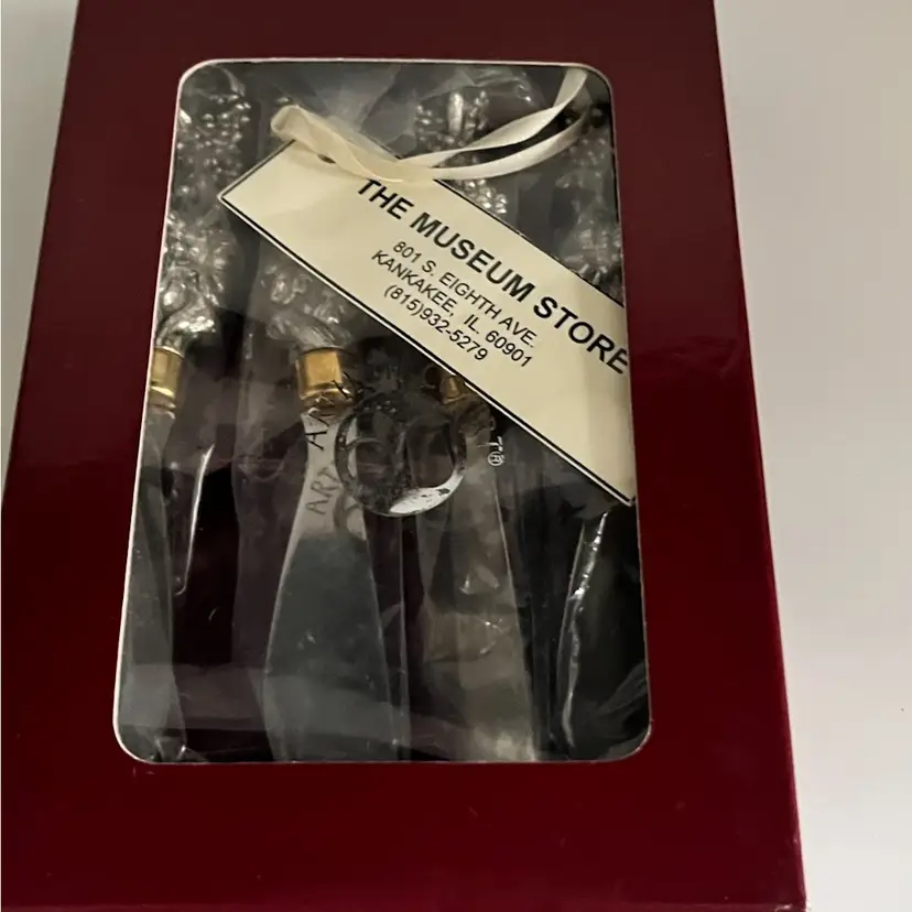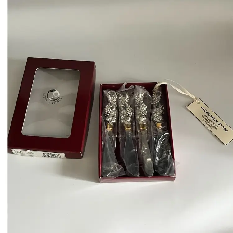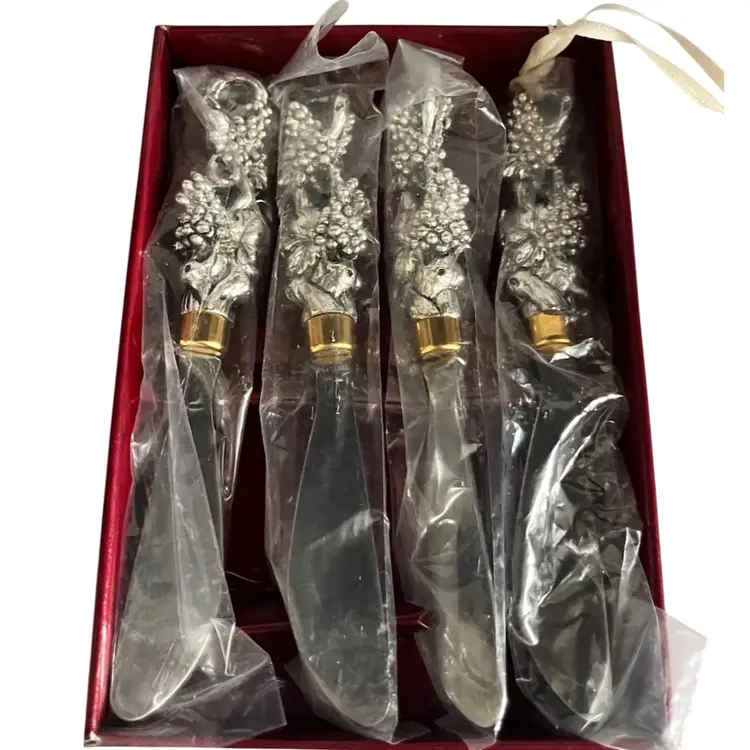 New - never used condition. Stainless steel blades-Pewter handles-gold tone band.