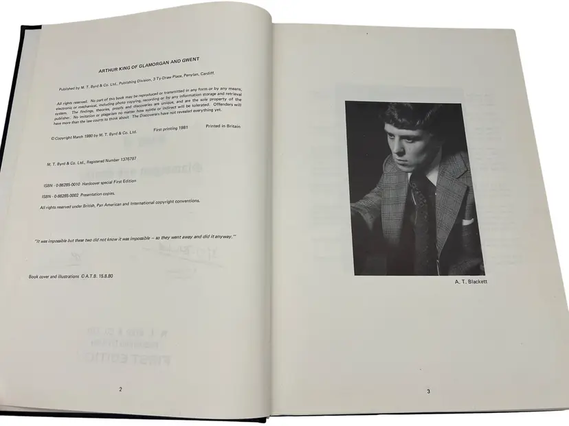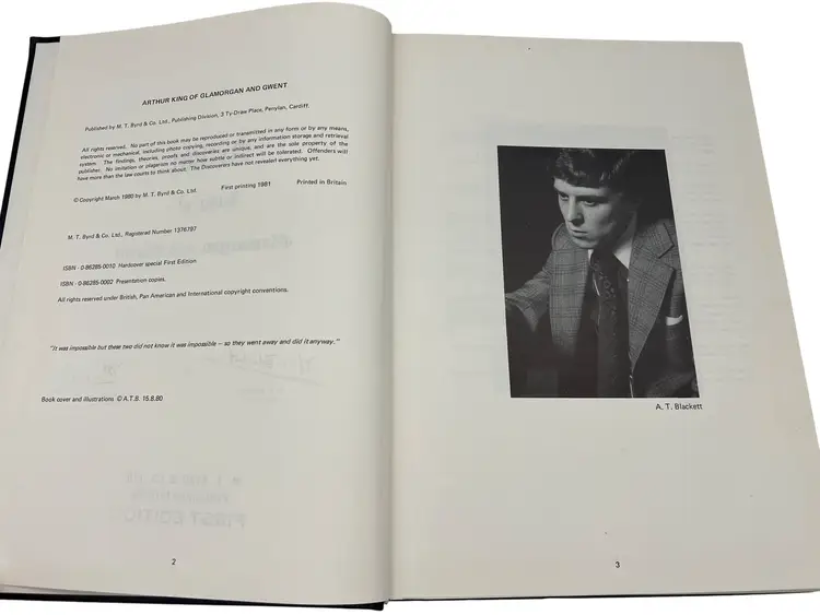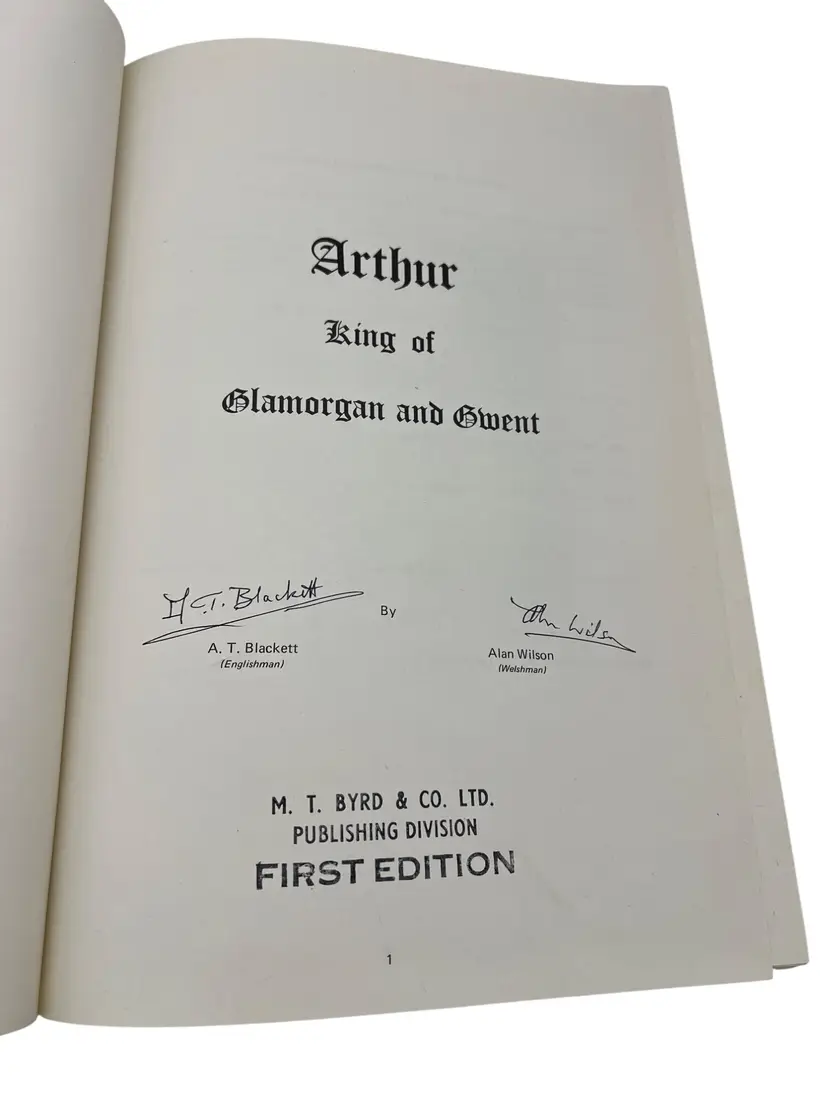 First edition (1981) of Arthur, King of Glamorgan & Gwent by A. T. Blackett & Alan Wilson, published by M. T. Byrd & Co., Cardiff. Large format hardcover (approx. 12″ × 8.5″) with gilt lettering and illustrations (genealogical tables, maps) spanning 320 pages. This copy is signed by both authors on the title page. A specialized work exploring the legend of King Arthur in relation to the Welsh regions of Glamorgan and Gwent. Ideal for collectors of Arthurian legend, Welsh history, or signed scholarly works.