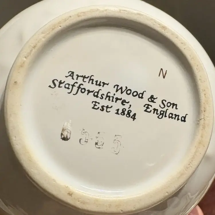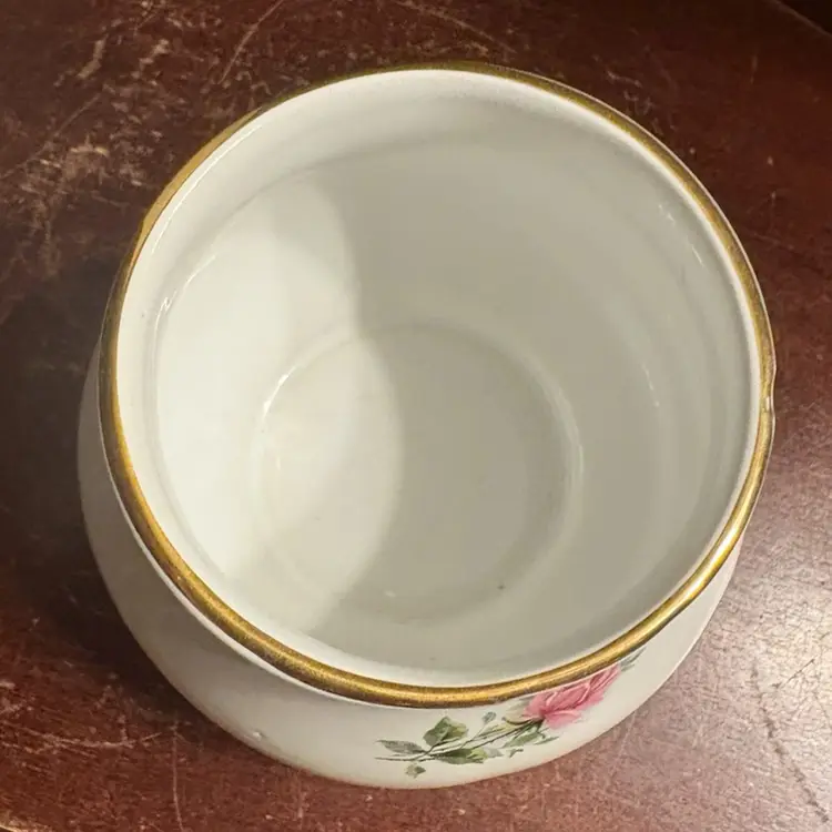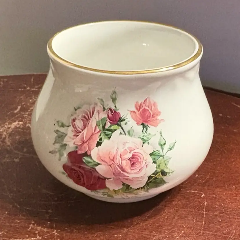 Technically this is a jelly pot without the lid, but would make for a sweet squat vase. Made in Staffordshire England, #6565, roughly 3” tall and 4” wide