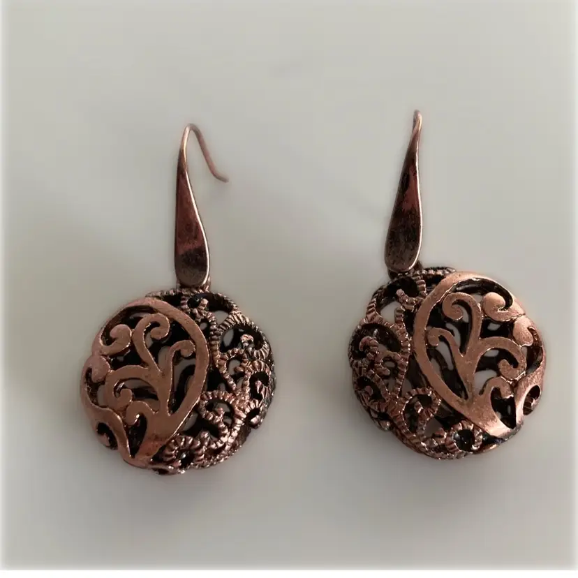 Artisan antiqued copper filigree dangle earrings. They measure 7/8” across and dangle 1 5/8” down.