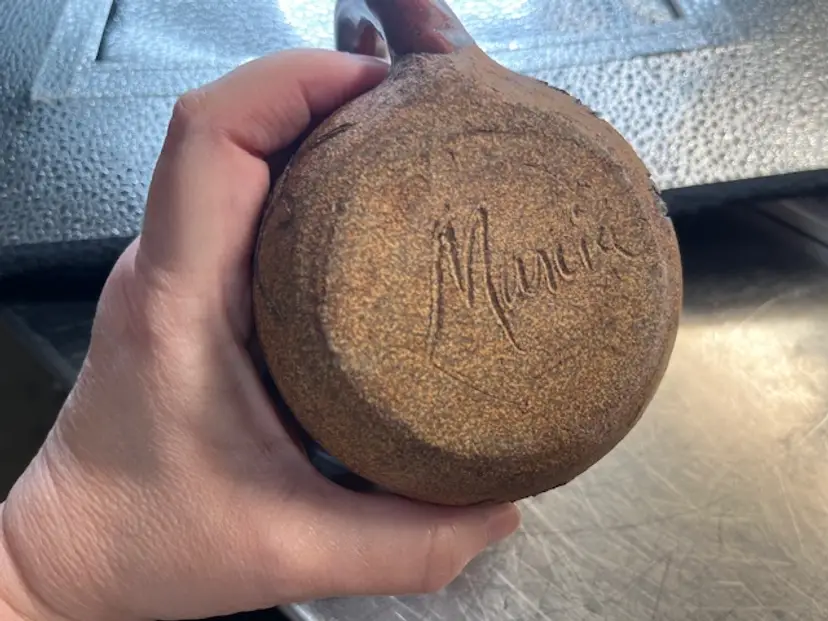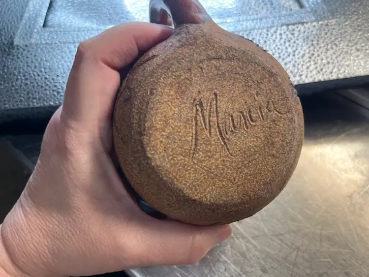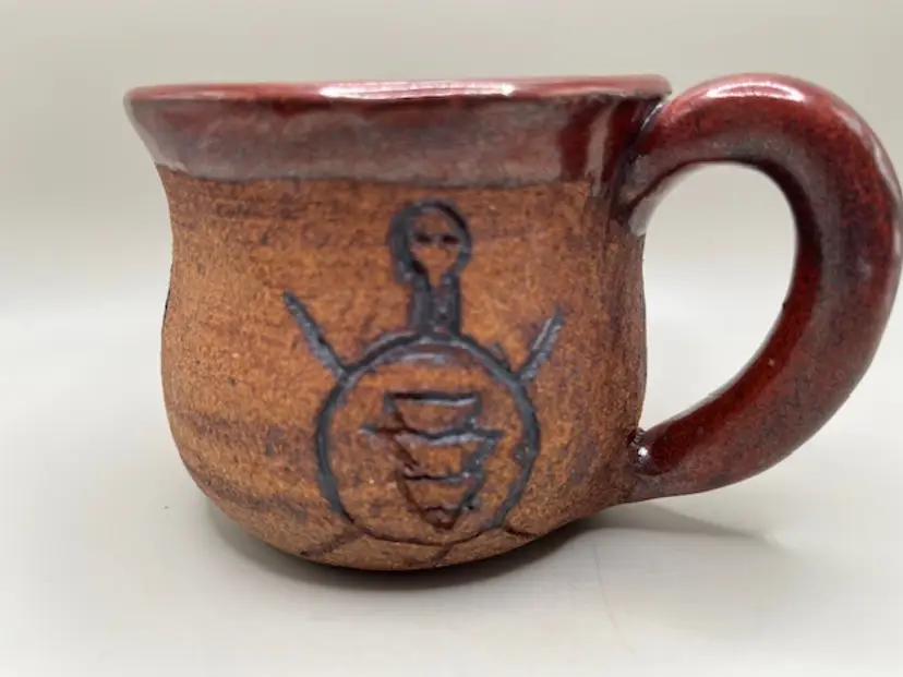 This mug features glyphs or fetishes of a deer, bear and turtle. The signature appears to be Mamia, but not certain. Measures 3 inches tall.