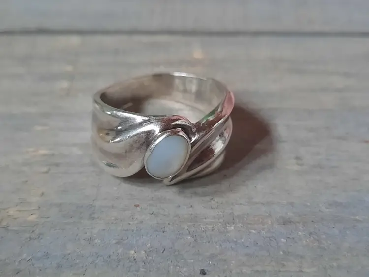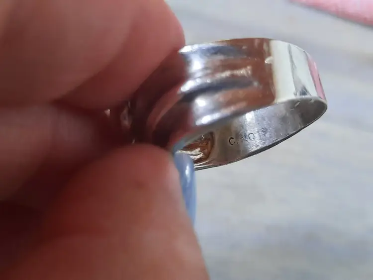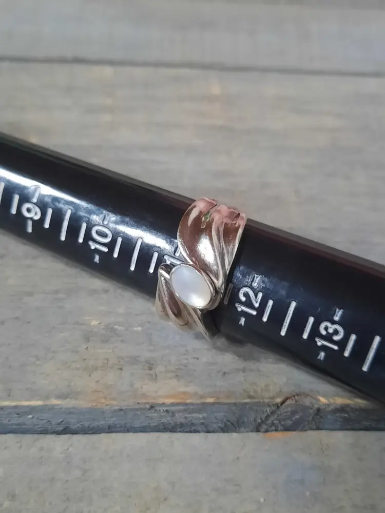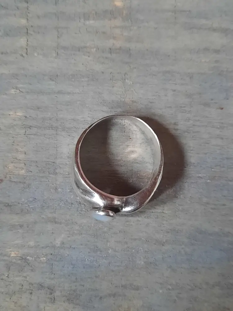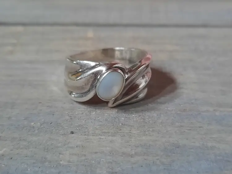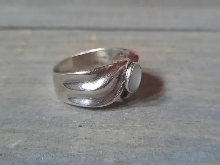 Artisan crafted sterling silver ring with a bezel set oval moonstone. Beautiful textured wave pattern band that hugs the moonstone. I purchased this ring directly from the artisan at Toronto's One-of-a-kind Show in the late 1990s. Size 11.5. Weighs 7.0 grams. Signed C. NOIR. In excellent pre-owned condition.
