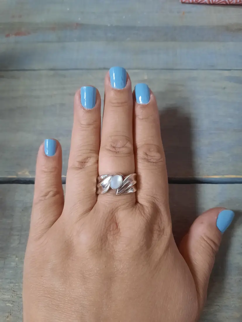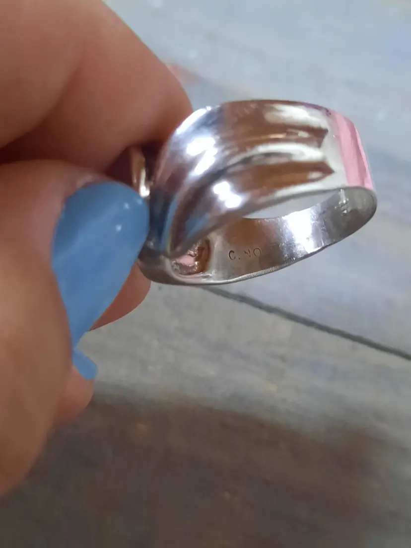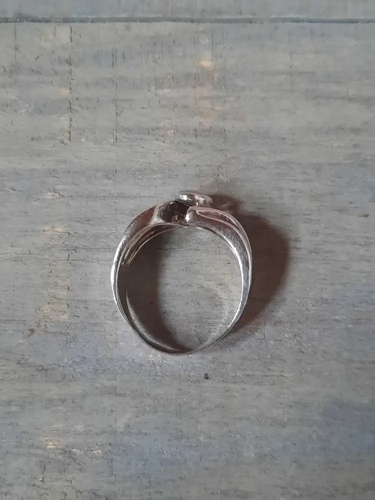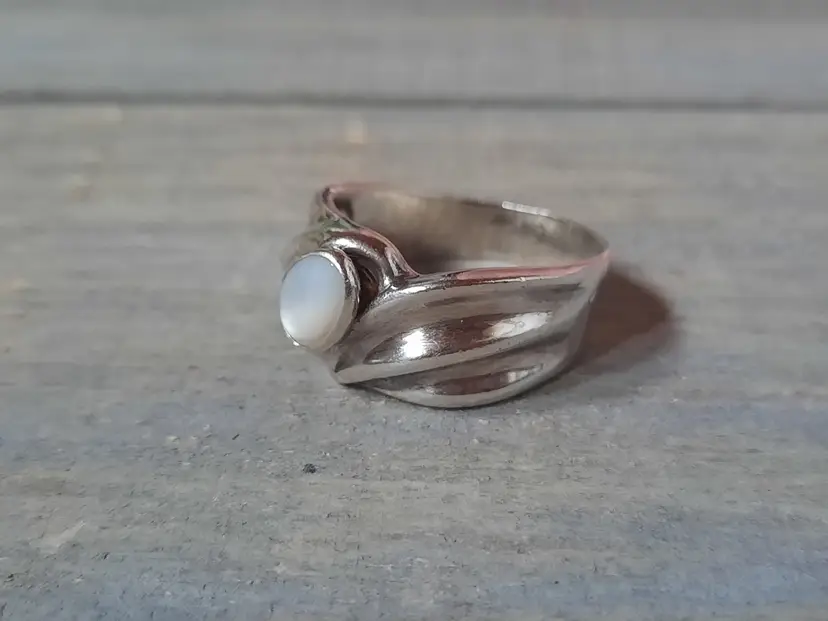 Artisan crafted sterling silver ring with a bezel set oval moonstone. Beautiful textured wave pattern band that hugs the moonstone. I purchased this ring directly from the artisan at Toronto's One-of-a-kind Show in the late 1990s. Size 11.5. Weighs 7.0 grams. Signed C. NOIR. In excellent pre-owned condition.