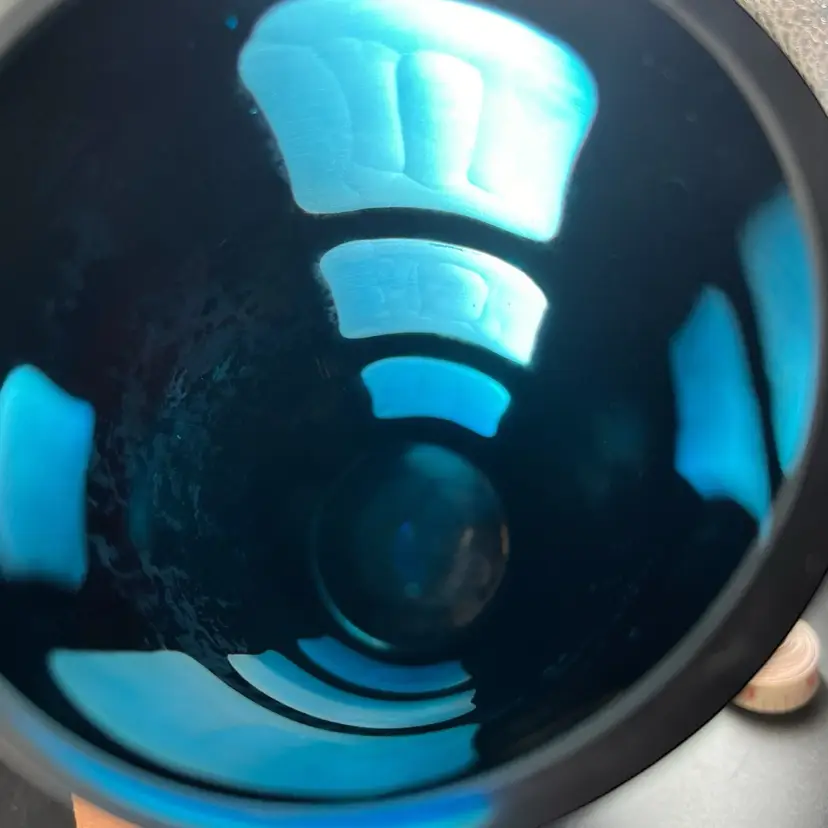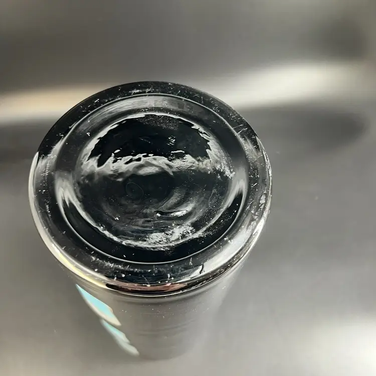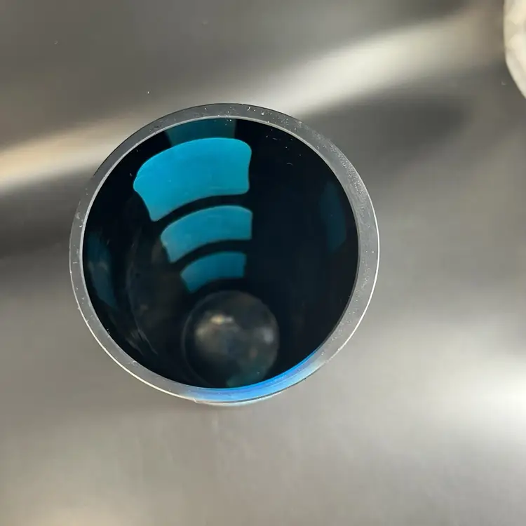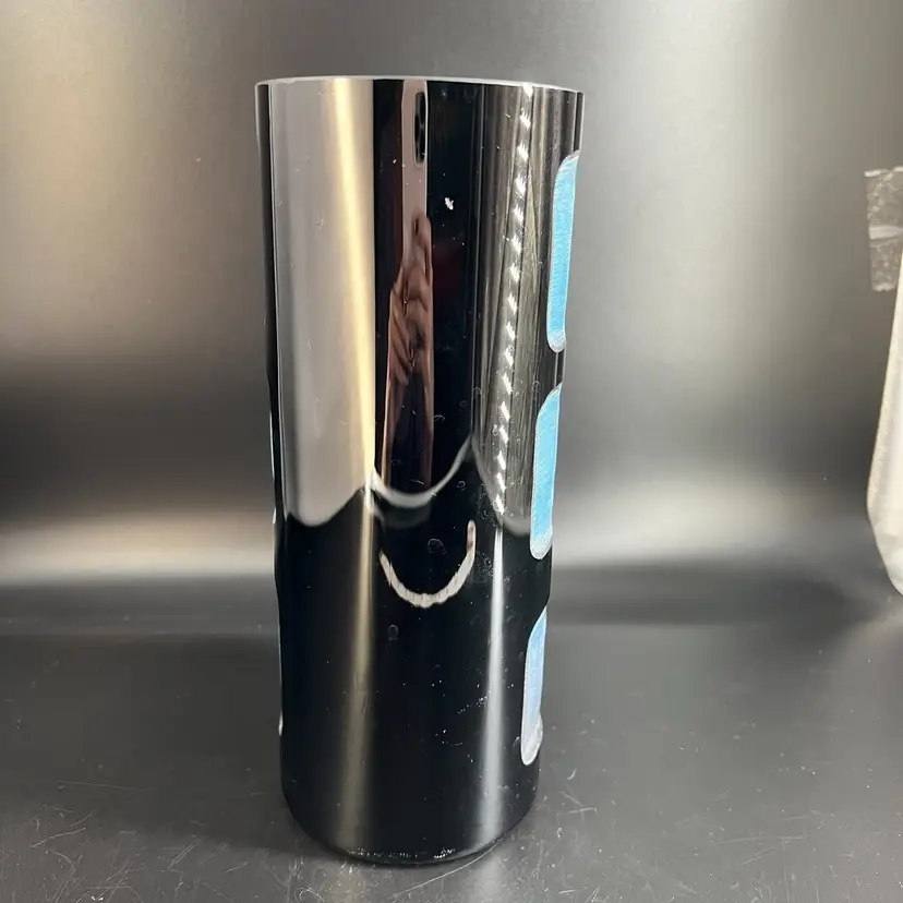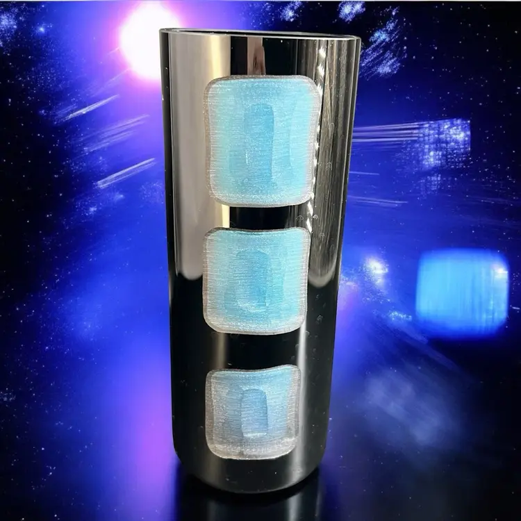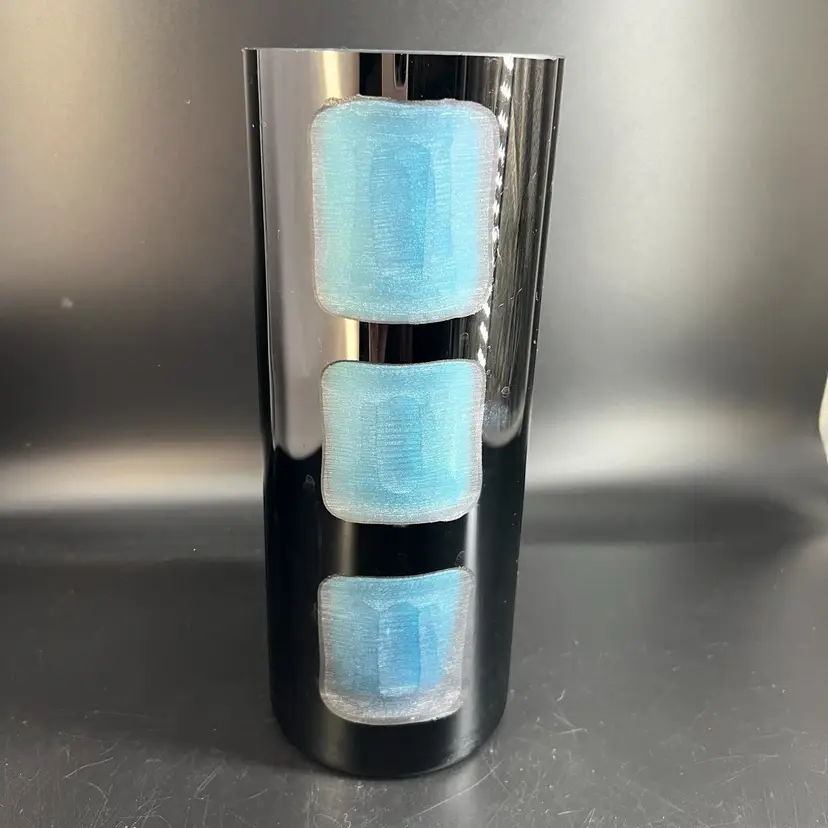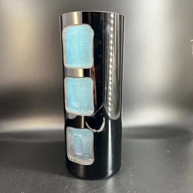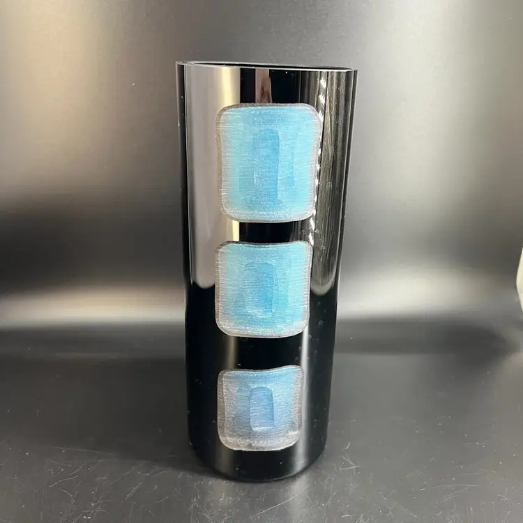 This stunning art glass cylinder vase is a beautiful addition to any collection. The vase features a glossy black finish with a unique window panel pattern in a stained blue, that is sure to catch the eye. The vase is handcrafted from high-quality glass materials, making it a one-of-a-kind piece that is both original and timeless.