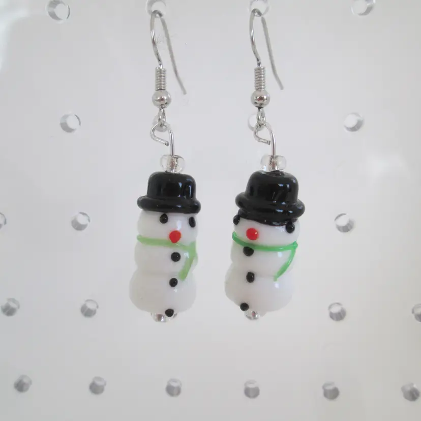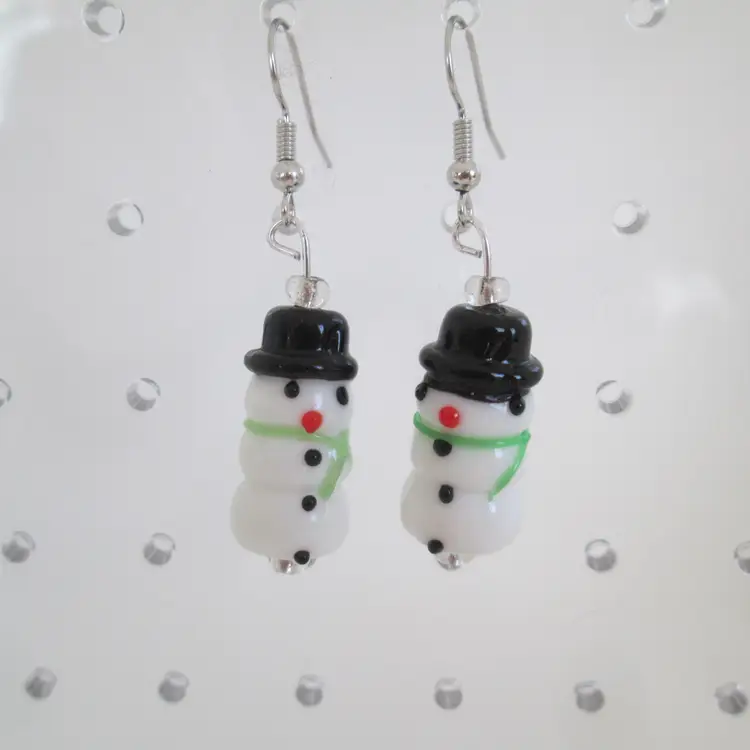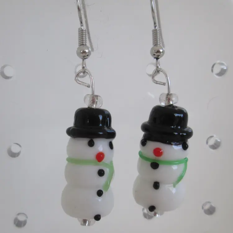 Artisan lampwork glass snowman with green scarf beaded drop earring. Each bead is handmade so there are subtle differences between them. It makes a real cute one-of-a-kind earring. The drop measures 2" x 1/2" wide.