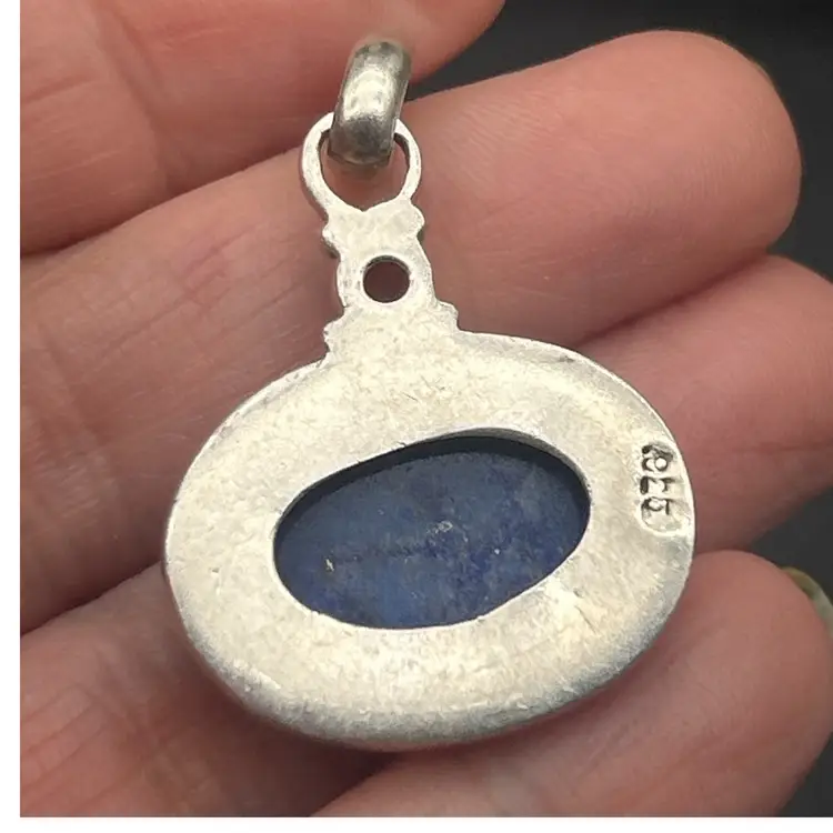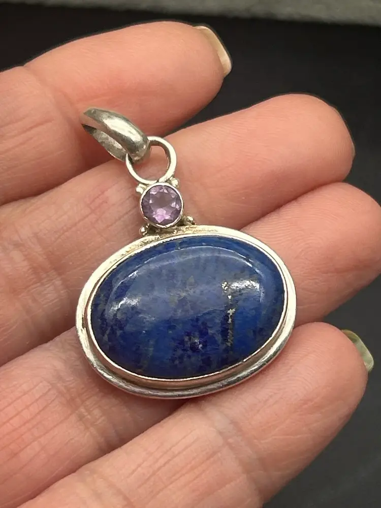 Notable Details: • Material: Sterling Silver (stamped 925) • Gemstones: • Lapis Lazuli (oval cabochon, approx. 1” across) • Amethyst (faceted round, approx. 5mm) • Design: Artisan bezel setting with open back • Measurements: 1” wide x 1.5” tall including bail • Condition: Excellent; natural inclusions present, no cracks or chips
