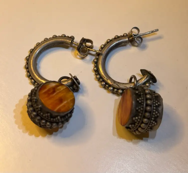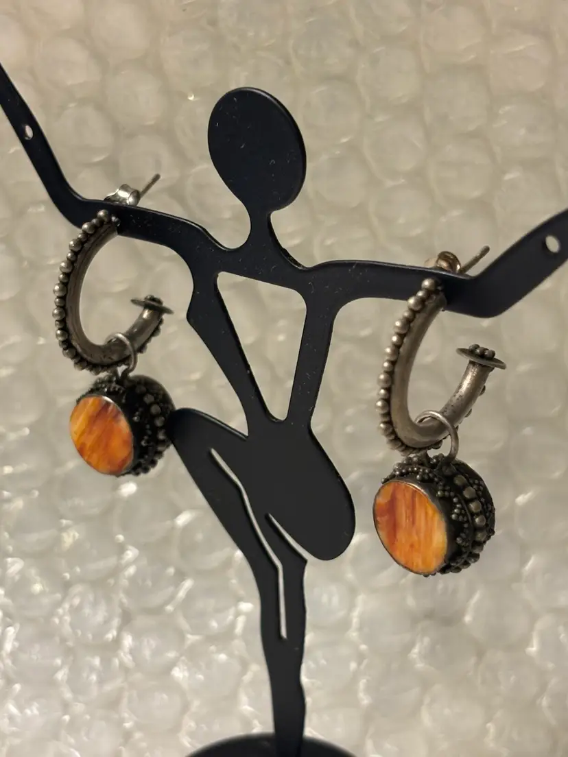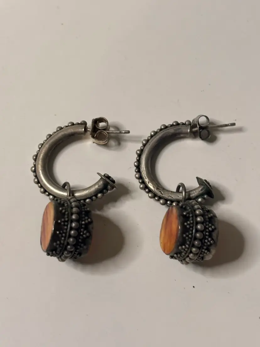 Unusual hoop earrings can be worn with or without the decorative spiny oyster drop. Artisan made, unmarked, but tested to be sterling. Hoops are 3/4 inch, drops are 1/2 inch.
