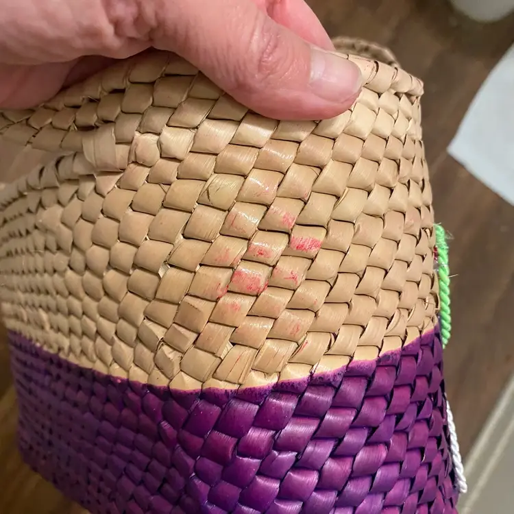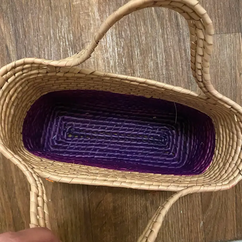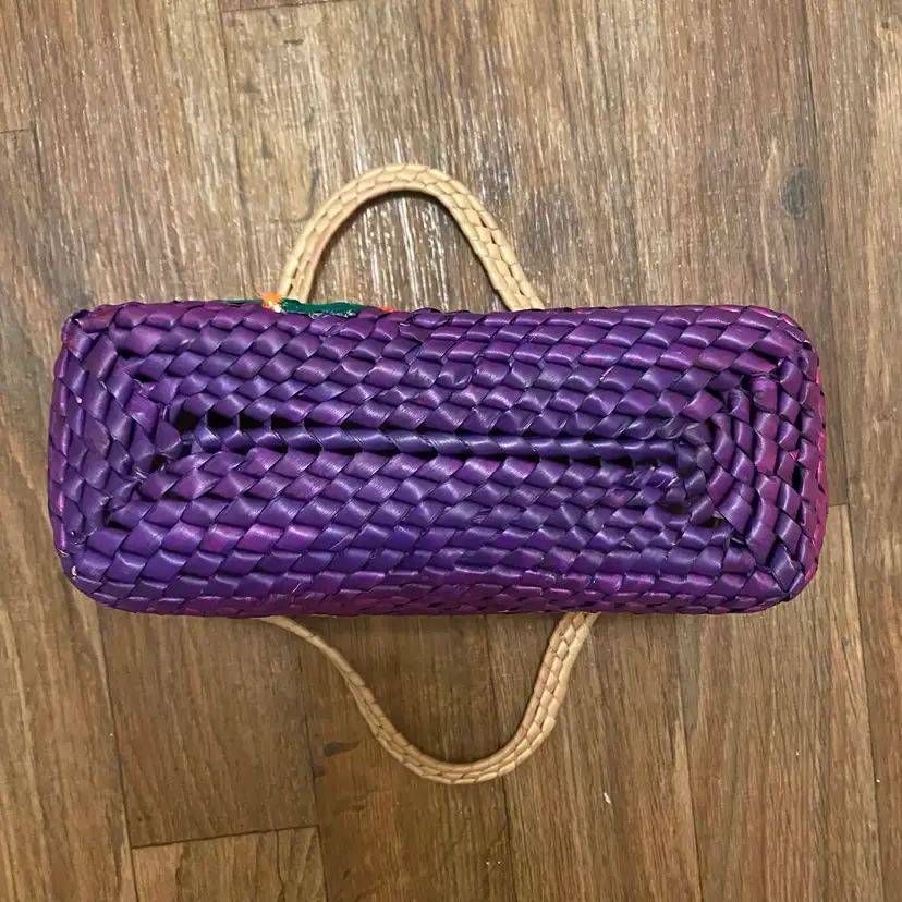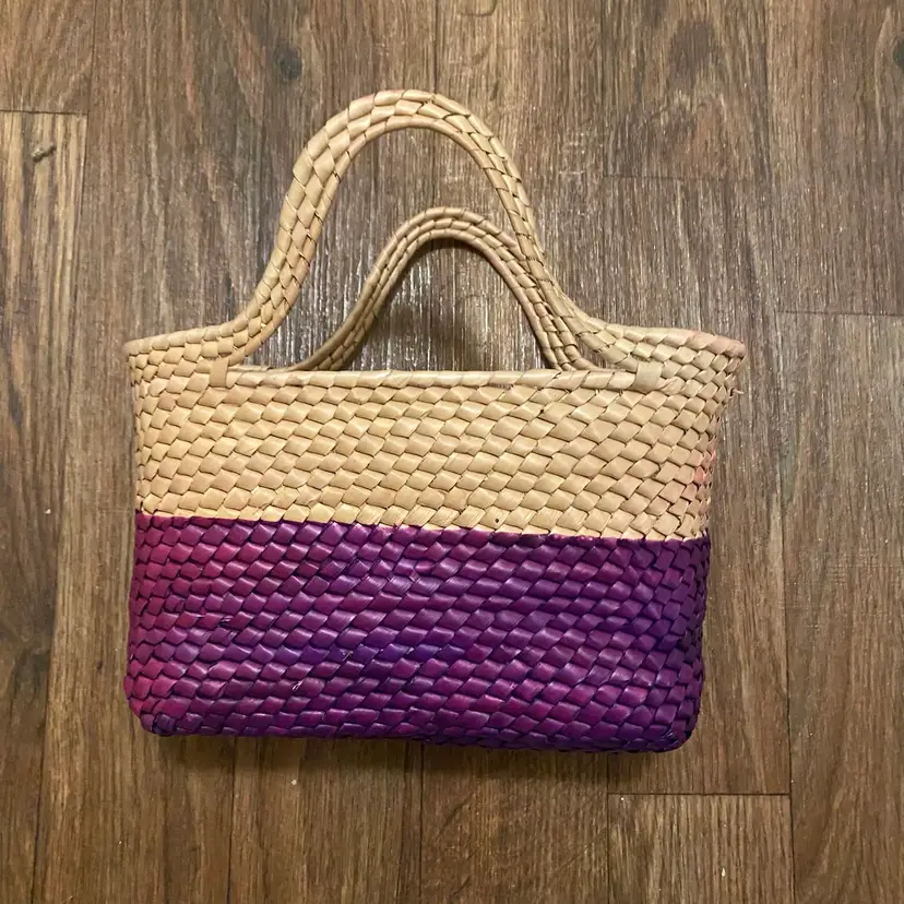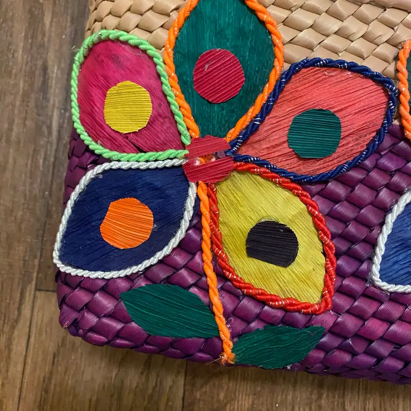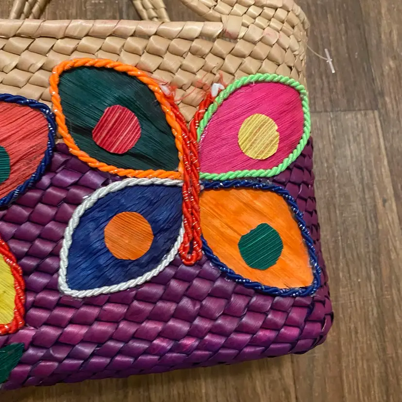 Artisan Made Woven Straw Hand Bag Tote Butterfly & Flower Purple Tan 7x10 READ ** there is some pink staining on the back of the tote bag in the tan area as shown in photos No other damages 7” high x 10” wide x 4” deep #artisan #woven #straw #flower #butterfly