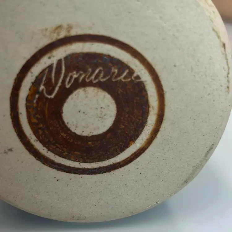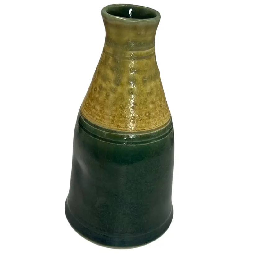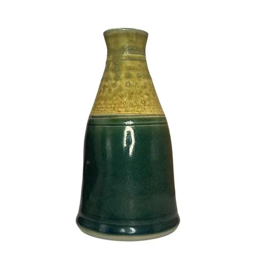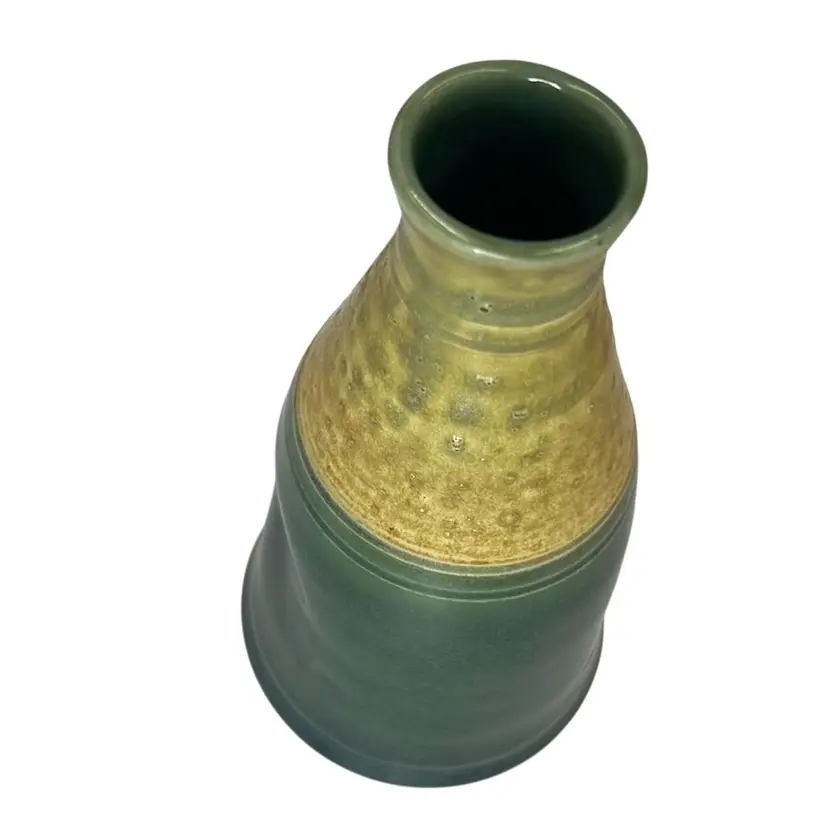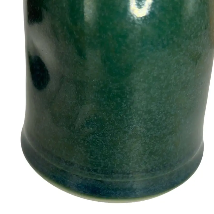 This glaze is so pretty! Green speckled with blue on bottom and textured tan on top. Signed artisan piece. No damage.