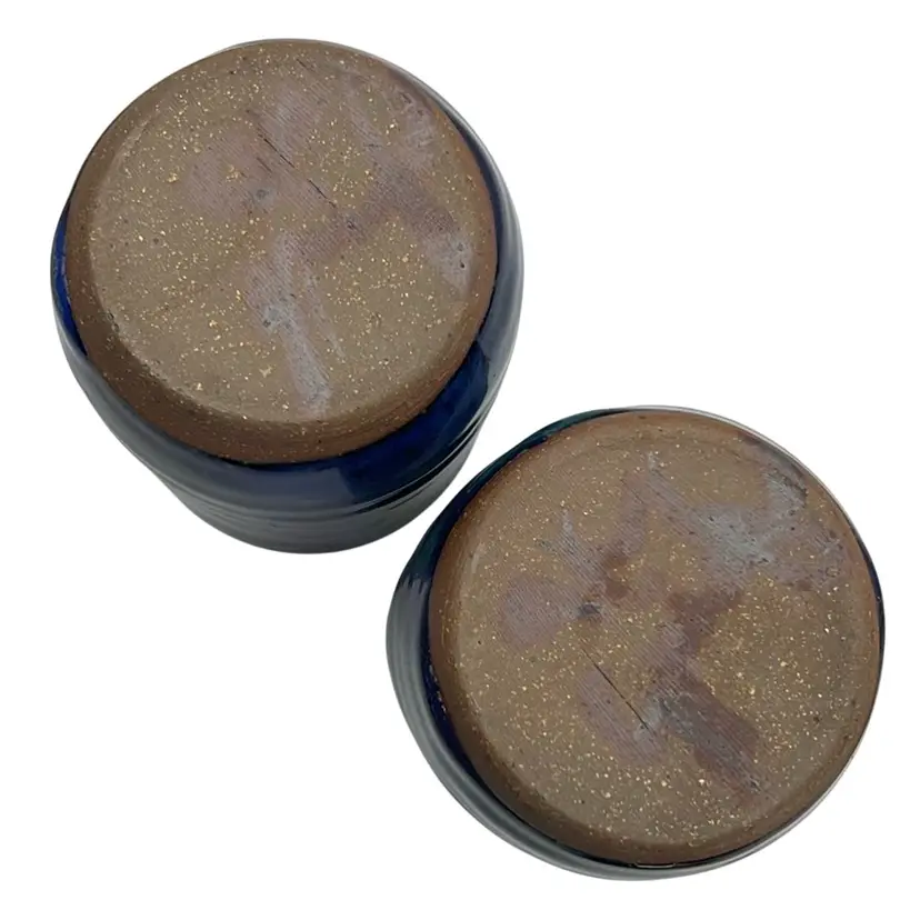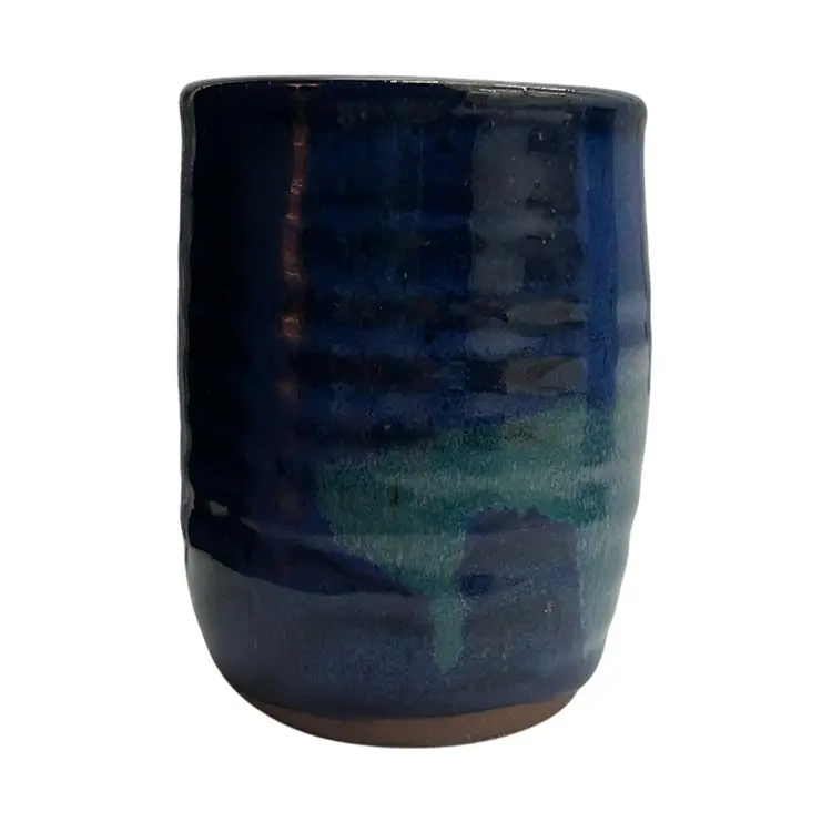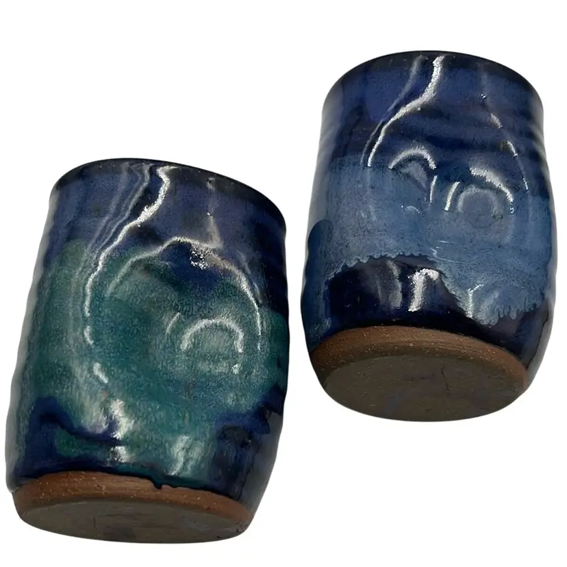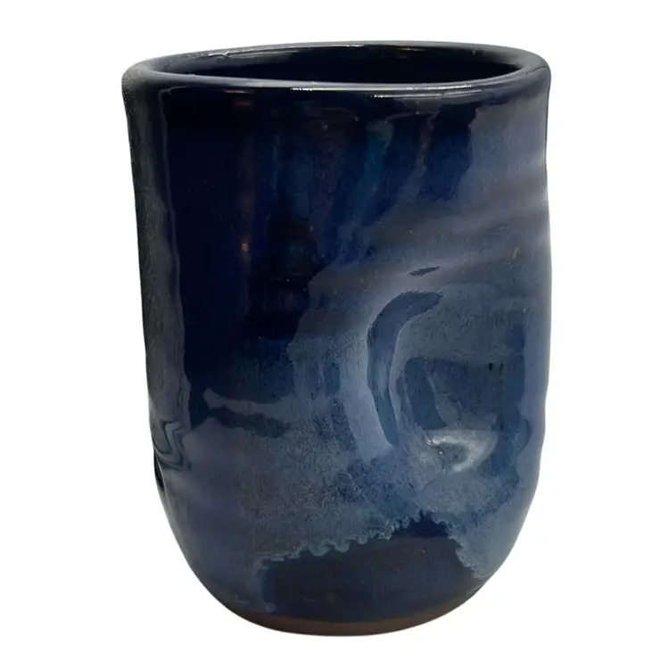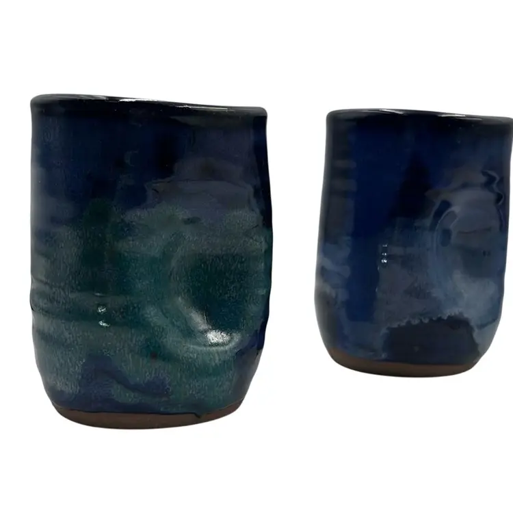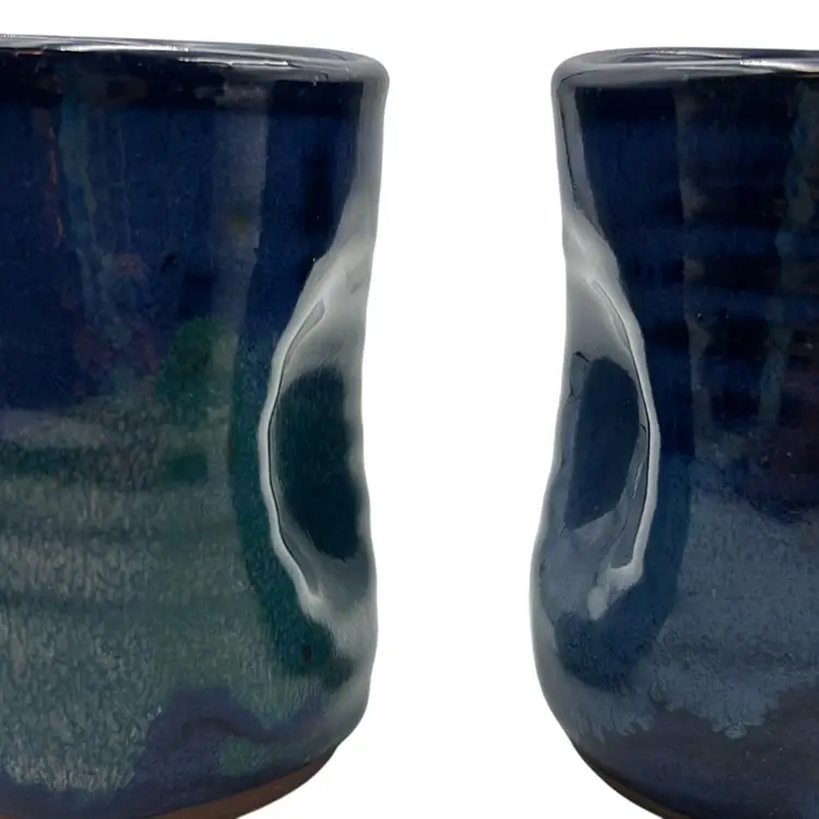 Deep periwinkle Royal and navy blue drip glaze. One with green drip. Artist signed. No damage. Easy to hold, beautiful handmade coffee or tea mugs. 4.5” tall