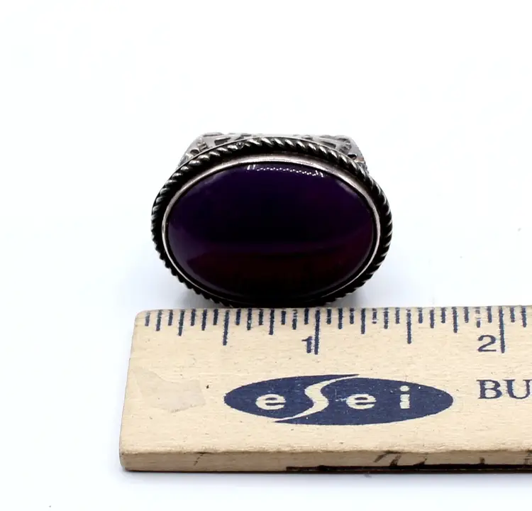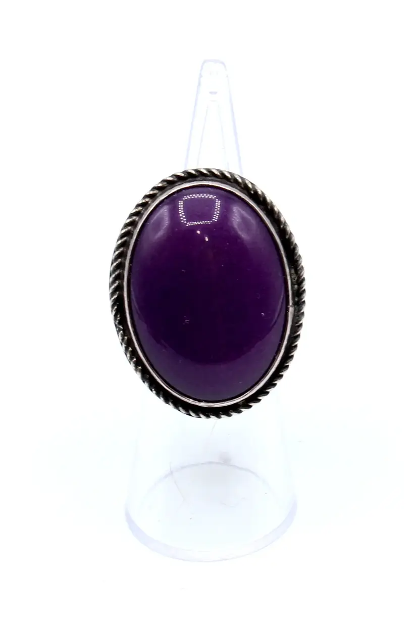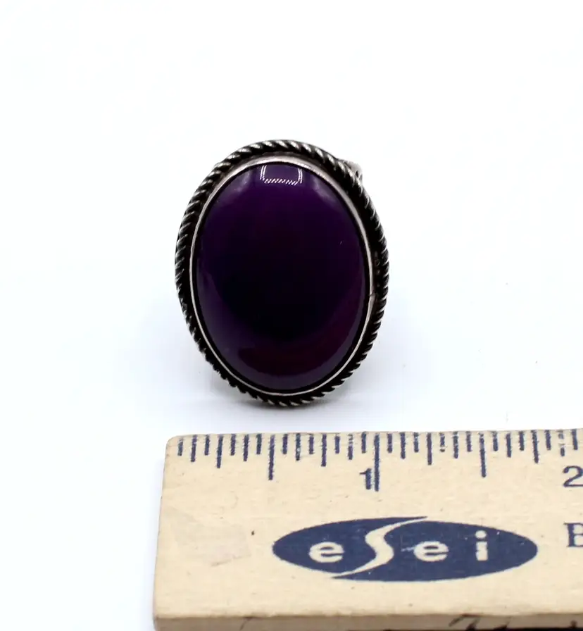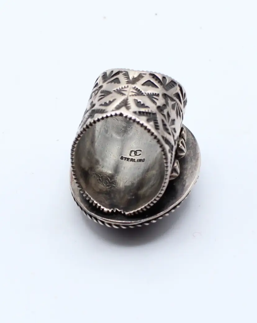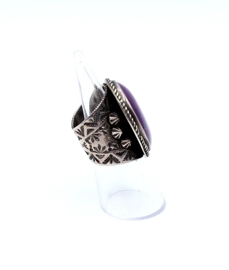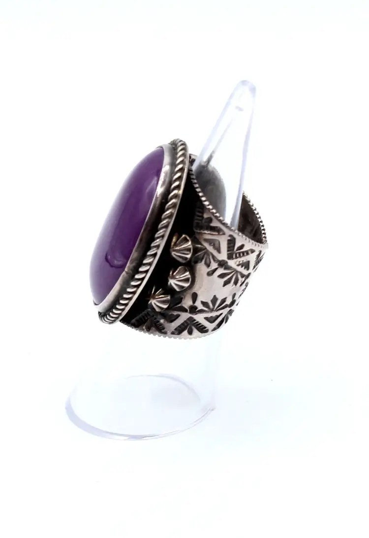 Fabulous signed DC inner twined unknown artist. Assumed Navajo or Artisan. Fantastic hand stamped studded 13.78 mm wide band. Stone assumed Sugalite set in smooth bezel with twisted wire frame. Stone approx 27.8mm x 21.54mm