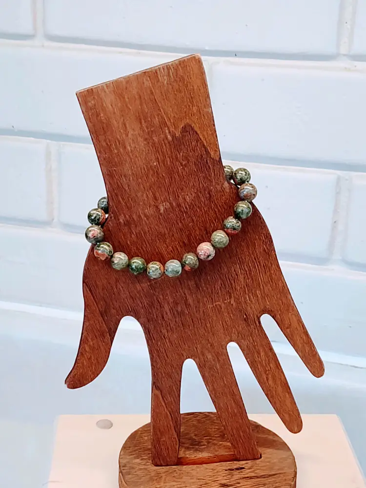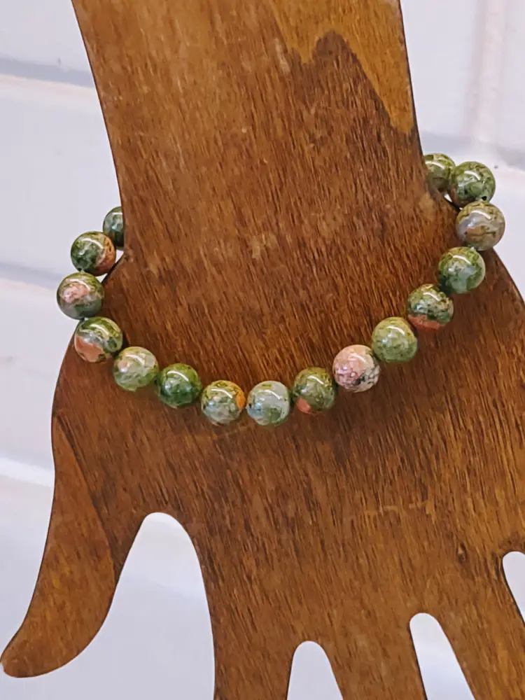 Unakite Jasper: This stone is well-known for its characteristic mix of pink (which can appear orange) and green hues. It is often described as having balancing and harmonious energy. It's a combination of Red Jasper, Pink Feldspar, and Green Epidote.