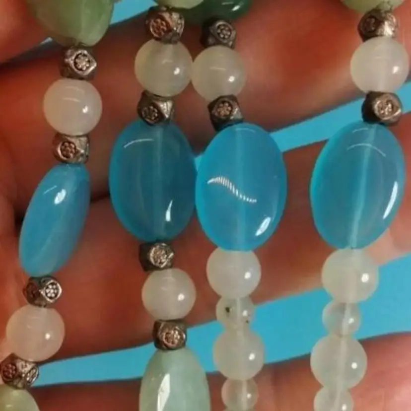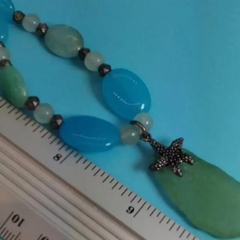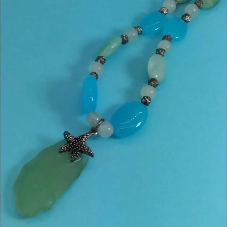 This handmade necklace features a beautiful piece of green sea glass paired with a charming starfish pendant. The necklace is accented with blue and white peices of glass, that have been run through a rock polishing cycle then polished and shaped, creating a coastal vibe perfect for any beach lover. It's a unique piece that adds a touch of the ocean to your outfit.