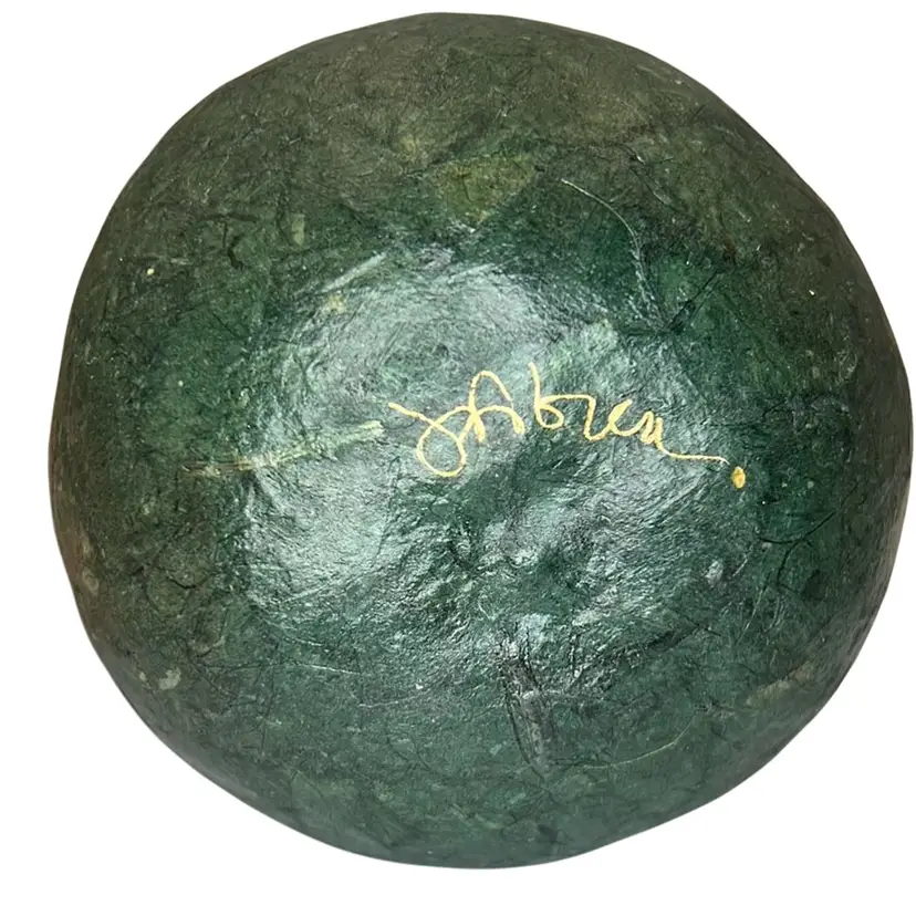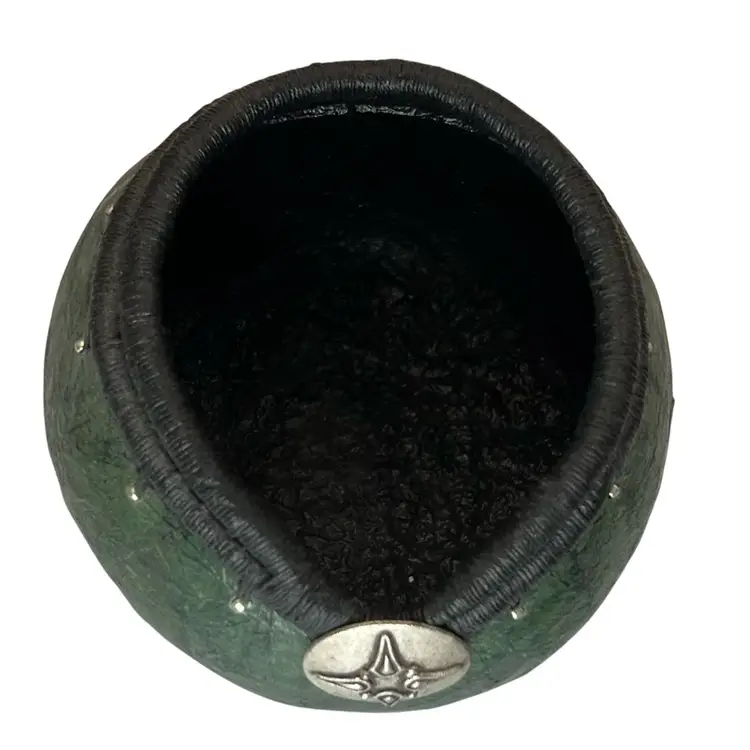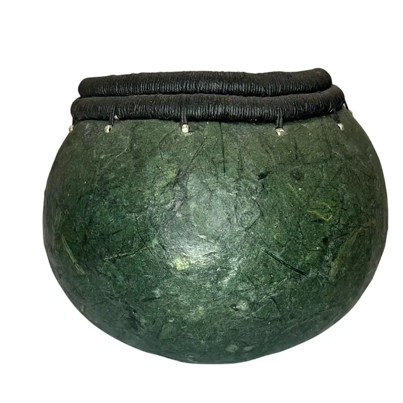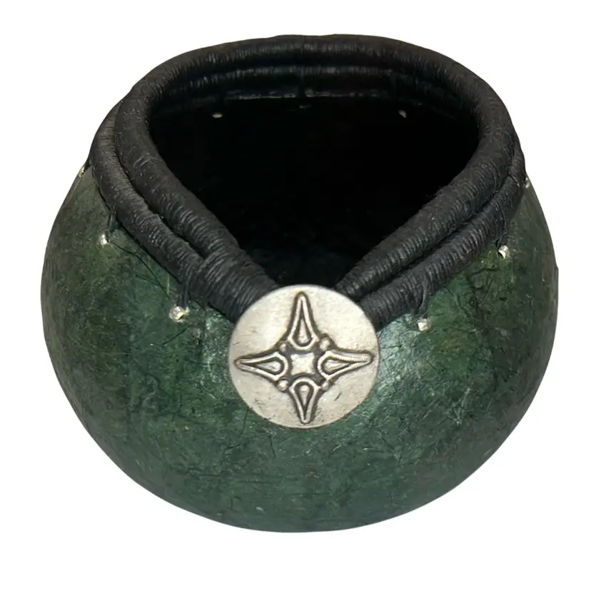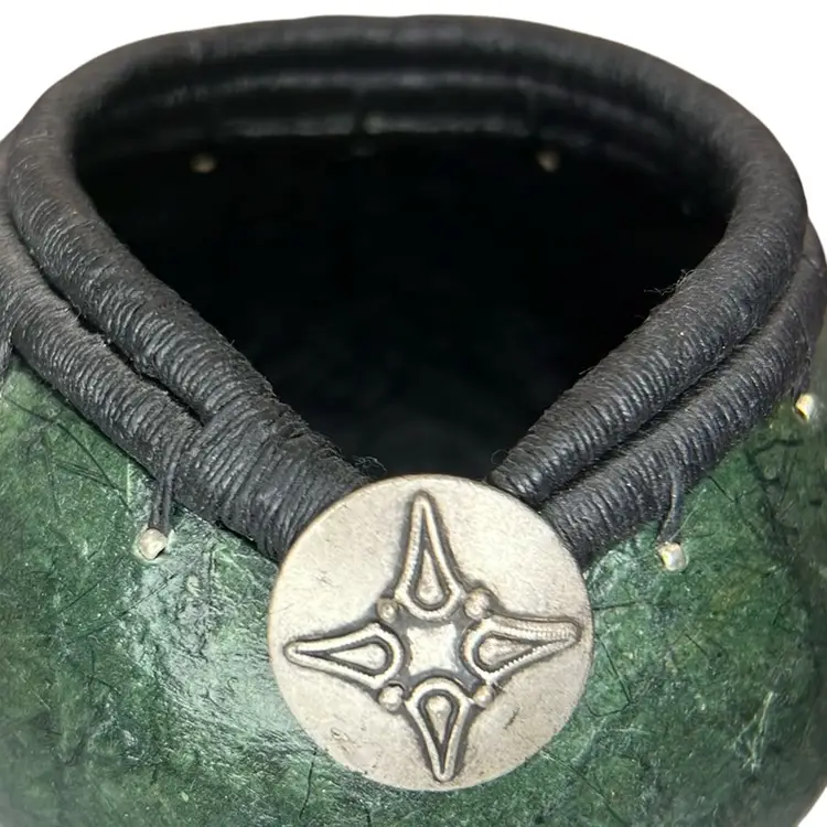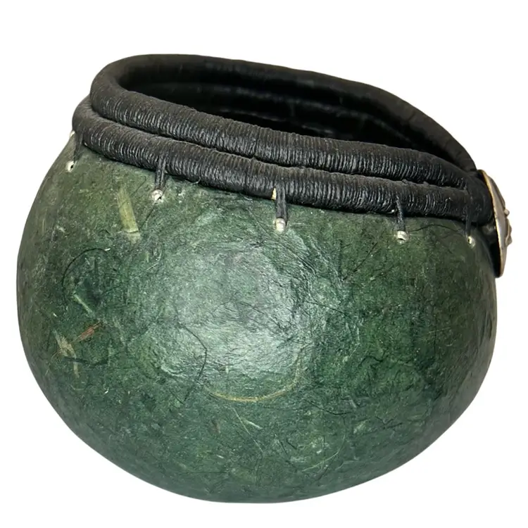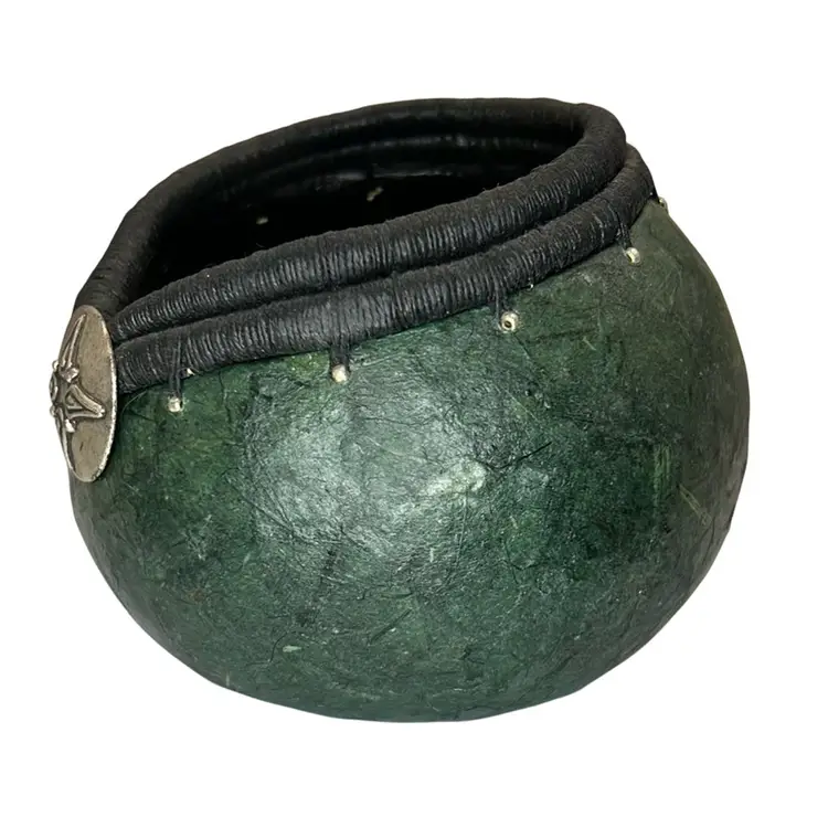 Beautifully made gourd bowl with wrapped edge and silver tone adornments.