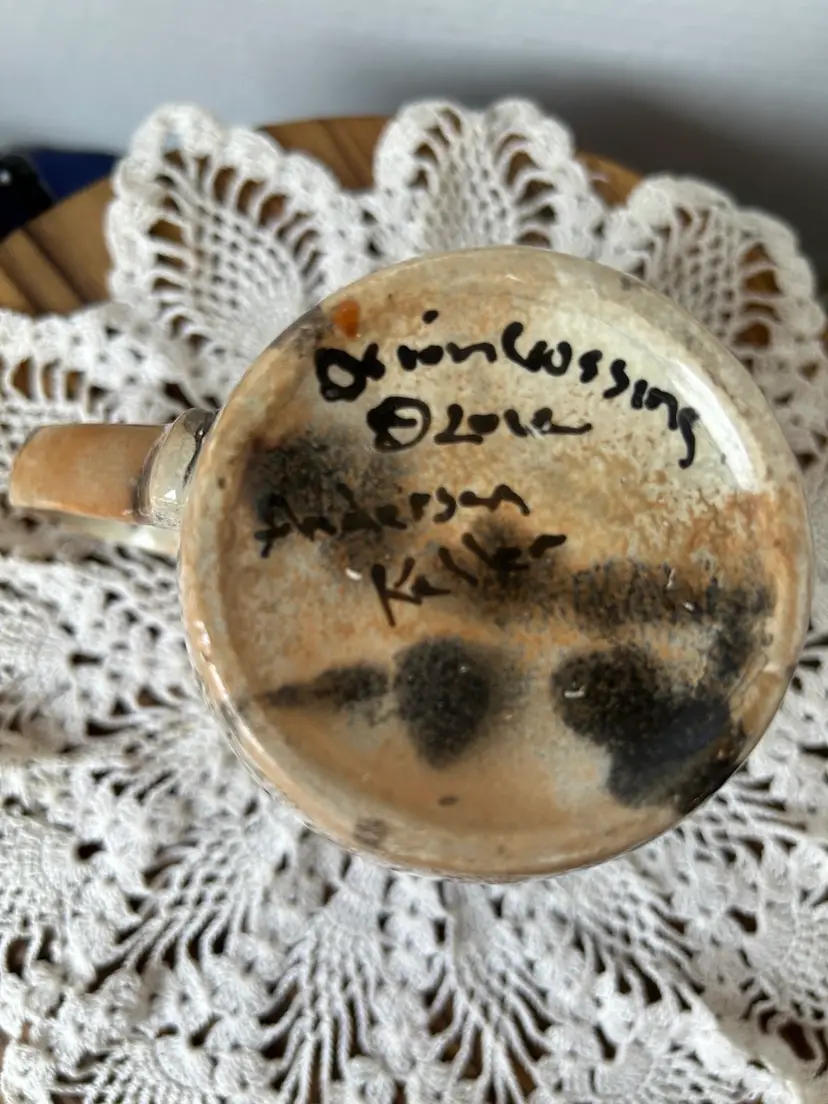 Inspired by Lascaux Caves in France. Orion Crossing Fine Art is owned by Cynthia Andersen and Donna Keller and that’s who signed the bottom. In excellent condition and measures 4.5” tall by 4” across. The glaze is food, dishwasher, and microwave safe.