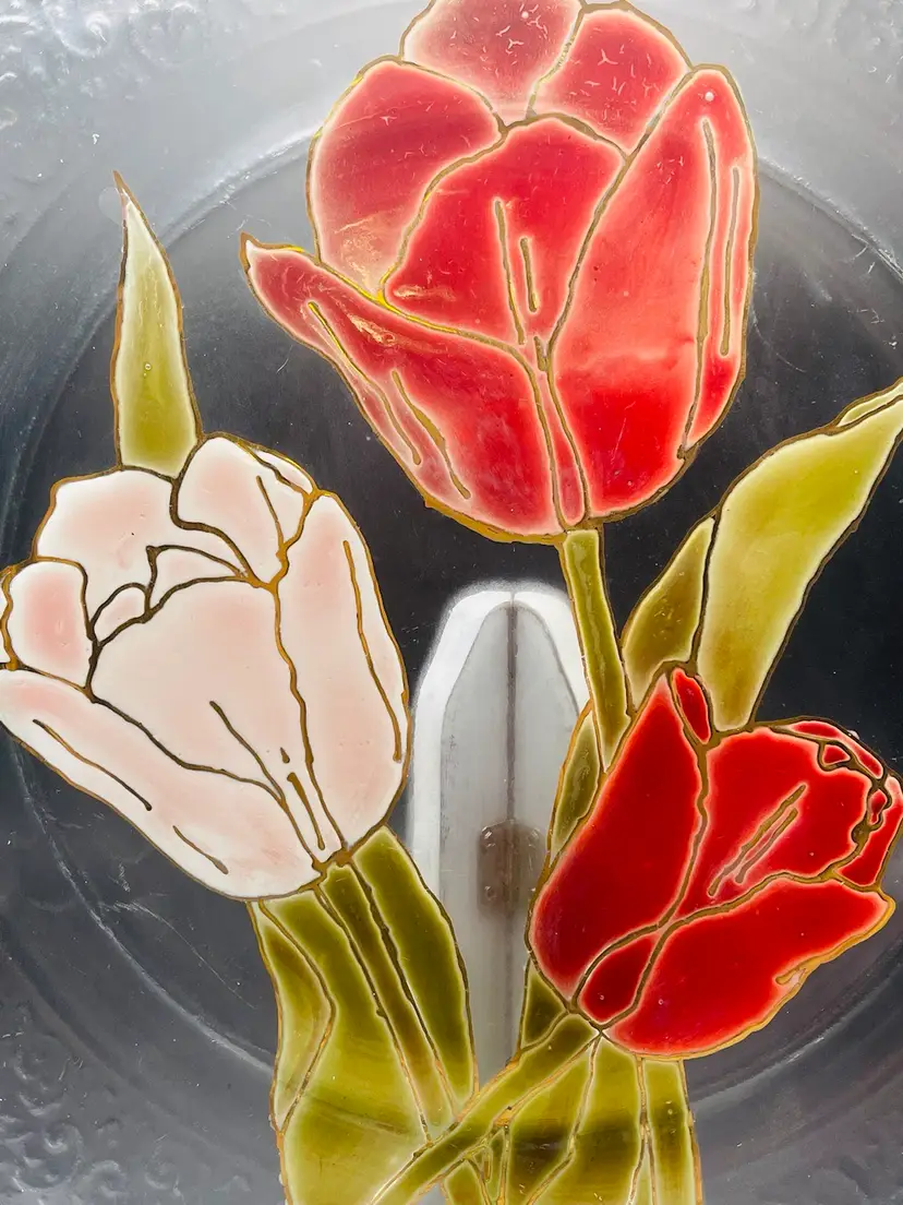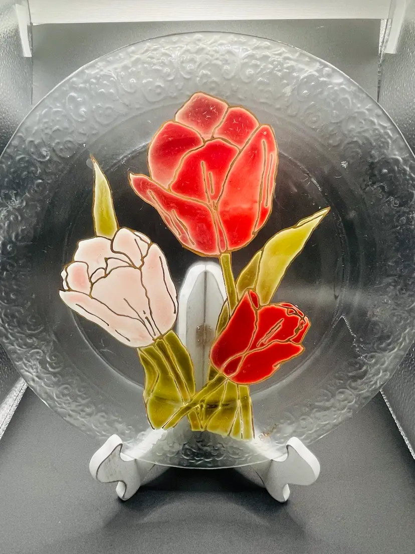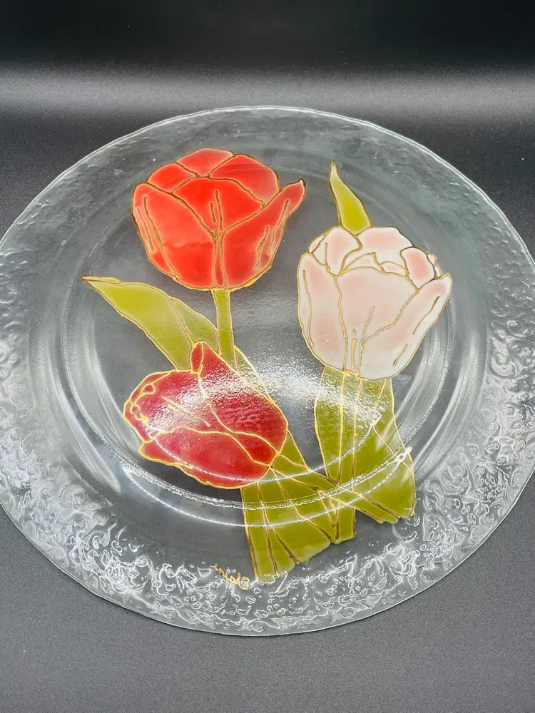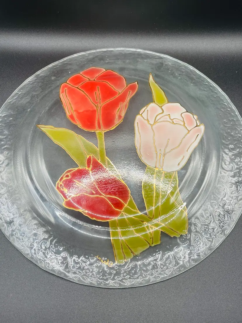 Beautiful, hand painted, decorative plate featuring tulips. This is signed by the artist, and is most likely a vintage hobbyist piece. This measures 12x12, there are no chips or cracks.