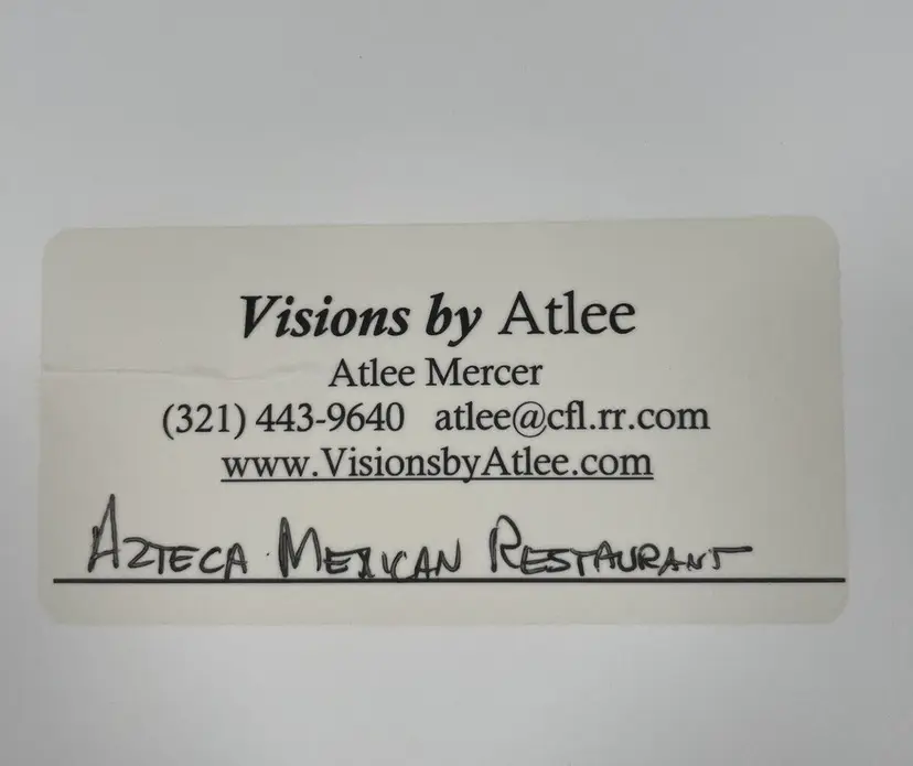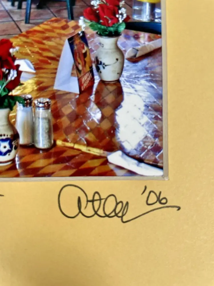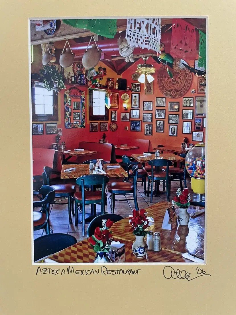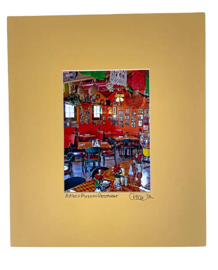 – Signed By: Atlee Mercer – Image Orientation: Portrait – Size: 5 x 7 in – Signed: Yes – Image Color: Color – Title: Azteca Restaurant – Material: Gloss Paper – Framing: Matted – Subject: Mexican Restaurant, Food, Mexican Food, Kissimmee Florida, Spanish – Type: Photograph – Year of Production: 2006 – Photographer: Atlee Mercer – Features: Matted – Finish: Glossy – Culture: Spanish