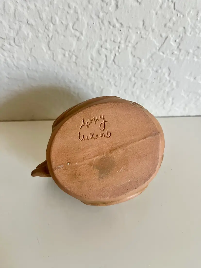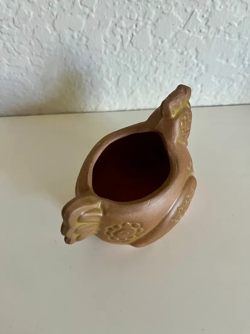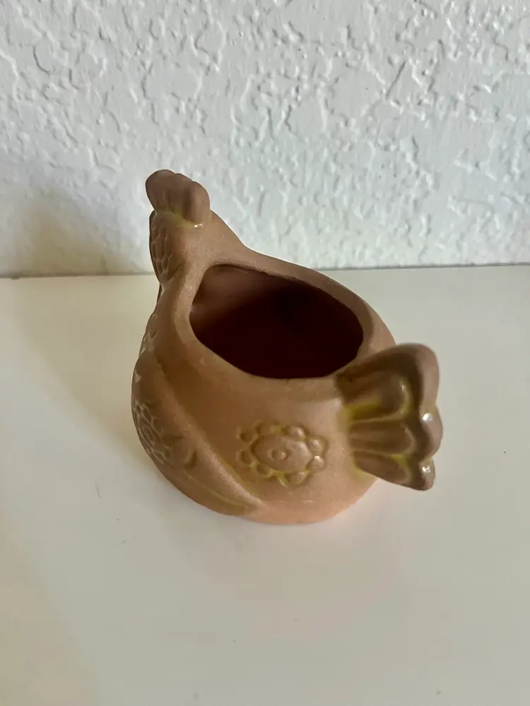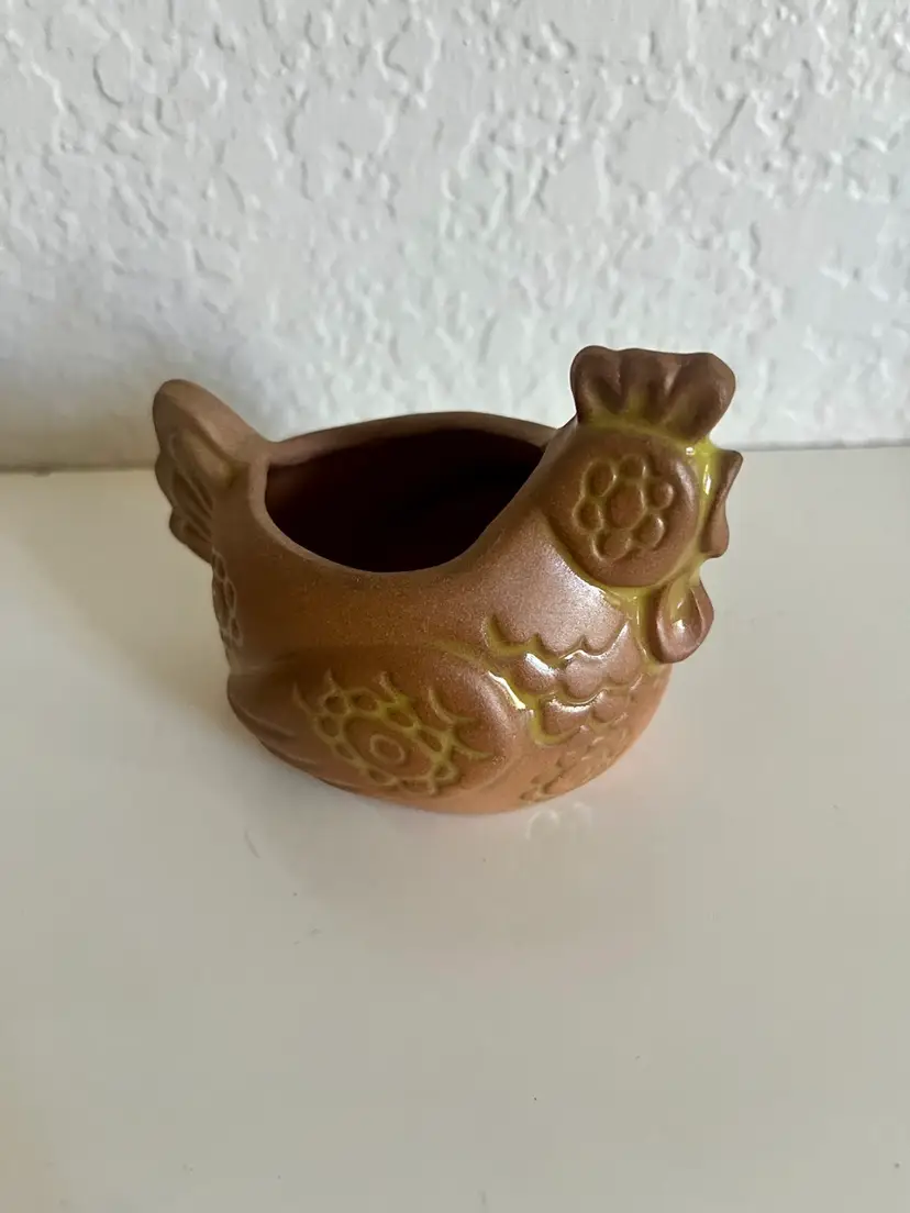 This is a terracotta chicken planter, a decorative pot often used for plants or as a standalone decorative piece. Made from traditional terracotta clay, which is molded and fired for durability. Features an adorable chicken shape, with details like a comb, wattle, and feather patterns. Purpose: Primarily used as a planter for succulents, herbs, or other small plants, but can also serve as a decorative piece. Artist signed. Measures 3”x4” No chips or cracks