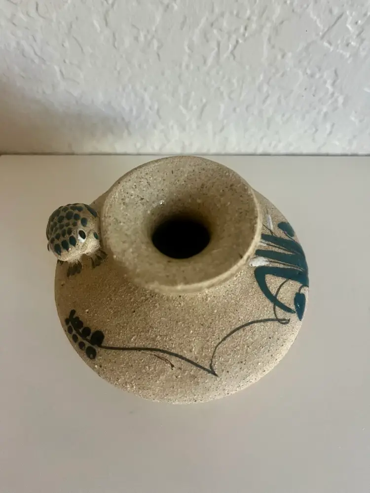 Vintage Tonala Mexican pottery bud vase featuring a hand-painted and sculpted frog.