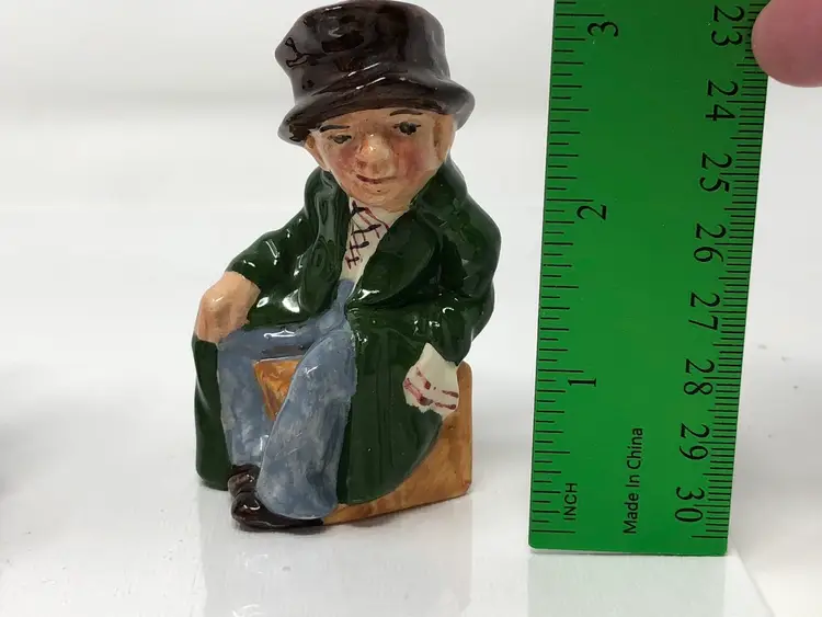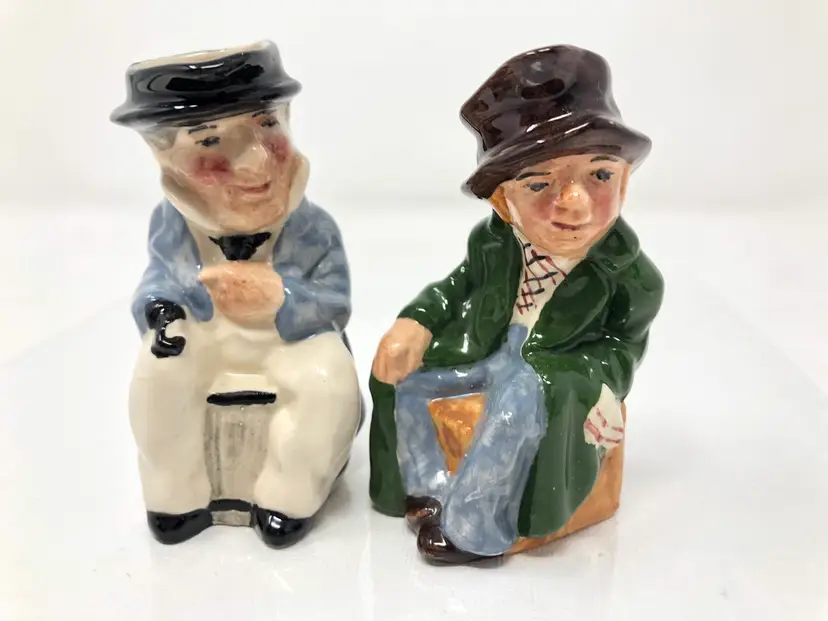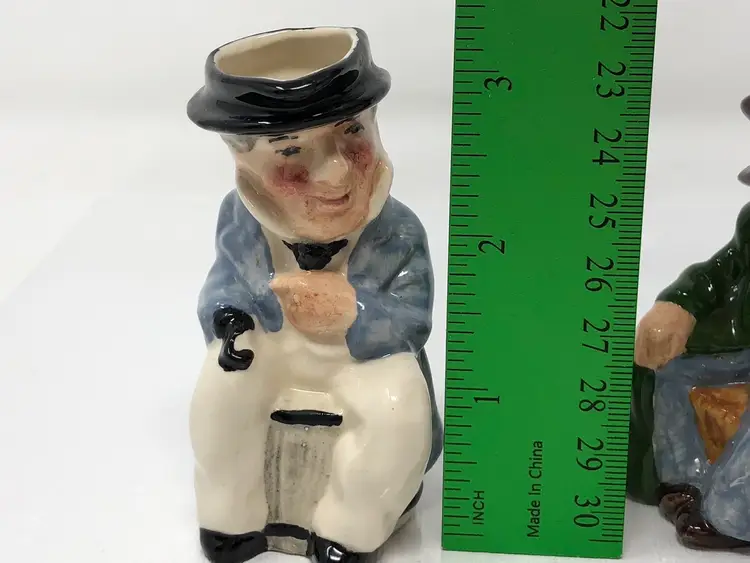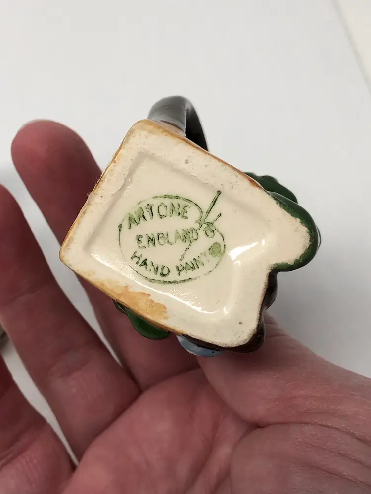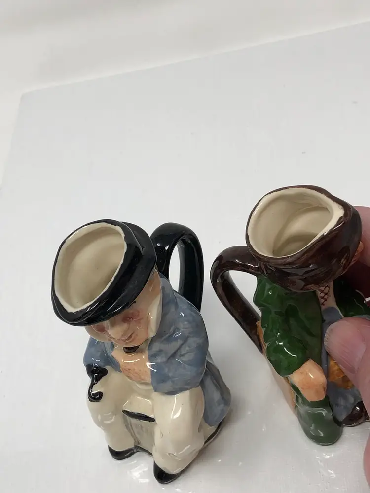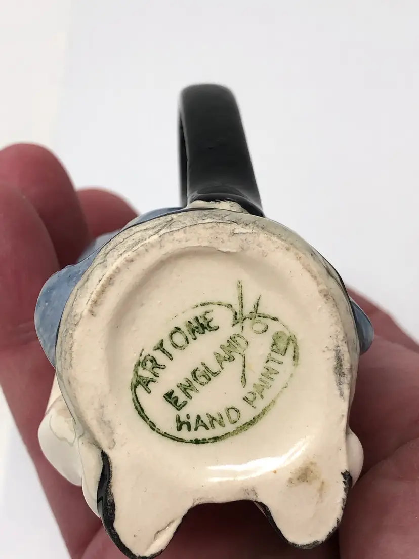 Set of 2 Artone England hand painted mini jugs or creamers representing Dickens characters Captain Cuttle and the Artful Dodger. Both stamped Artone England on the base. No chips or cracks.