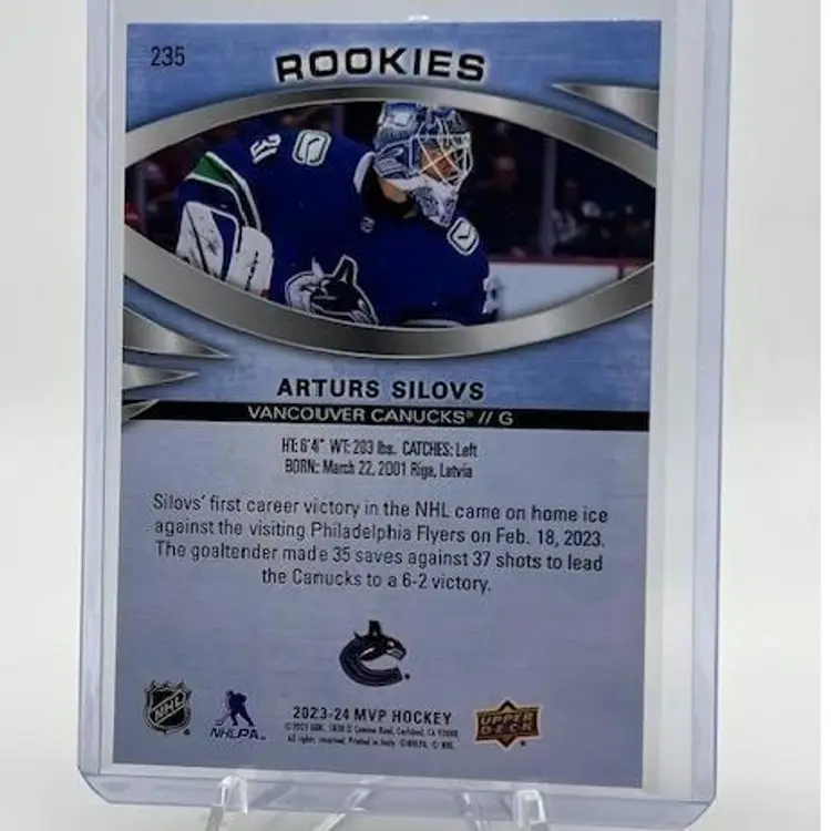 Arturs Silovs 2023-2024 Upper Deck MVP Hockey Rookie SP RC Vancouver Canucks. Shipping is $1 for the first card, +$0.50 for additional cards, and ships PWE within 1-2 days.