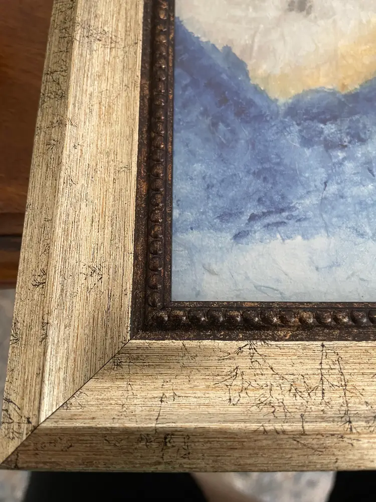 Original Artwork of Moon over Mountains 5 x 7 art Framed in gold tone frame with easel backing (outside measurement is 7 1/2" X 9 1/2') Glass insert Acrylic paint. Mulberry paper on canvas board. Cobalt blues, gold color. Moon is gold leaf.