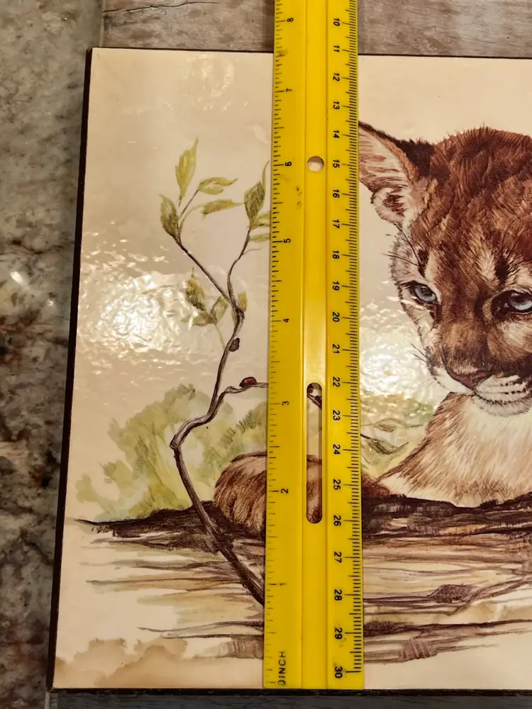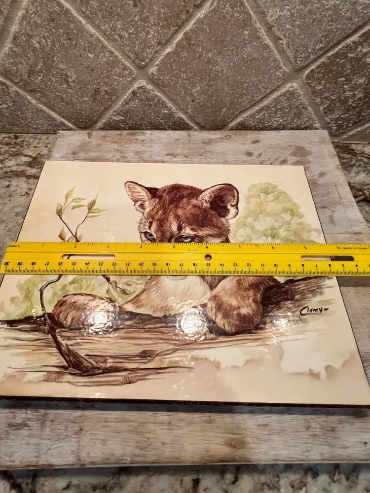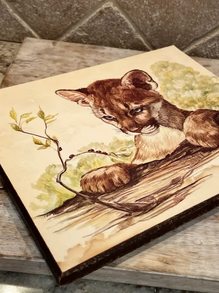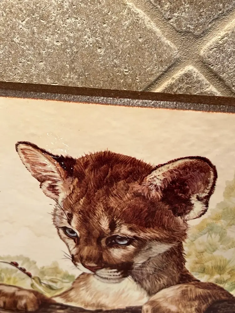The print is part of a series of wild cat cub lithographs. It is a wonderful vintage condition with slight wire to the corners of the wood. Please see pictures.