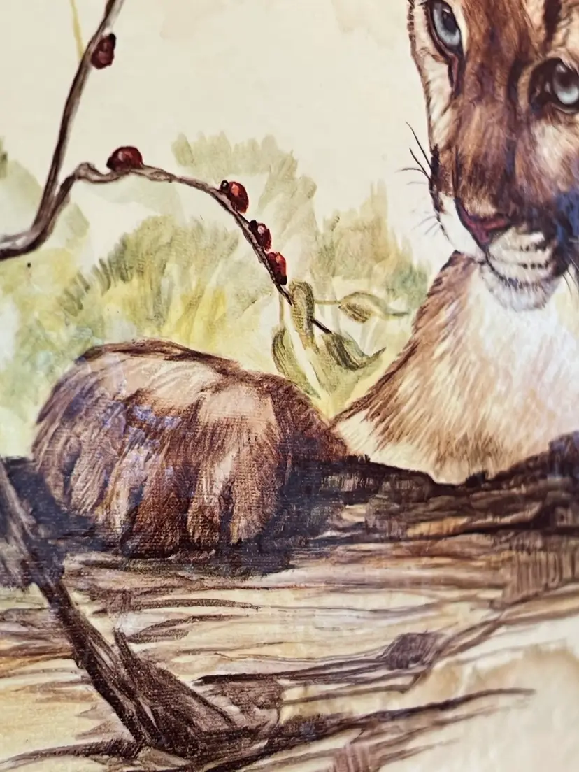 Vintage artwork by artist Clancy Cherry titled "Cougar and Ladybug" featuring a young puma cub.