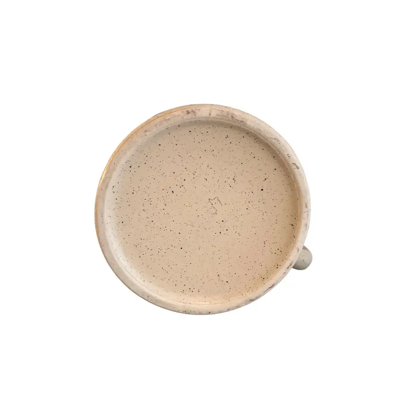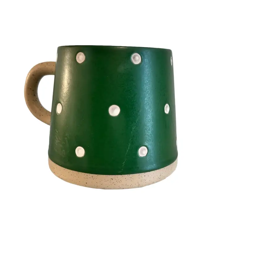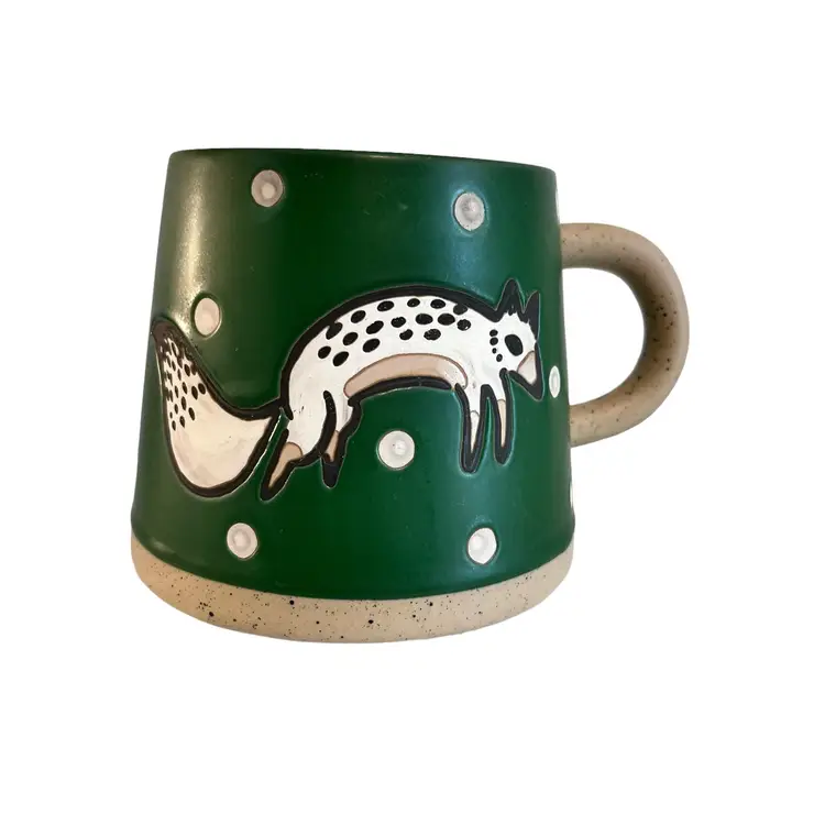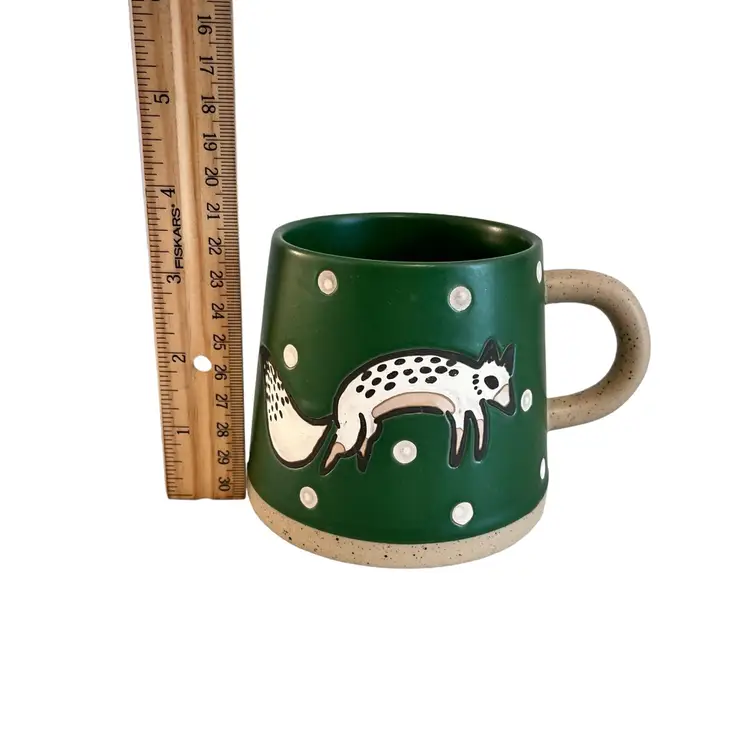 Arwen Handled Pottery Coffee Mug Green with White Polka Dots and Image of Fox. This is a pre-owned item in excellent condition.